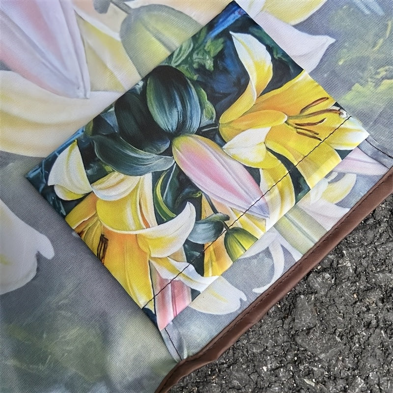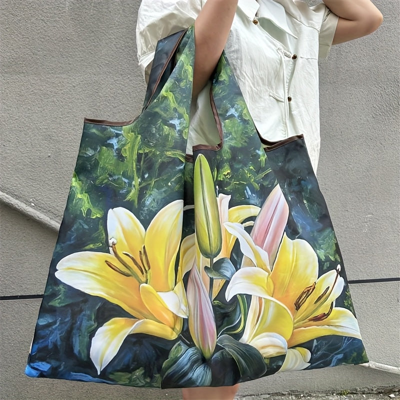 Large Capacity Foldable Polyester Tote Bag with Elegant Lily Print, Wristlet Accessory, Hand Washable - Ideal for Gym, Shopping, and Guangzhou Crafting - Stylish Green Floral Design, Shopping Bag