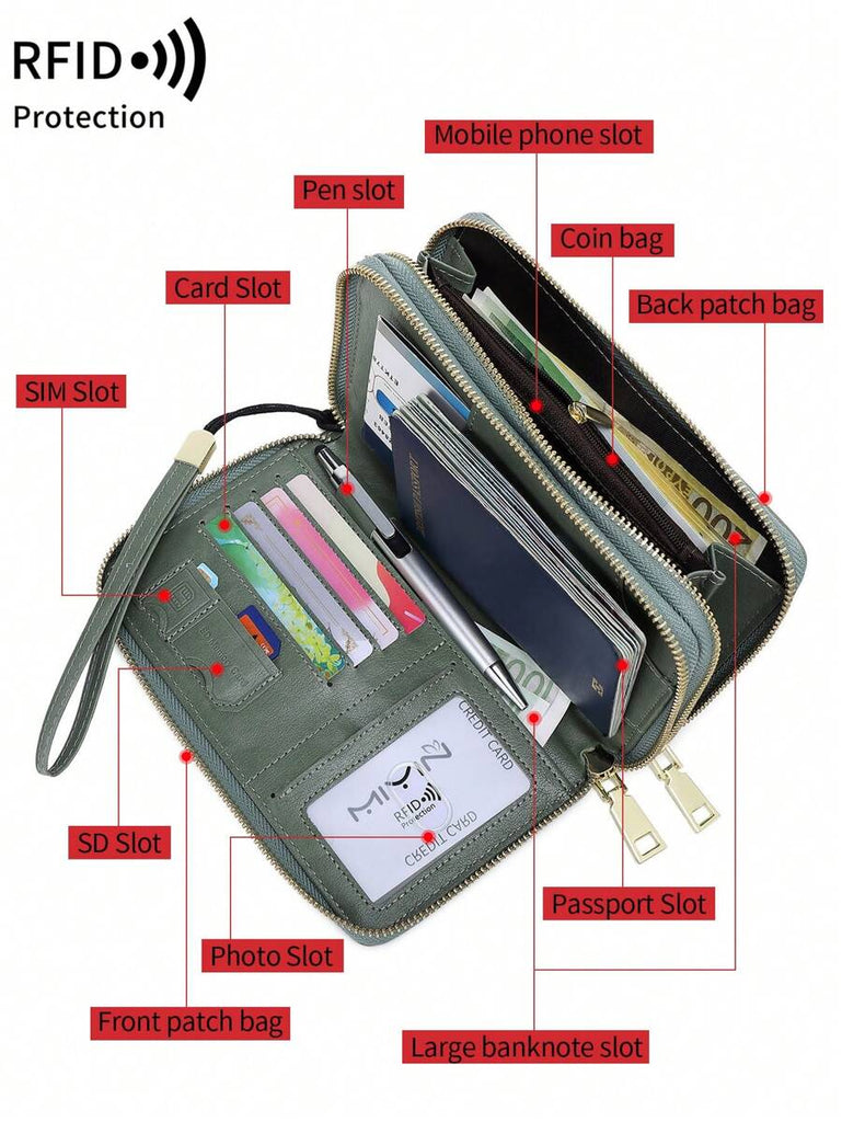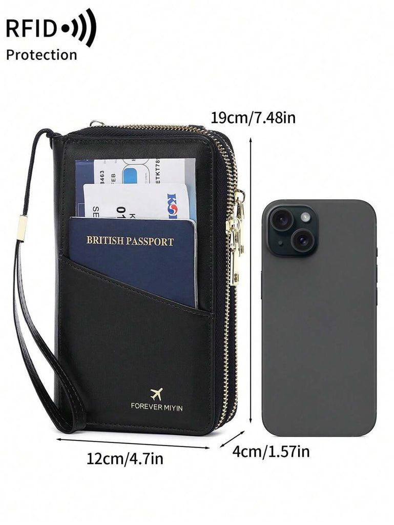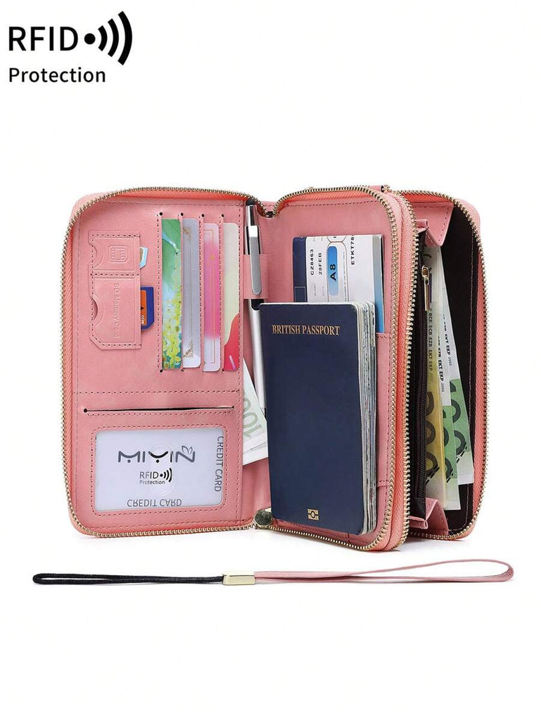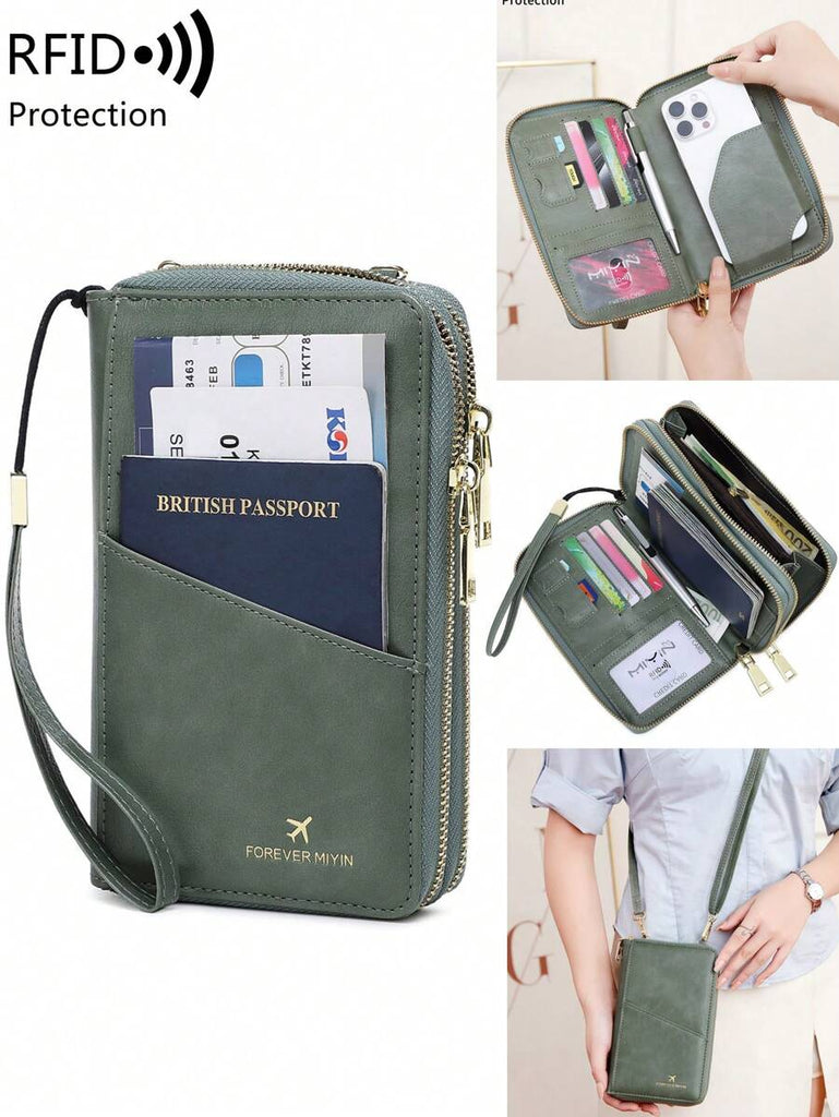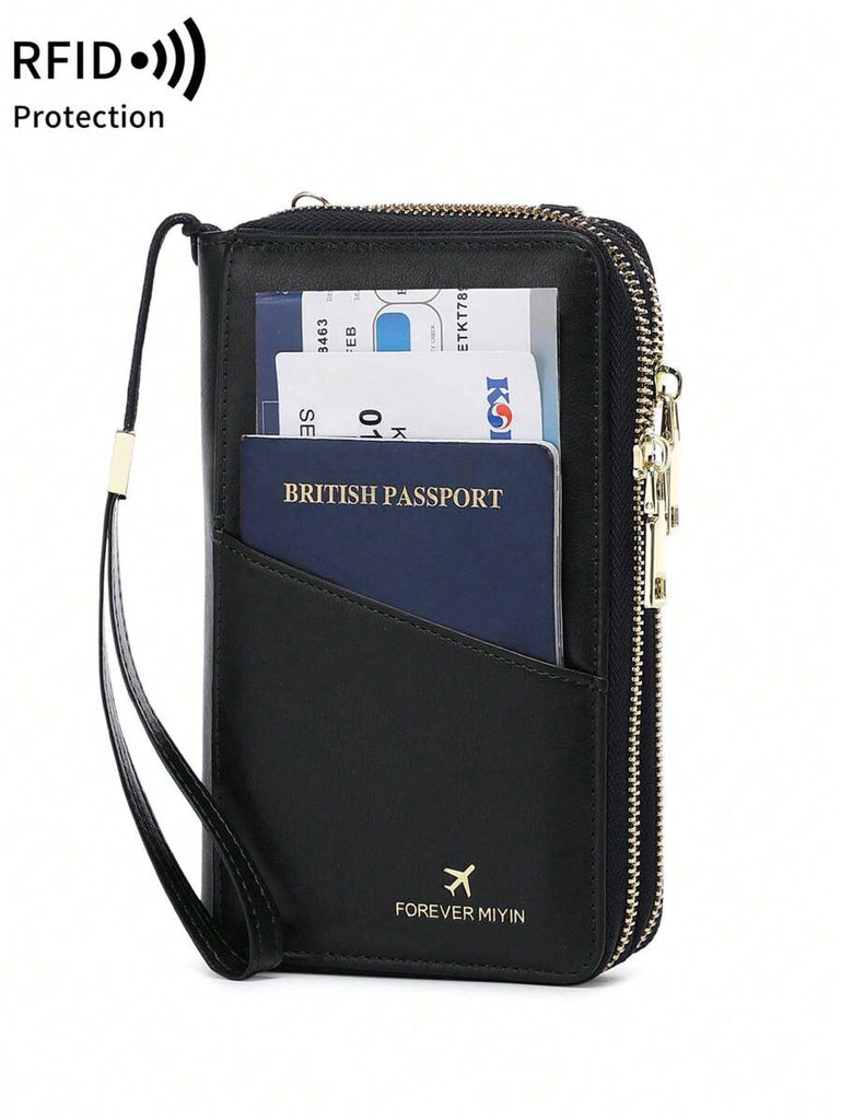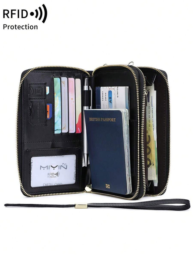 MIYIN Fashionable Dual-Zipper Large Capacity RFID Blocking Passport Holder Credit Card Holder For Men And Woman With Wrist Strap And Adjustable Shoulder Strap Multifunction Travel Wallet Phone Wallet Passport Case For Credit Card/ ID Card/ Tickets/ Cash/P