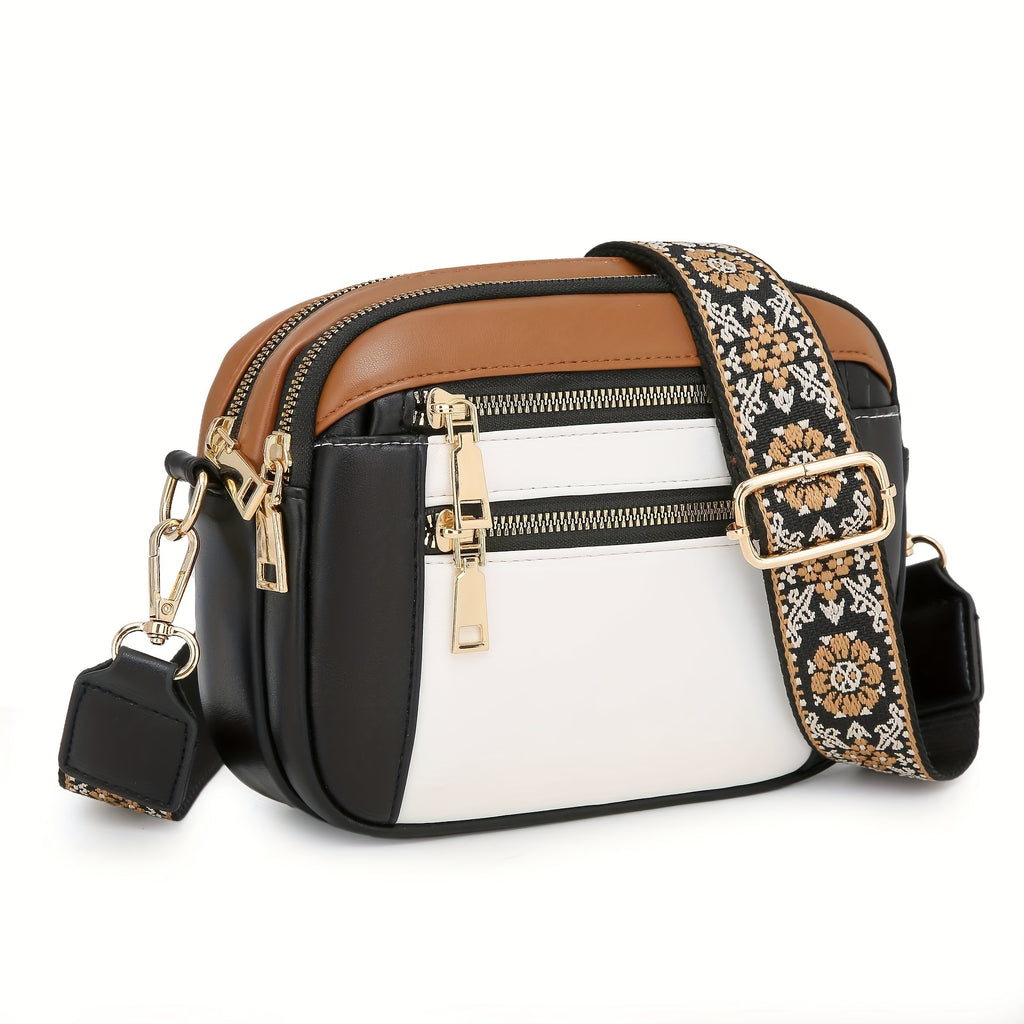 Stylish Women's Crossbody Purse - Small Two-Tone Shoulder Bag with Adjustable Floral Strap, Golden-Tone Hardware & Multi-Compartment Zipper Closure, Perfect for Casual Everyday Use, Cute Purse