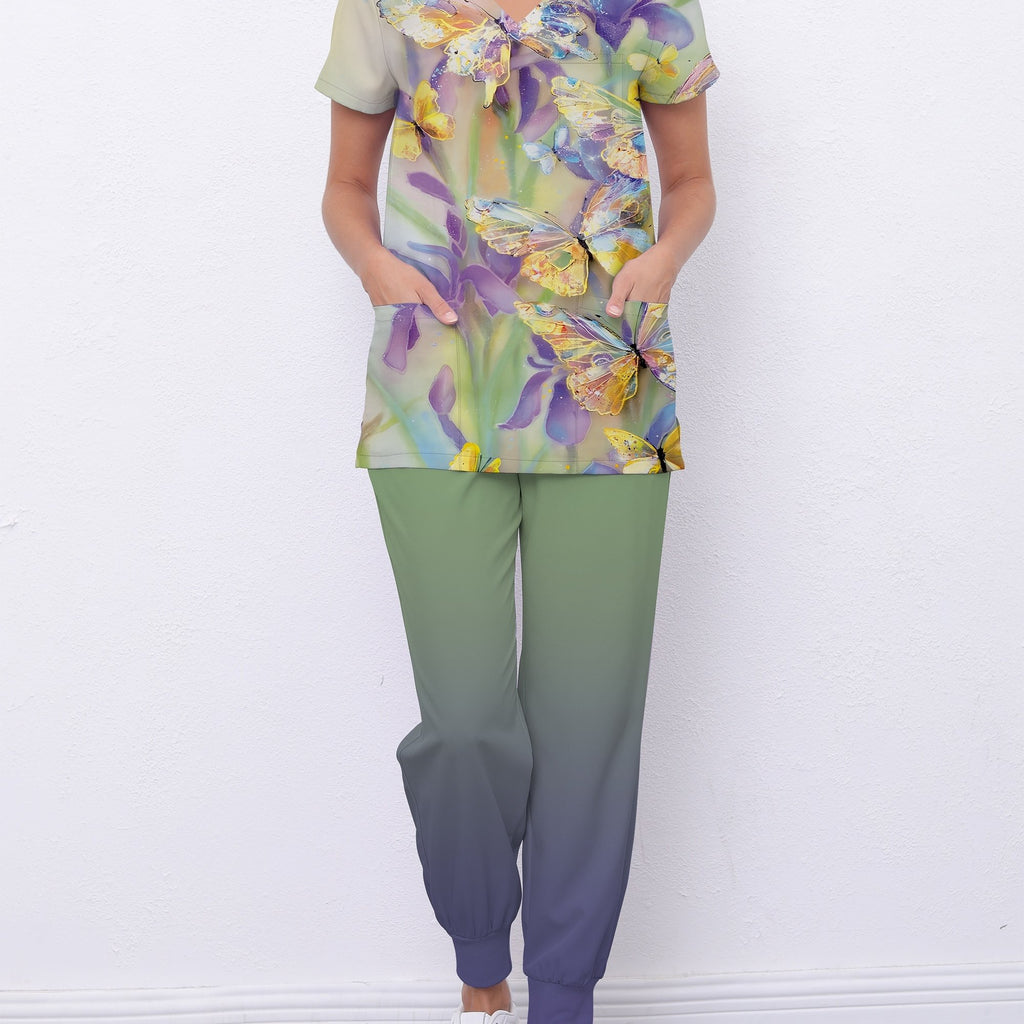 Butterfly Print 2pcs Modern Scrub Set, V-Neck 2 Pockets Scrub Top Elastic Waist Scrub Bottoms, Breathable & Comfortable Health Care Uniform For Doctor, Nurse, Physician, Dentist, Women's Work Clothing