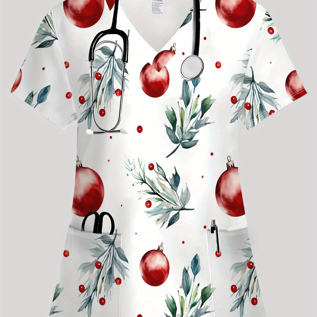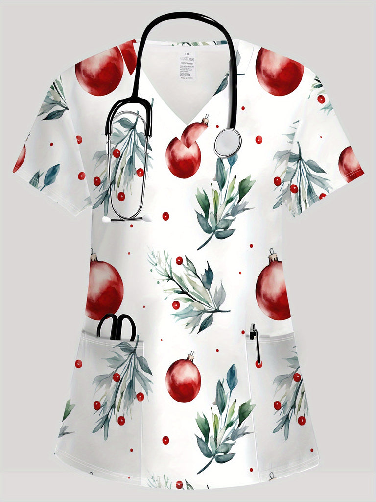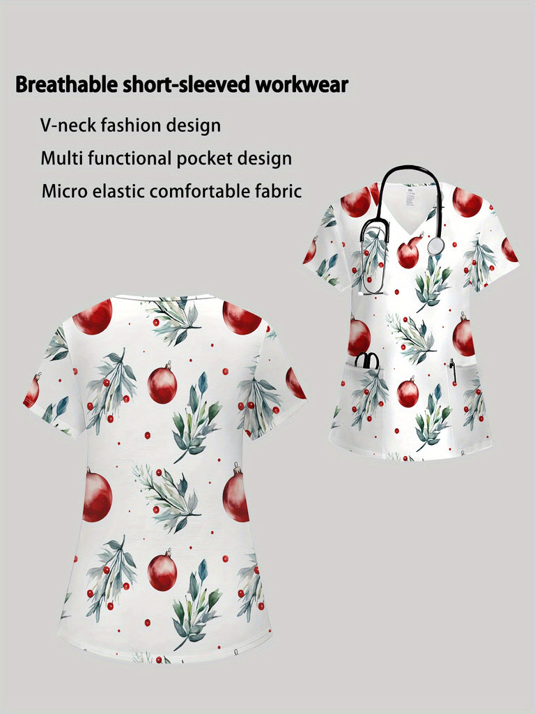 Plus Size, Women's Plus Size Nurse Scrub Top - Christmas Floral print with Red Apples, Stretchy V-Neck Nursing Shirt, Side Pockets - Work Holiday Party Outfit - Machine Washable Polyester Uniform, Nurse Shirts