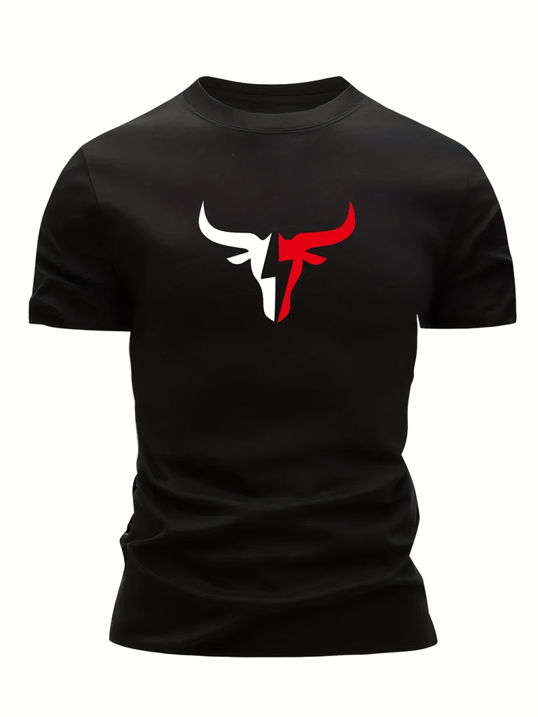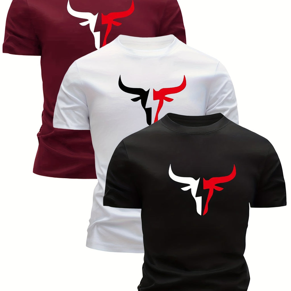 [3pcs Men's T-Shirt] 3pcs Mixed Print Bull Head Pattern Men's Ultra-Lightweight Round Neck T-Shirt