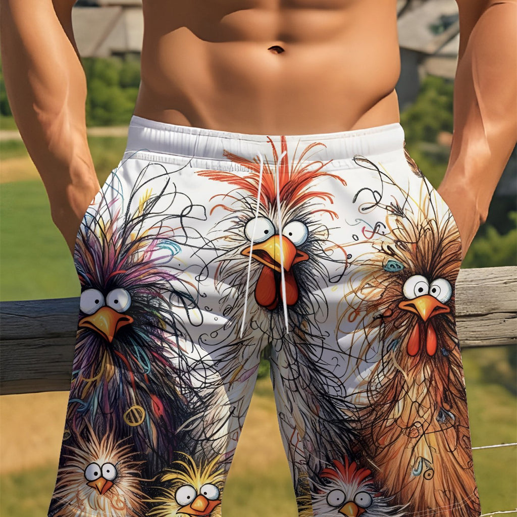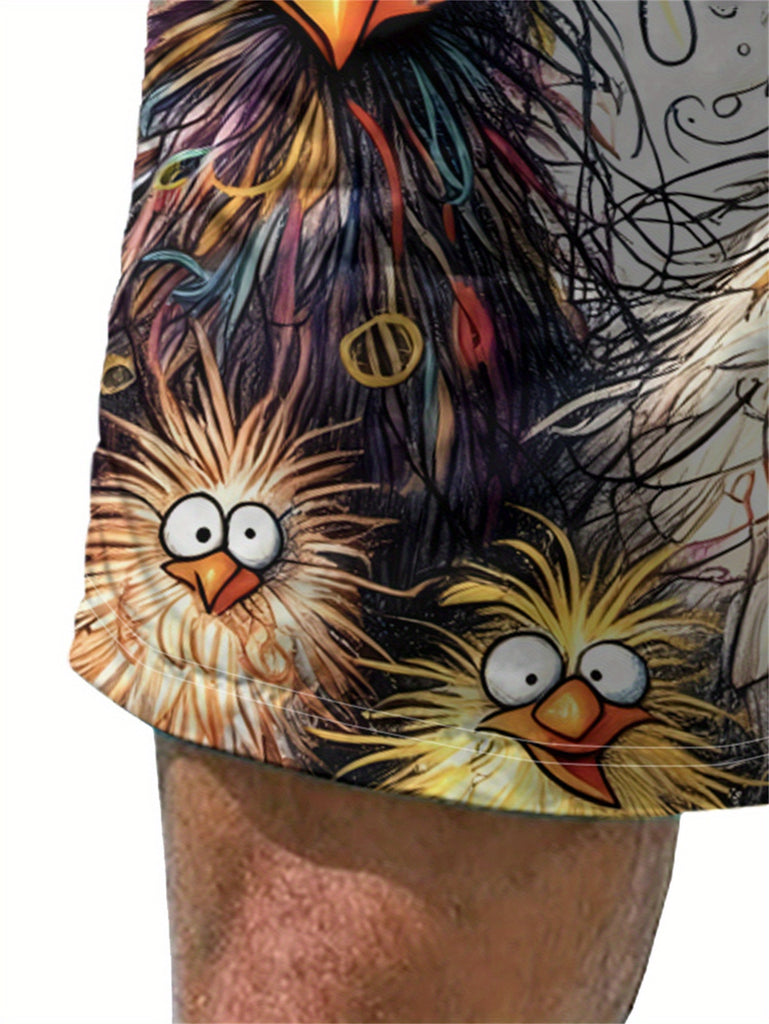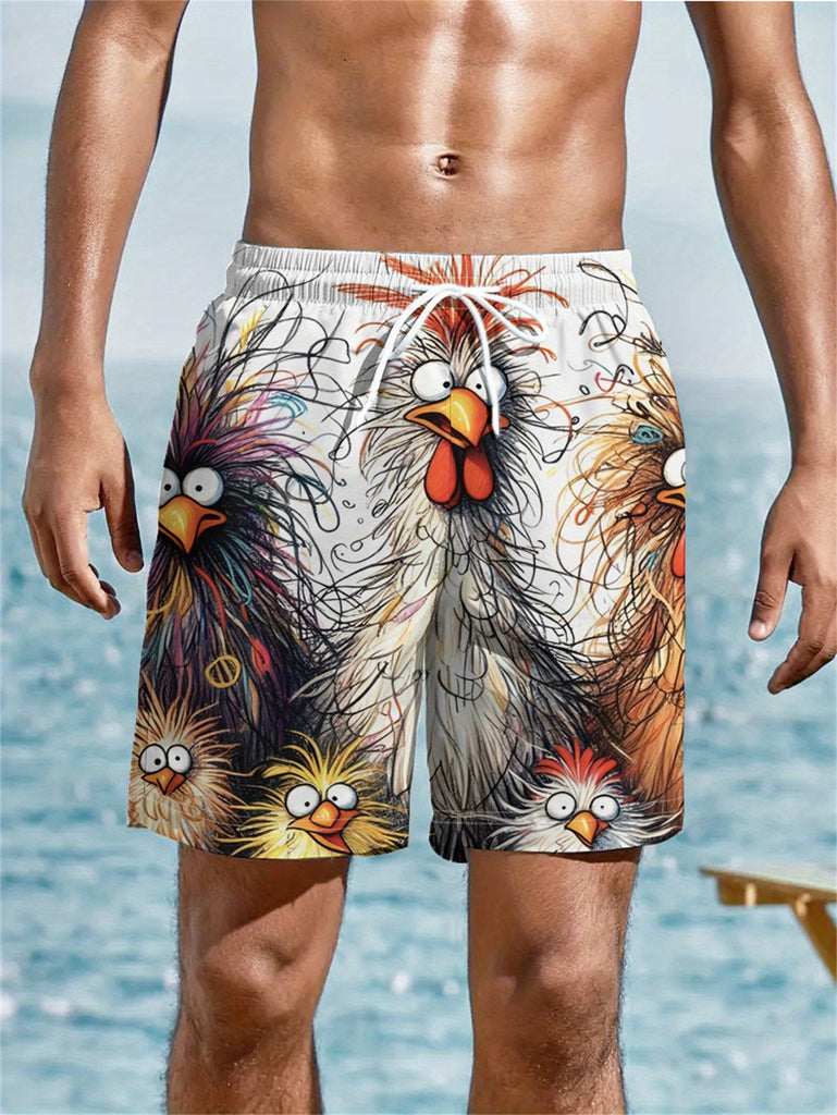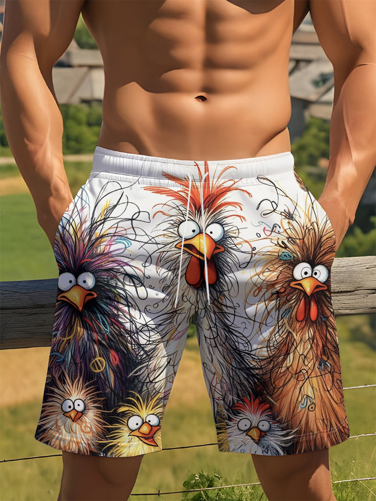 Men's Casual Rooster Print Shorts - Elastic Waistband, Drawstring, Lightweight Polyester, Machine Washable, White with Colorful Rooster Design