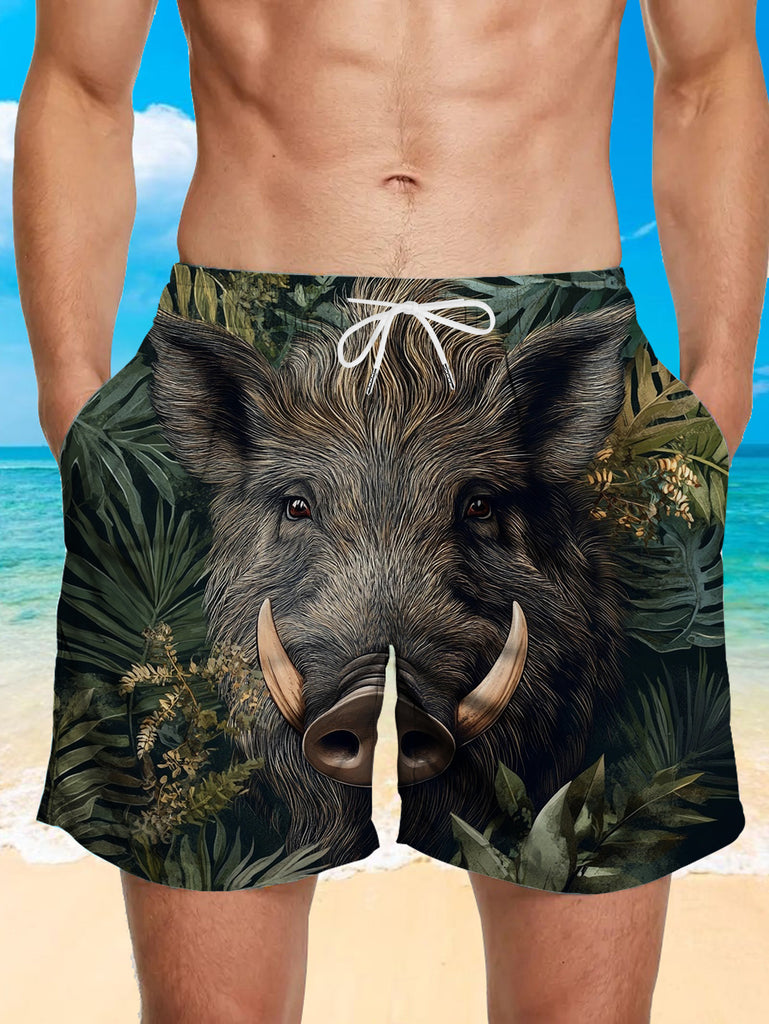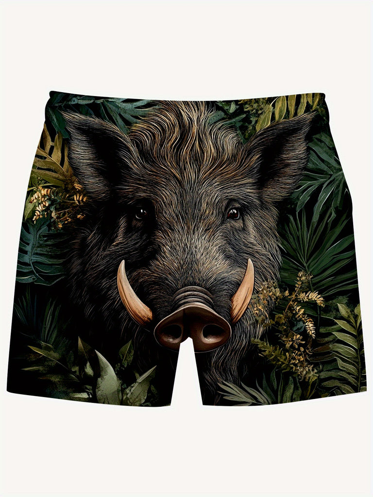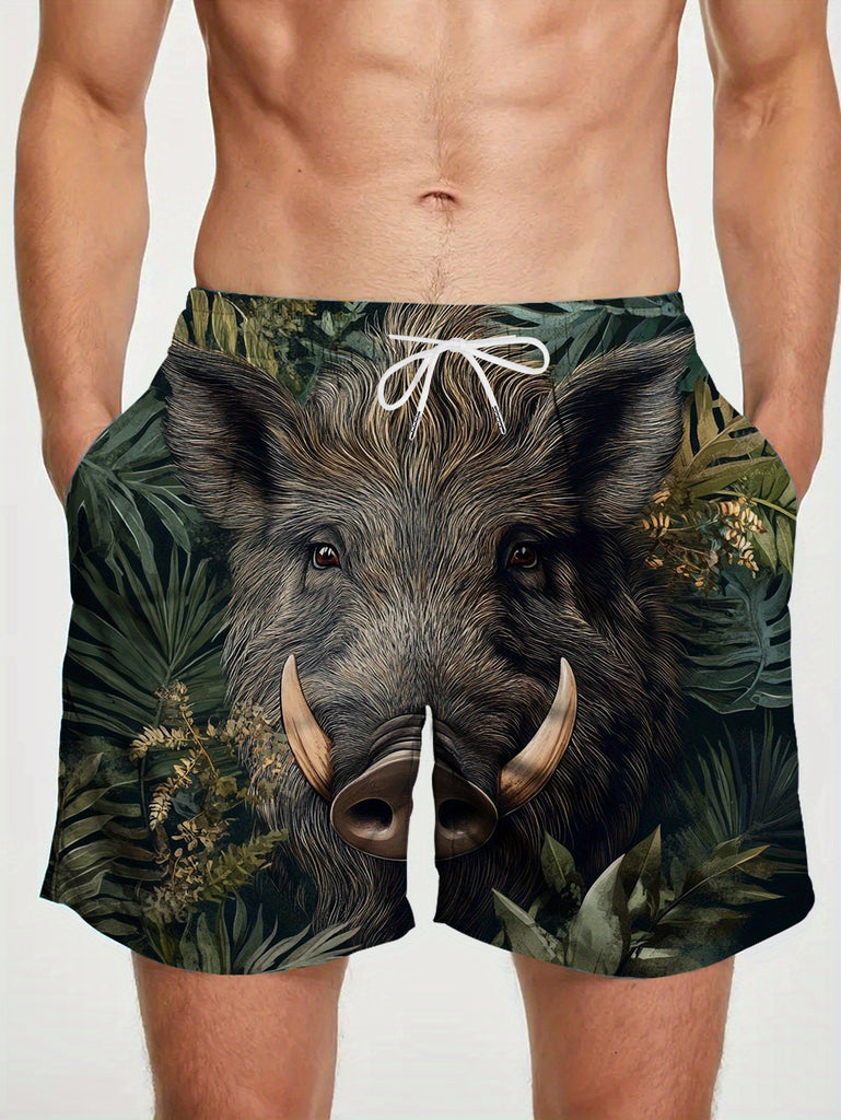 Men'S "Wild Boar" Print Swim Shorts - Quick-Dry, Breathable Beach Shorts with Drawstring Waist, Perfect for Summer Vacation and Water Activities, Beach Shorts|Boar Print Shorts|Quickdry Fabric