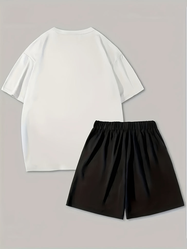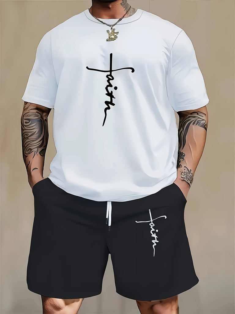 Cross Pattern English Print White Clothes Black Pants Set Men'S Two-piece Fashion Casual Suit: Spring and Summer Short-sleeved T-shirt and Shorts, Men'S Print Clothing Fashion Suitable for All Seasons, Perfect Choice for Outdoor Activities