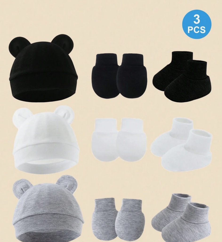 3sets Newborn Baby Black + White + Gray Ear Cap + Anti-Scratch Mittens