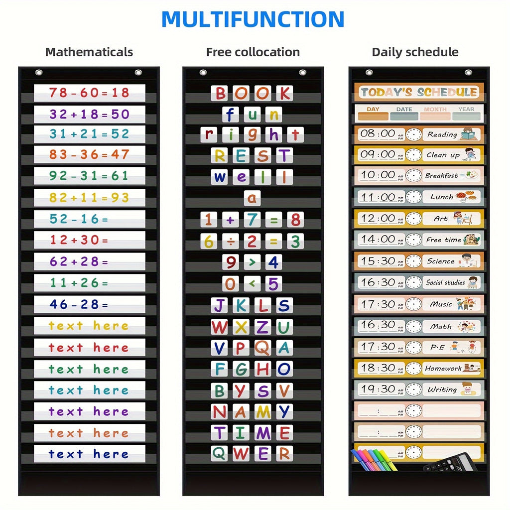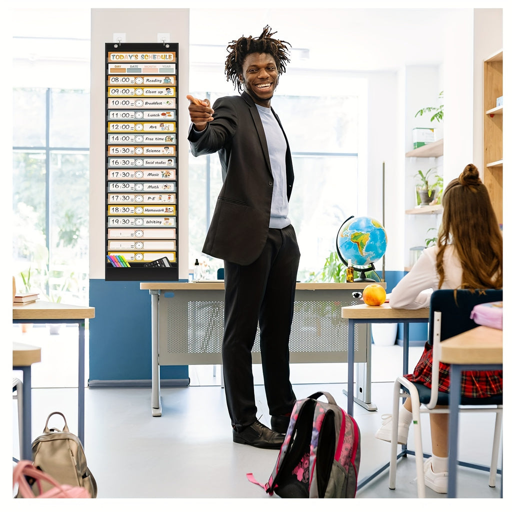 1pc of 18 1 pocket daily schedule, with 30 bohemian double-sided reusable cards, for classroom, office, home, school activities schedule planning chart (black)