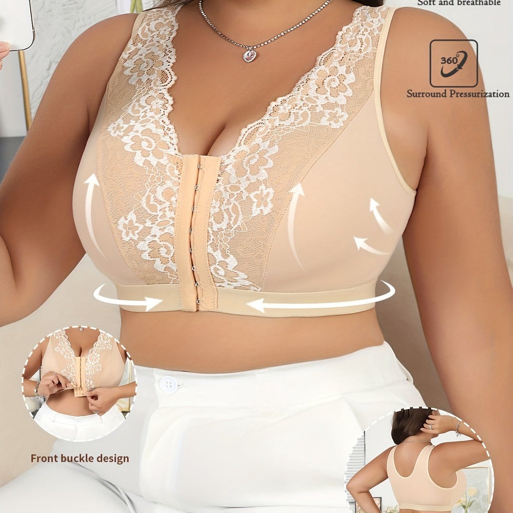 Plus Size Floral Lace Front Closure Bra - Adjustable Straps, No Underwire & No Padding, Soft Beige with Delicate Floral Detailing, Sexy Comfortable Casual Attire, Comfortable Undergarment, Elegant Lingerie Style, Soft Fabric Lingerie, Handwashable Linger