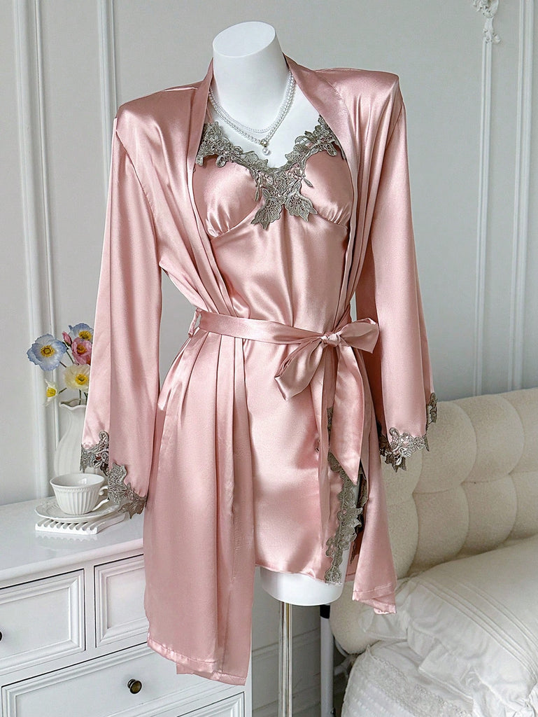 SilkySpell 2pcs/Set Women Pink Sexy Spaghetti Strap Slip Dress, Elegant Long Sleeve Satin Robe Sleepwear Set