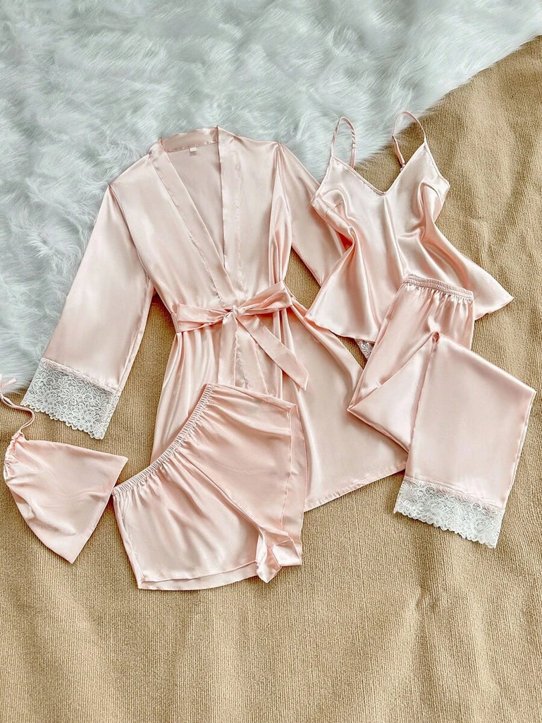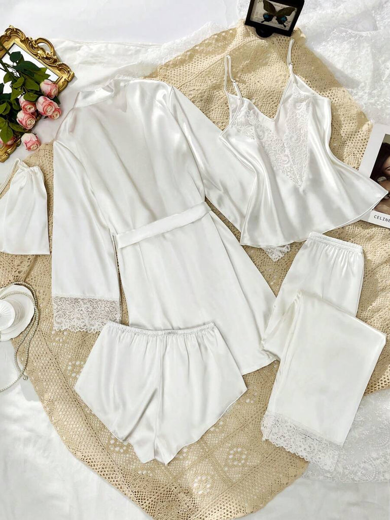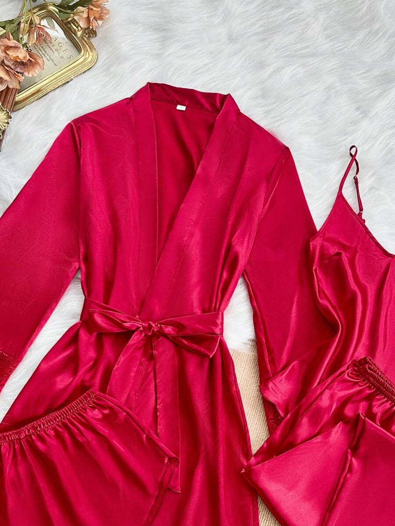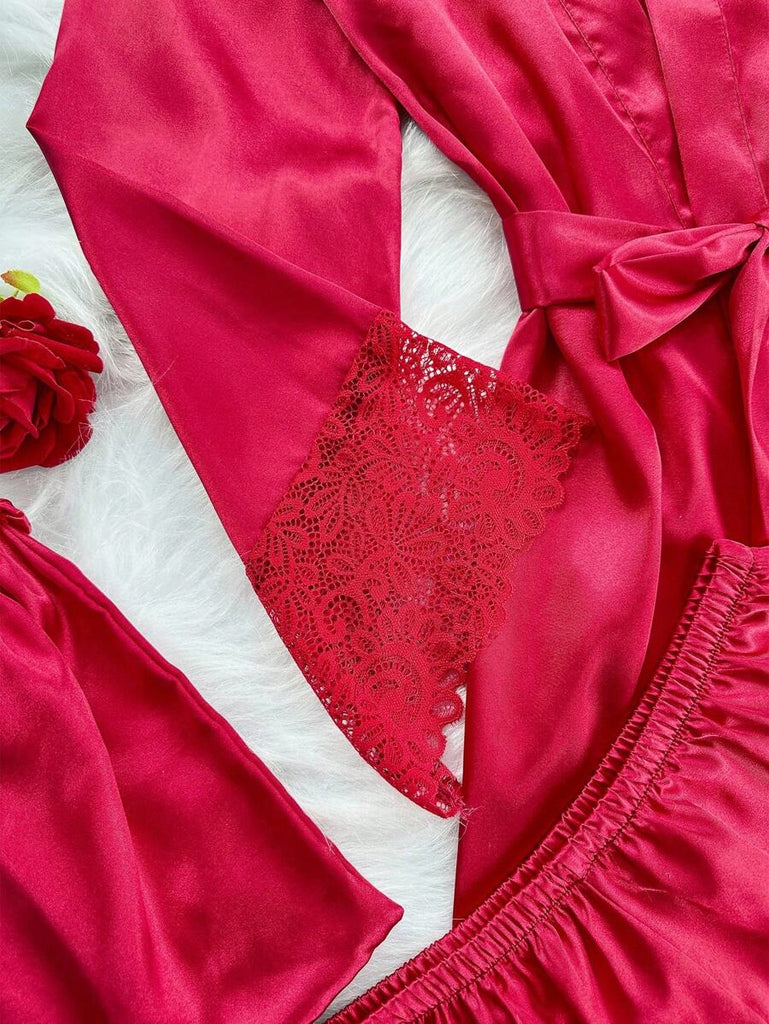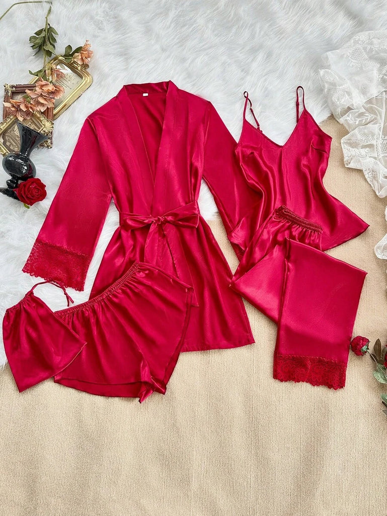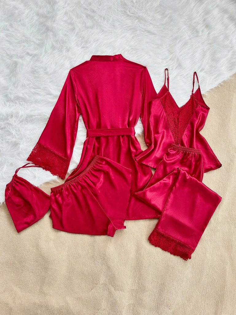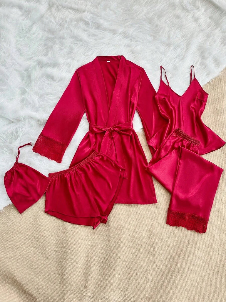 SilkySpell 5pcs Women's Sexy Lace Camisole, Satin Elegant Robe, Pants, Shorts, And Storage Bag Sleepwear Set Red Pajama Set 4 Piece Pajama Set Red Sleepwear Set Satin Pajama Set Lace Trim Pajama Set, Fall Clothes