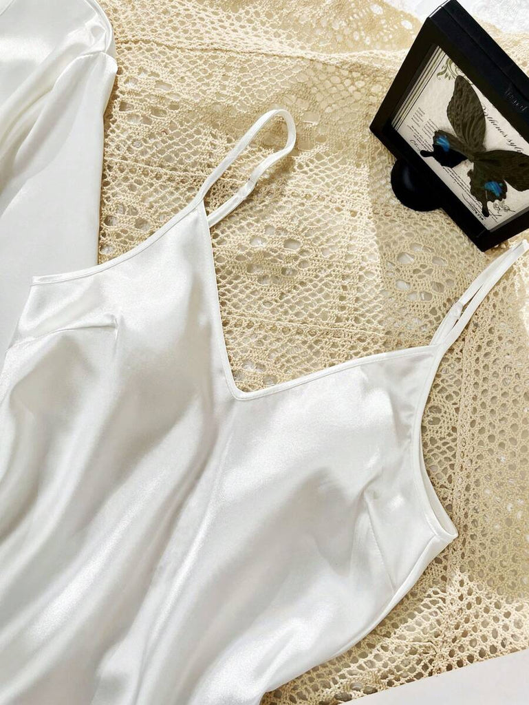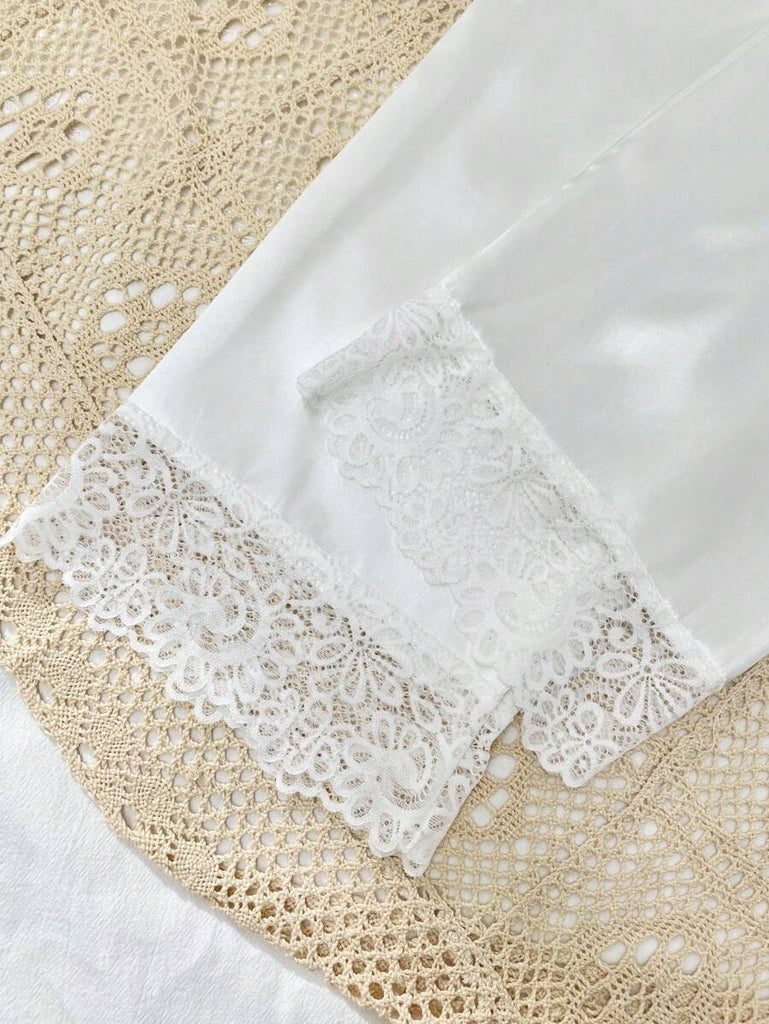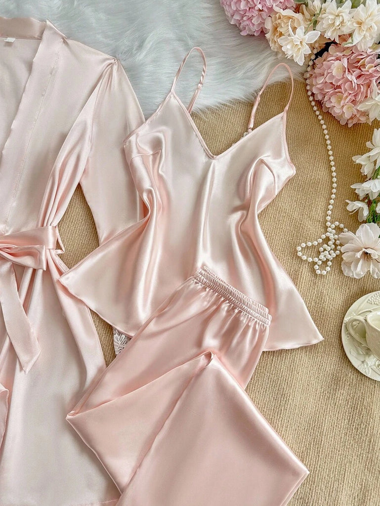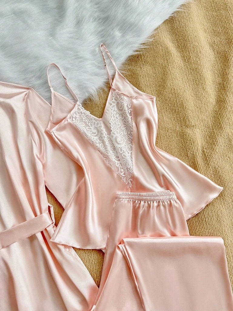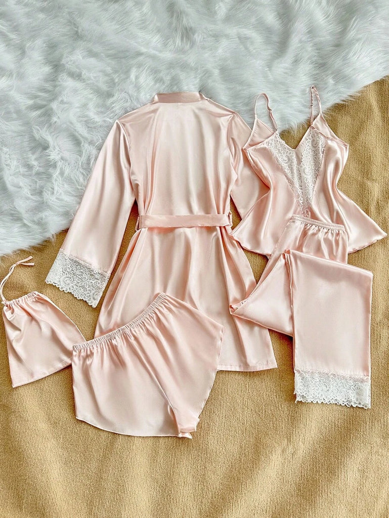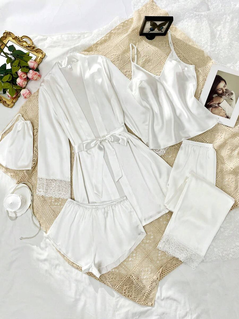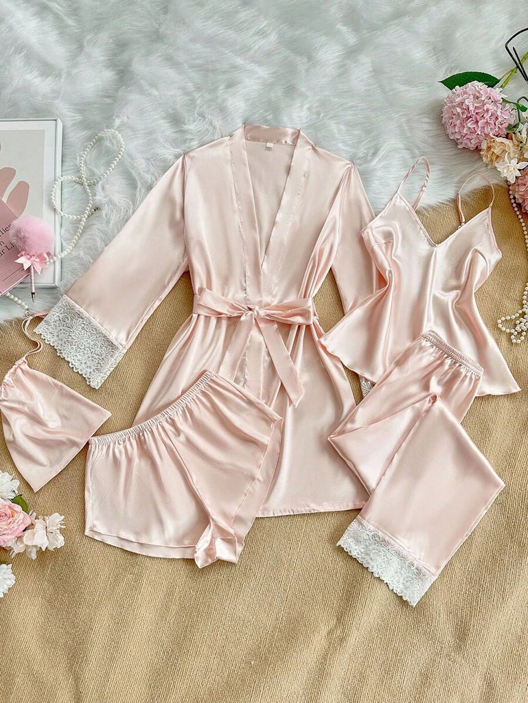 SilkySpell 5pcs Women's Sexy Lace Camisole, Satin Elegant Robe, Pants, Shorts, And Storage Bag Sleepwear Set Red Pajama Set 4 Piece Pajama Set Red Sleepwear Set Satin Pajama Set Lace Trim Pajama Set, Fall Clothes