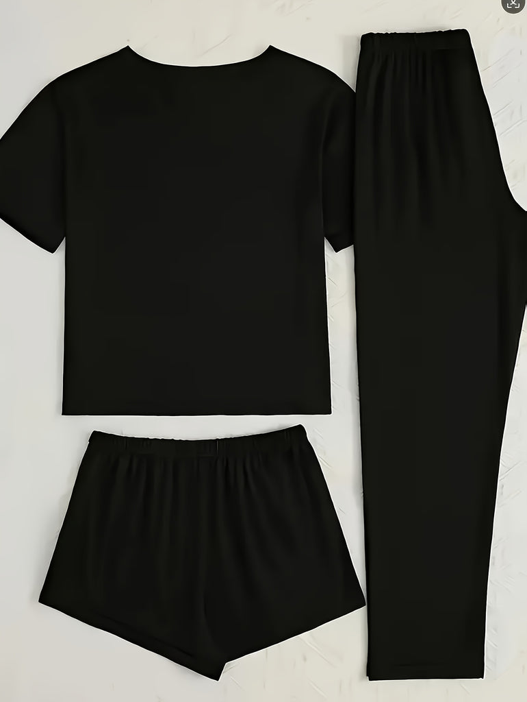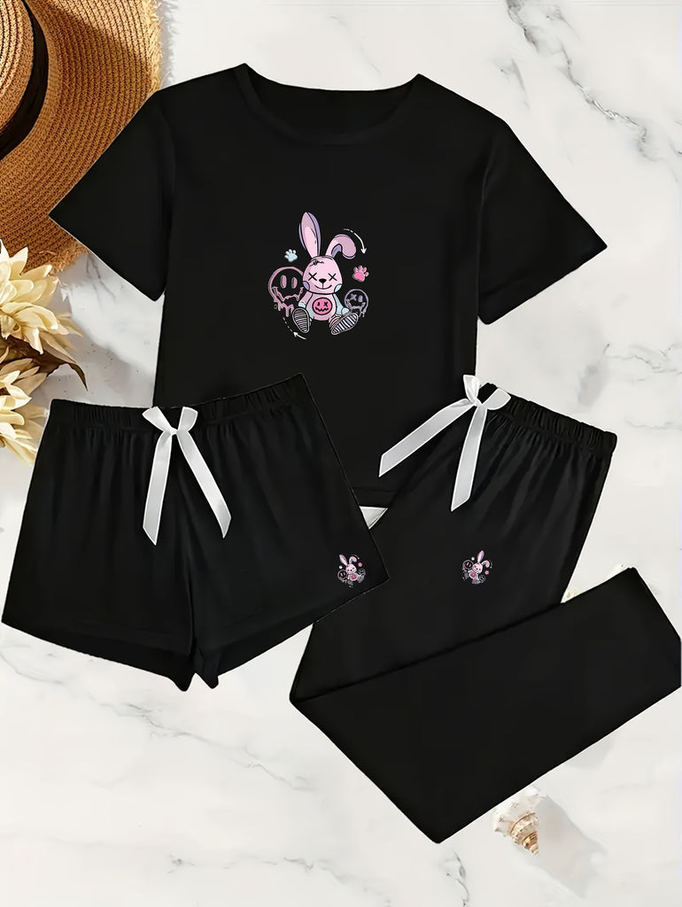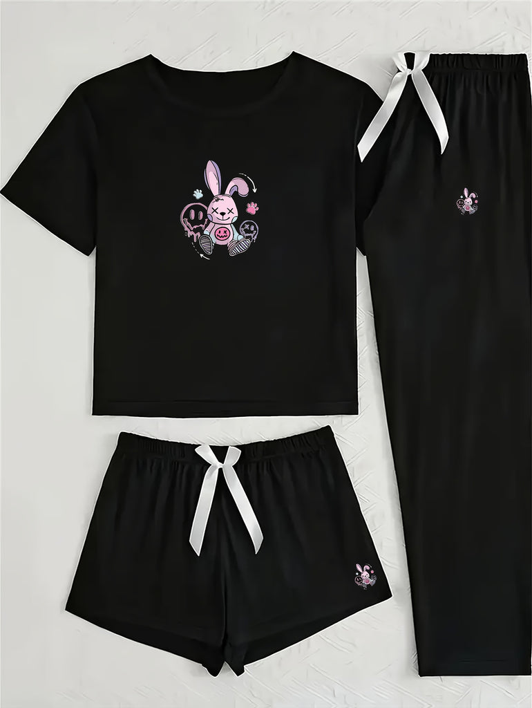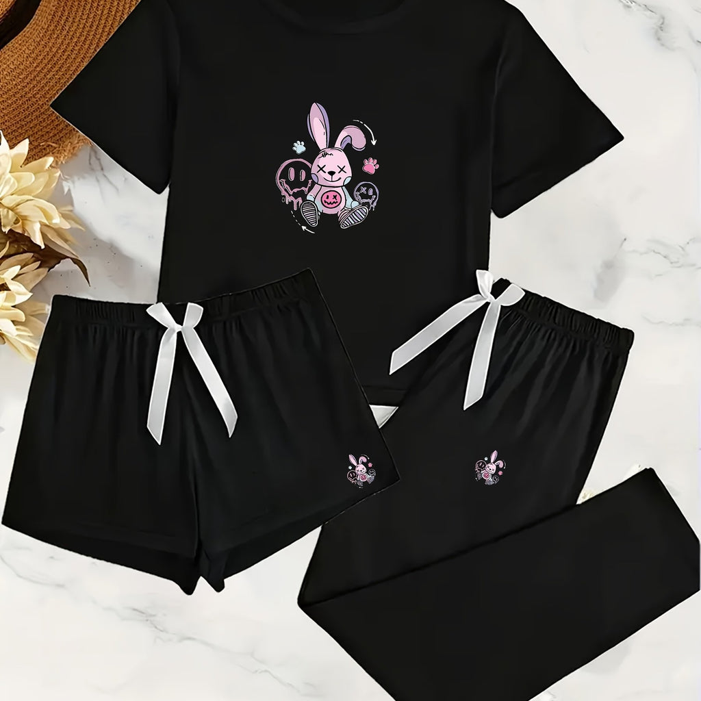Women'S Short Sleeve Pajama Set with Cute Bunny Print - Black Casual Sleepwear with White Drawstring Shorts and Long Pants, Perfect for All Seasons, Cozy Sleepwear|Playful Print Pajamas|Comfortable Fit