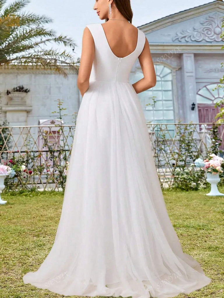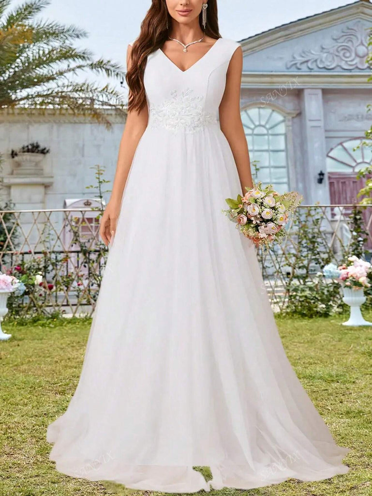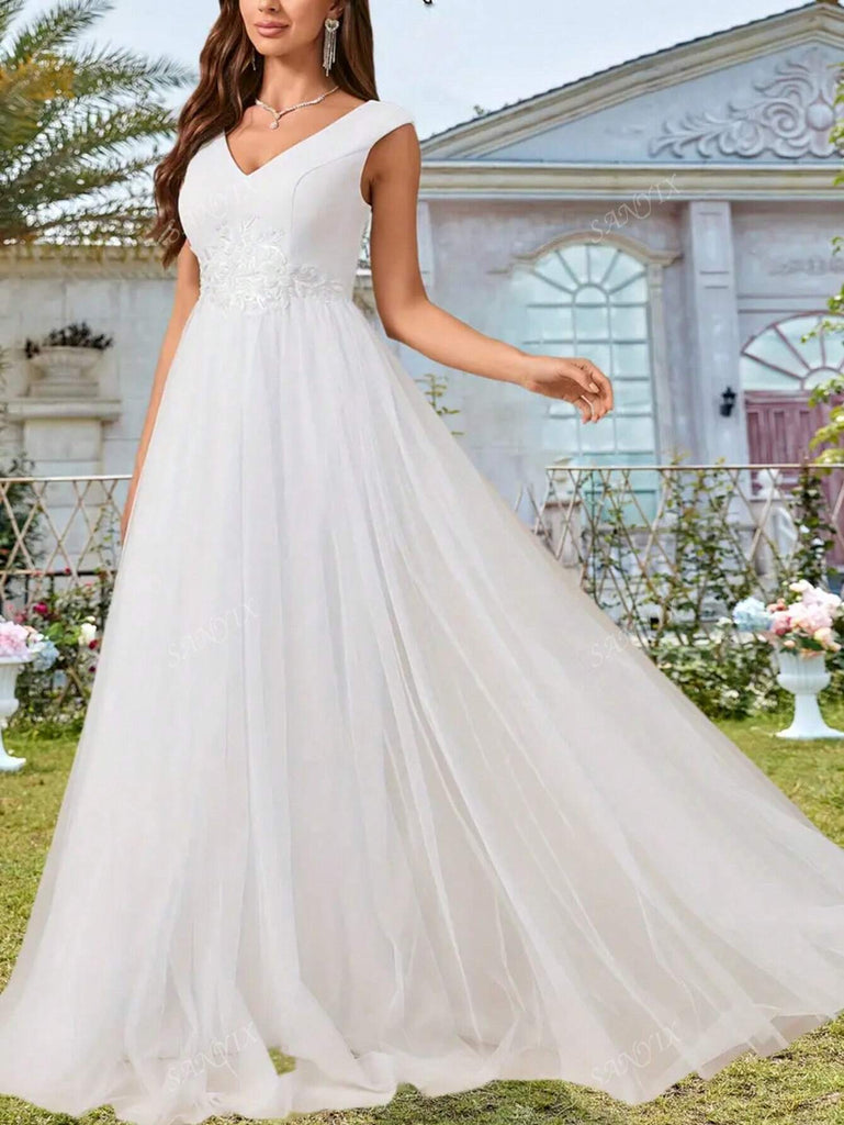 Elegant White Tulle Wedding Dress, V-Neck, Halter Design, Waist Embellished With Sequin Embroidery, Flowing Hemline