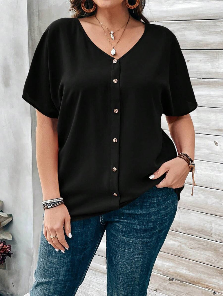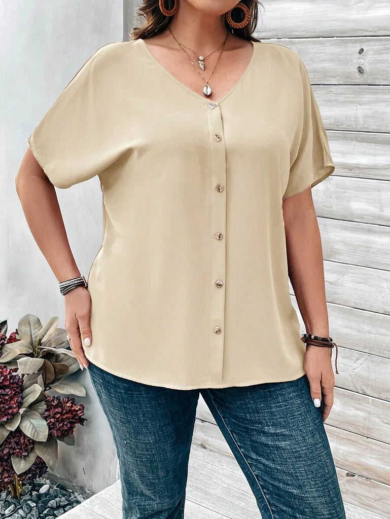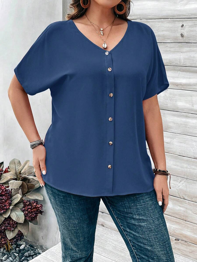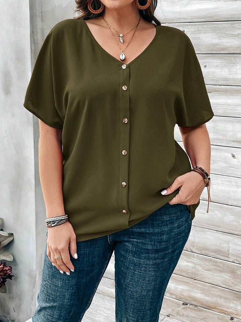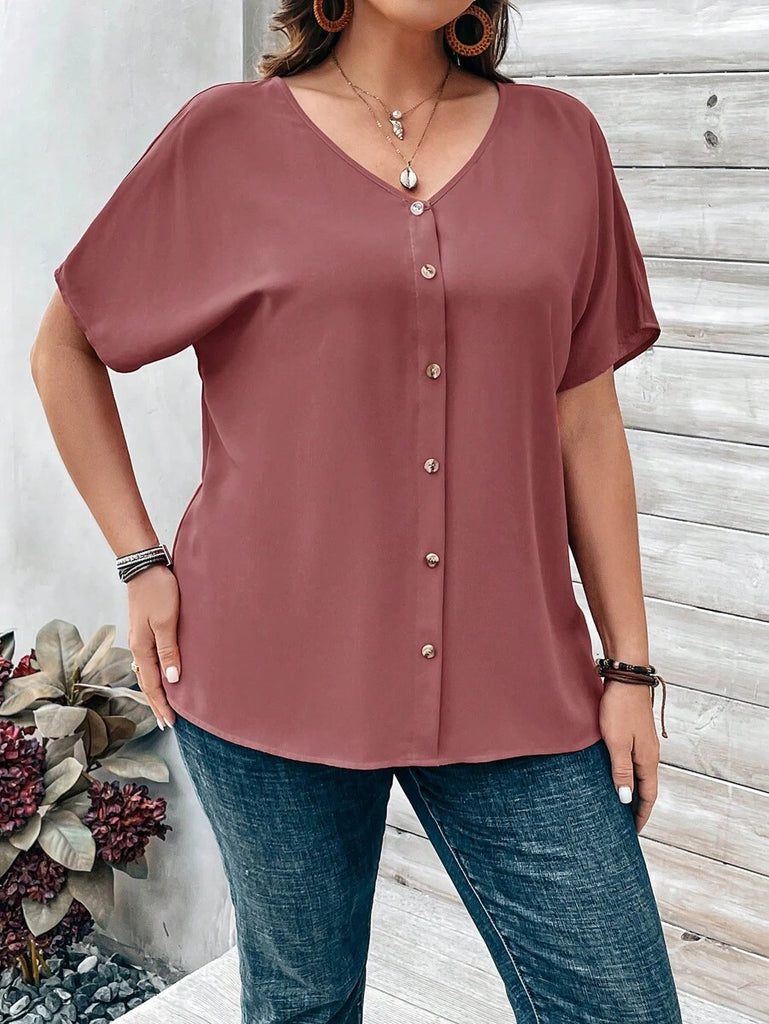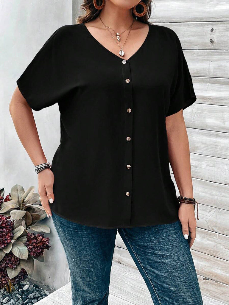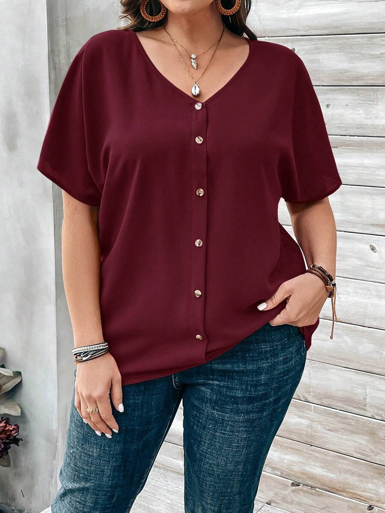 Women's Plus Size Plain Batwing Sleeve Buttoned-Up Blouse
