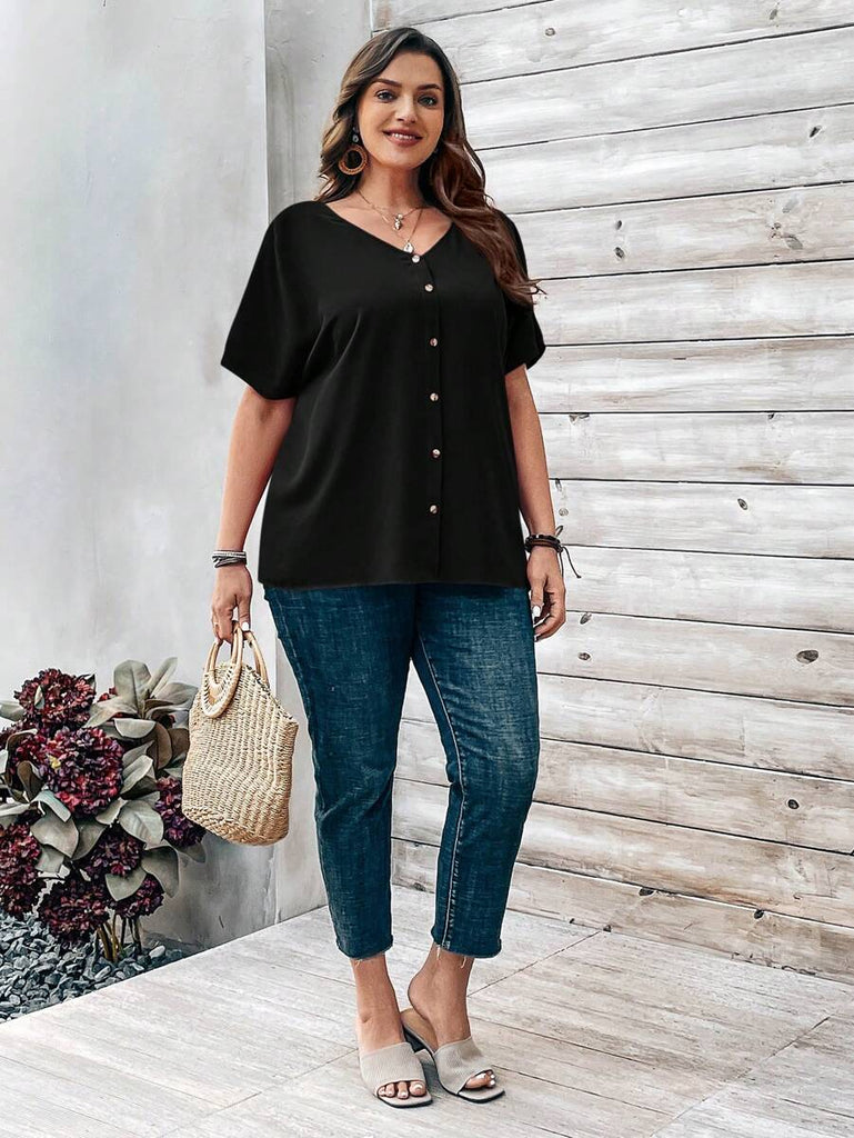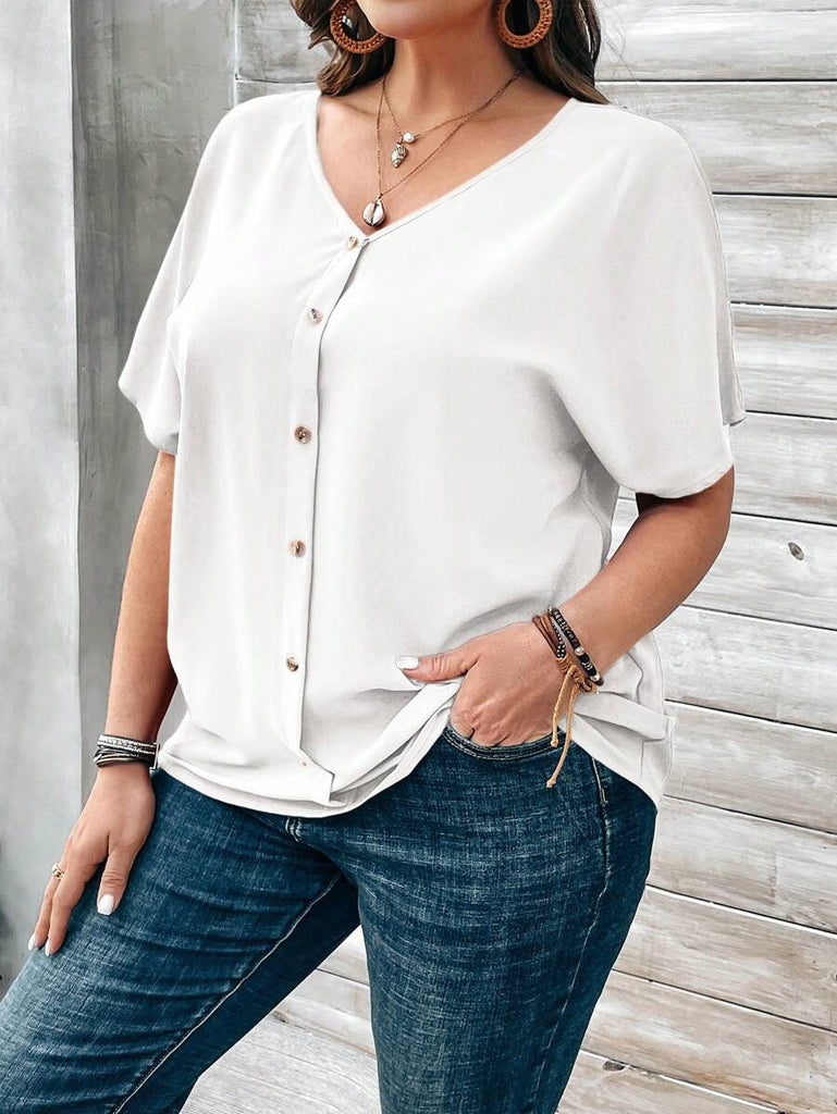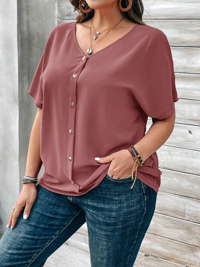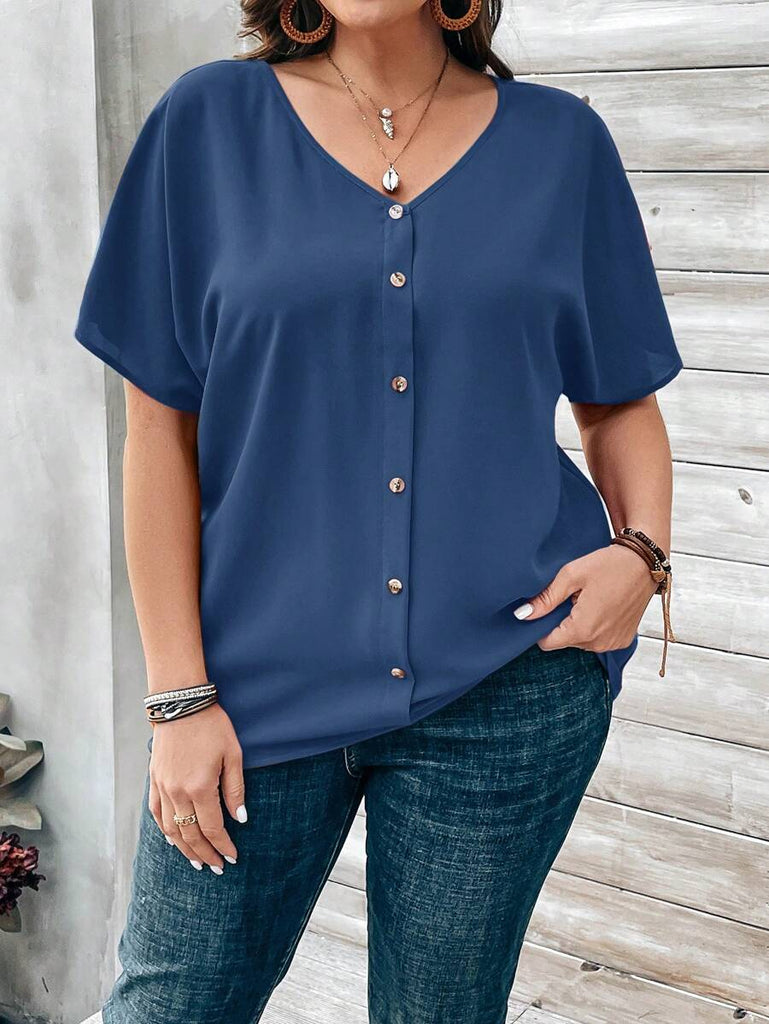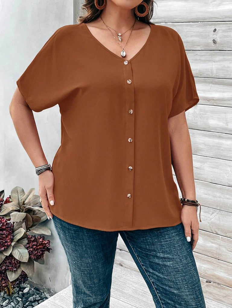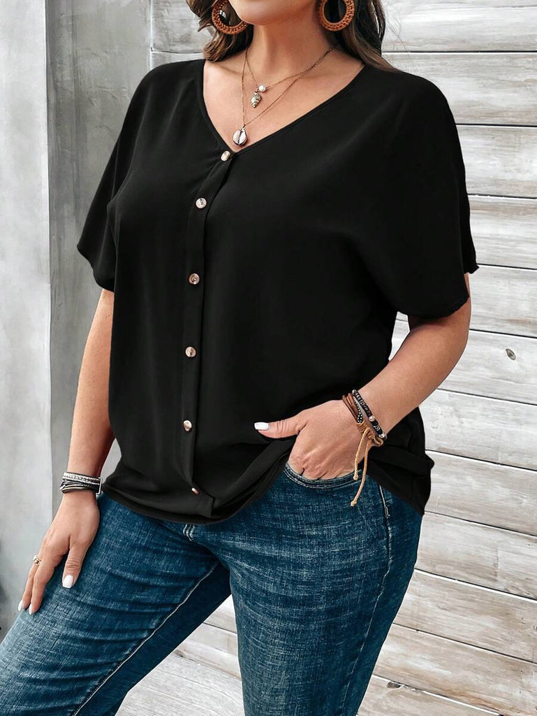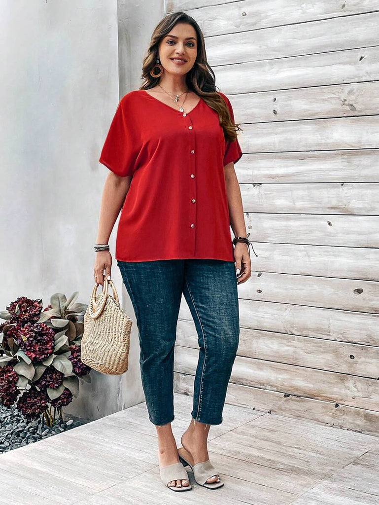 Women's Plus Size Plain Batwing Sleeve Buttoned-Up Blouse