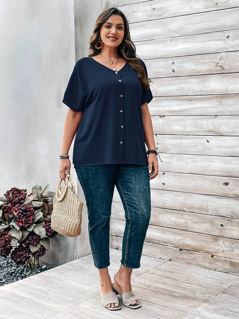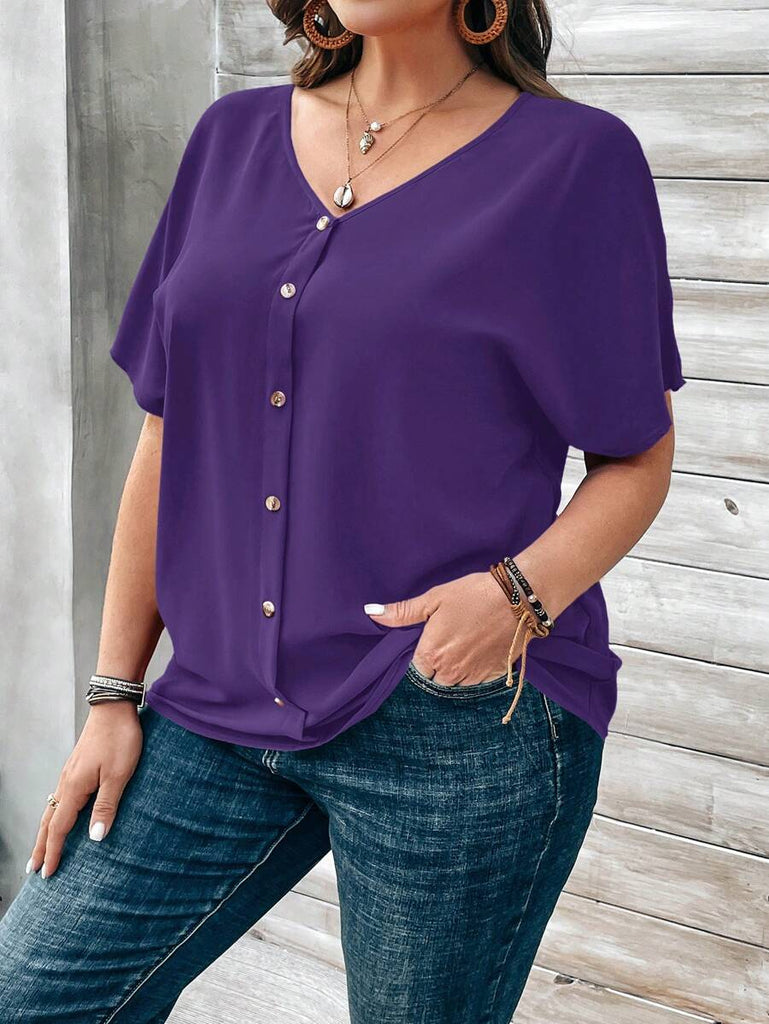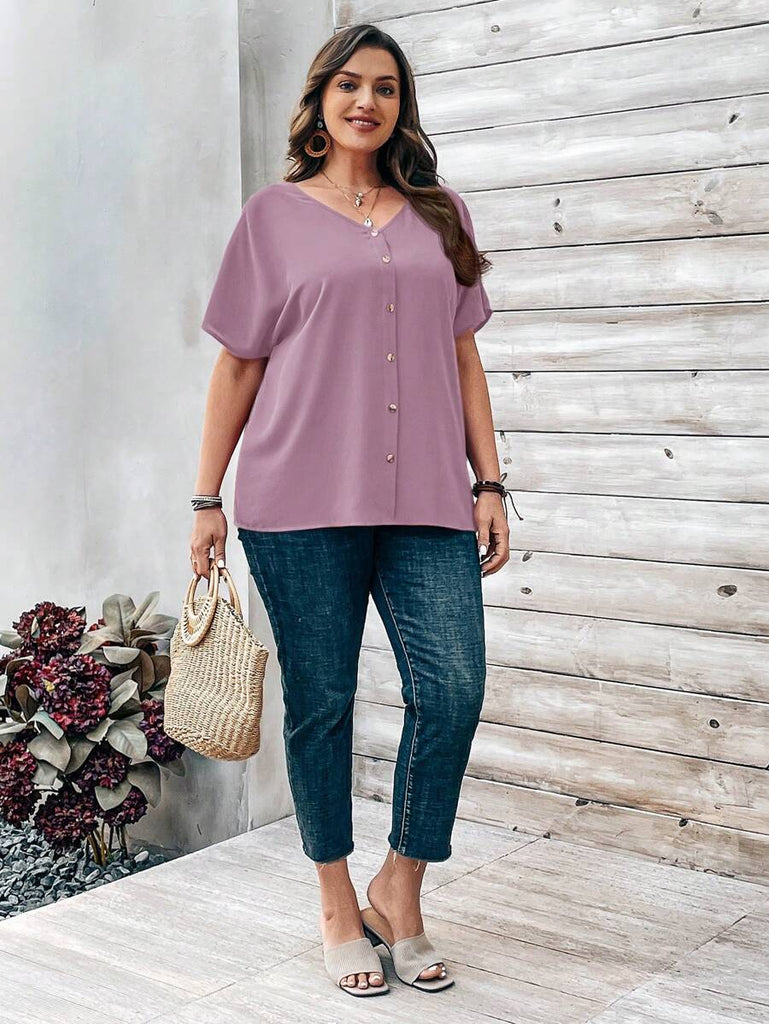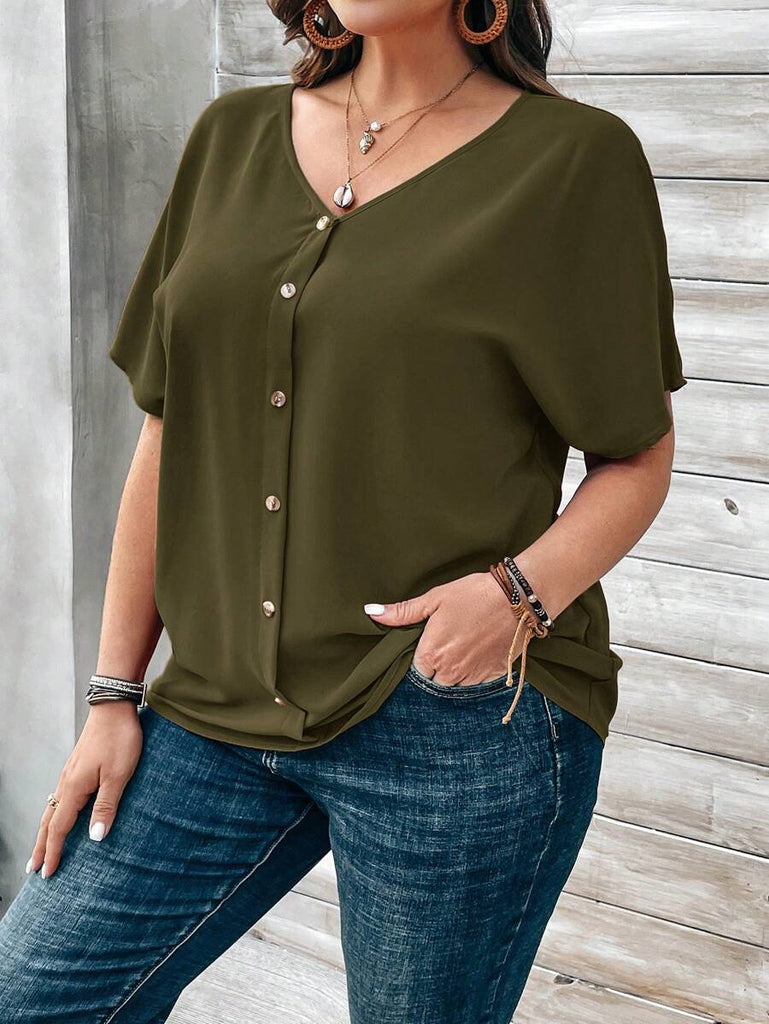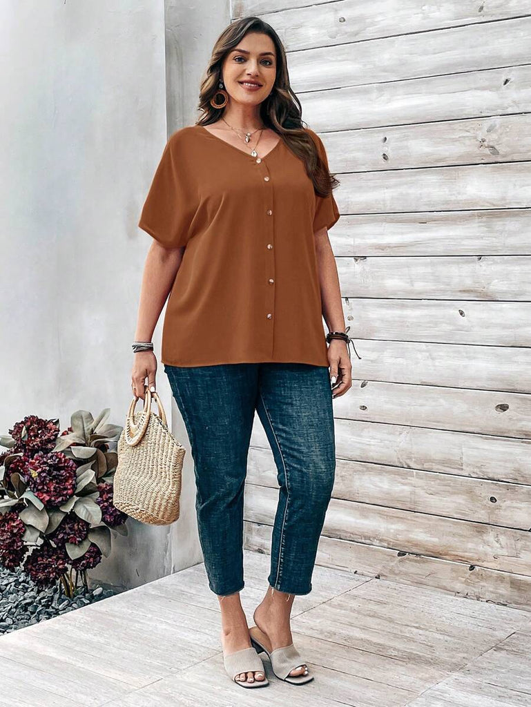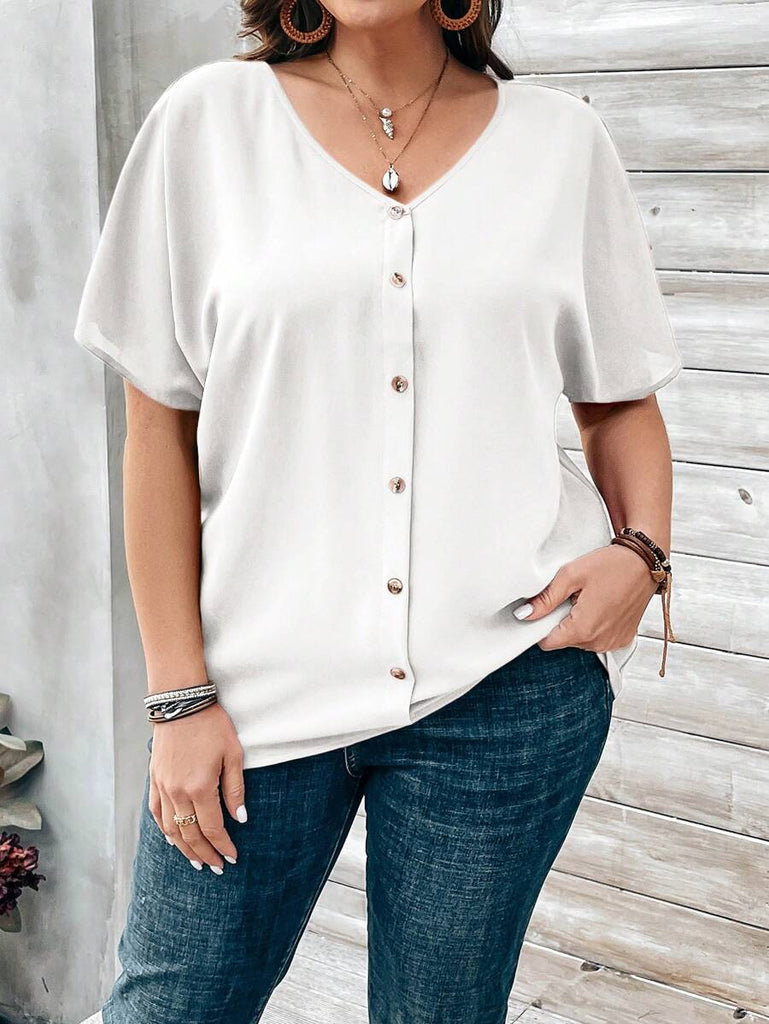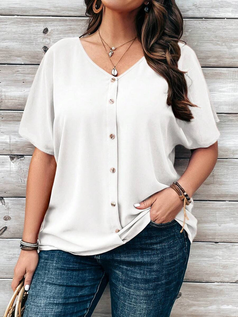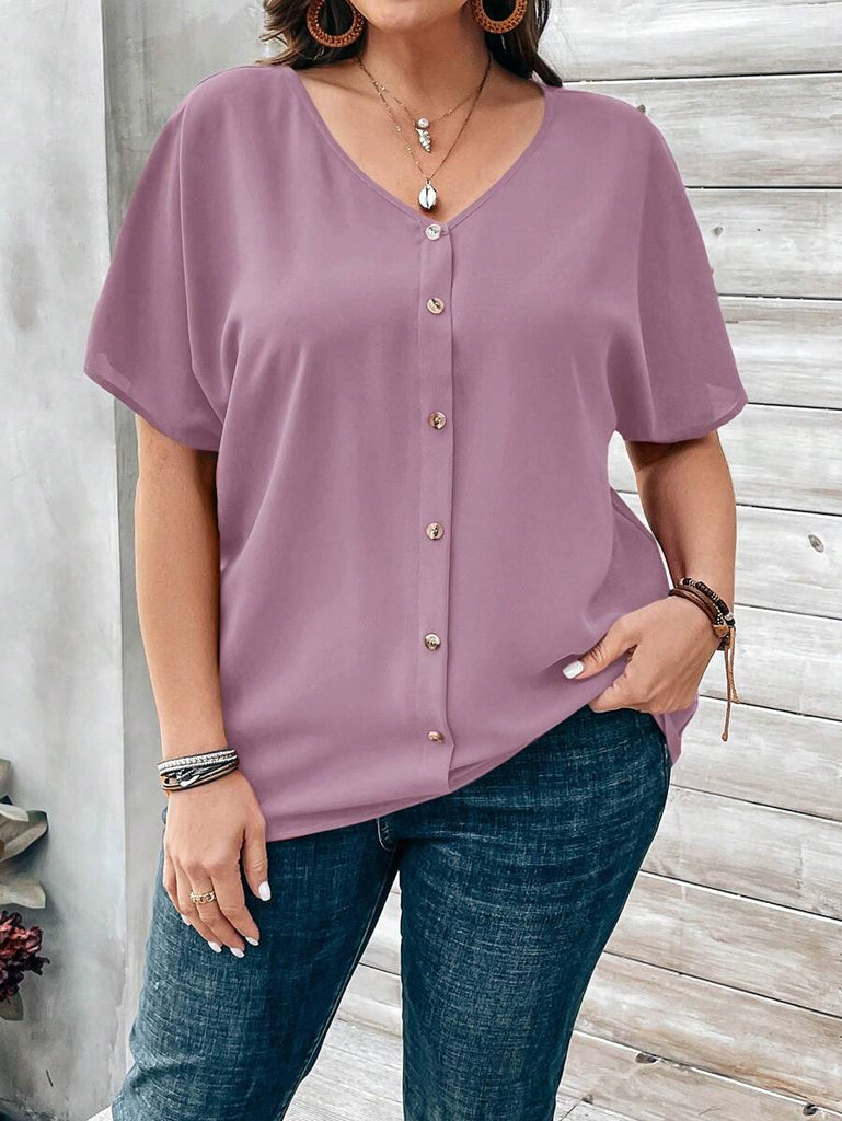 Women's Plus Size Plain Batwing Sleeve Buttoned-Up Blouse