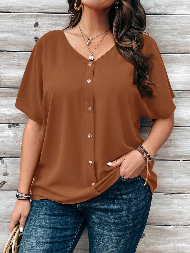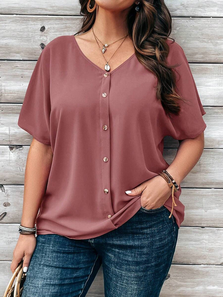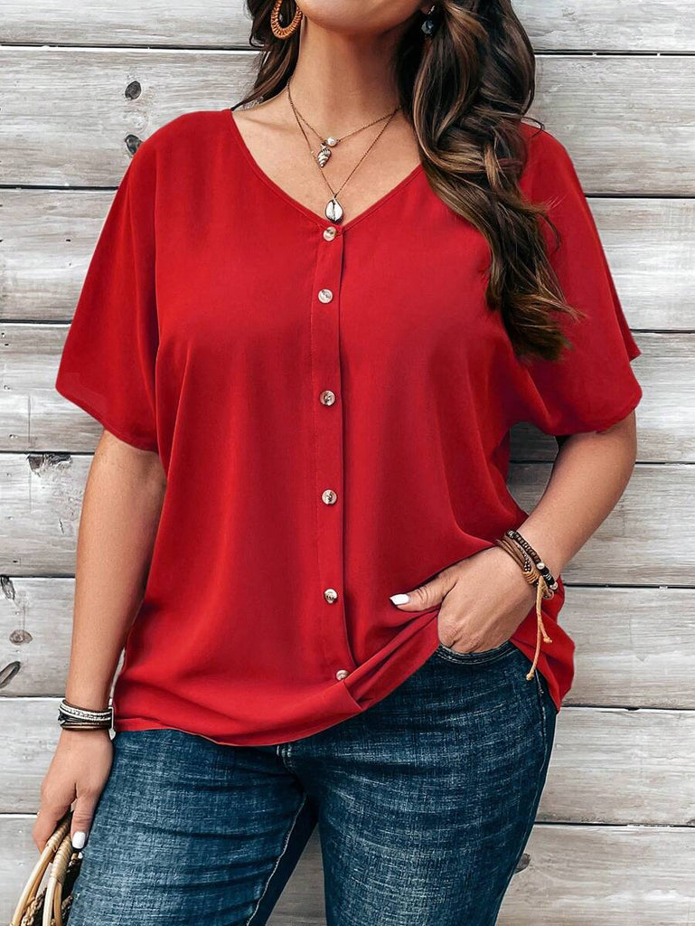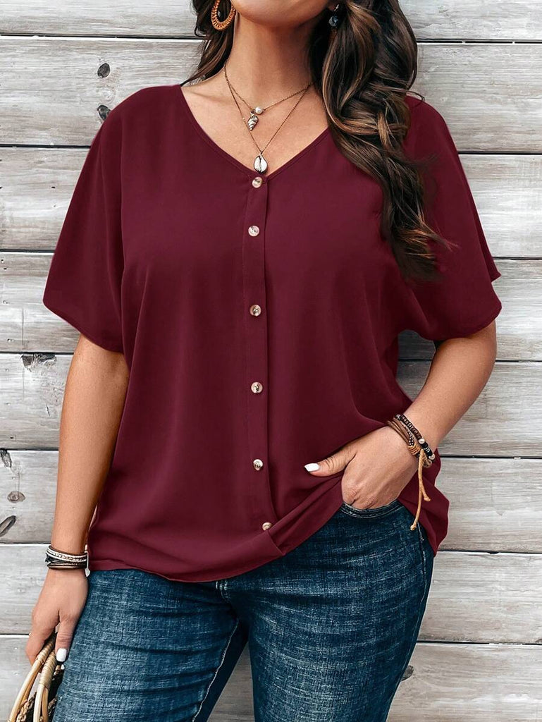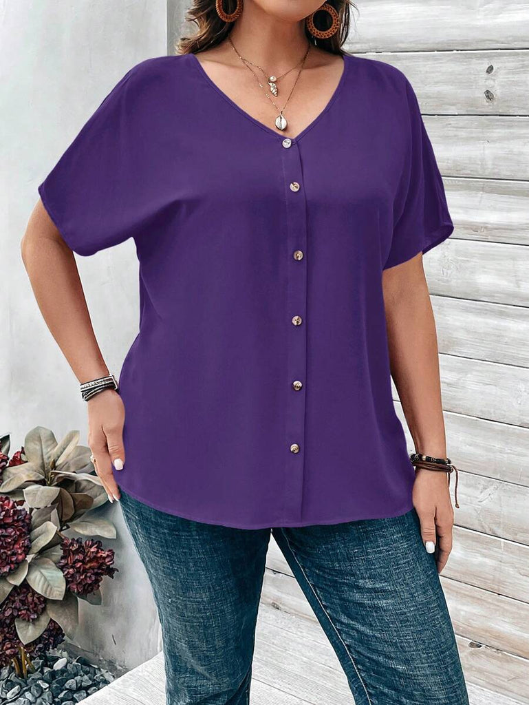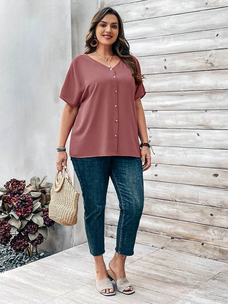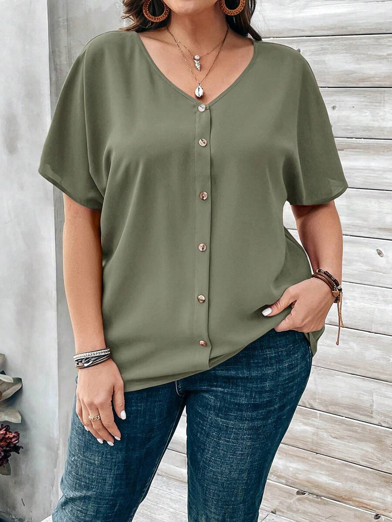 Women's Plus Size Plain Batwing Sleeve Buttoned-Up Blouse