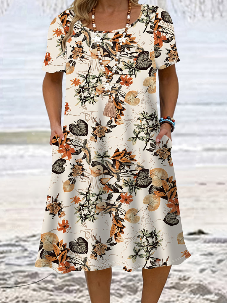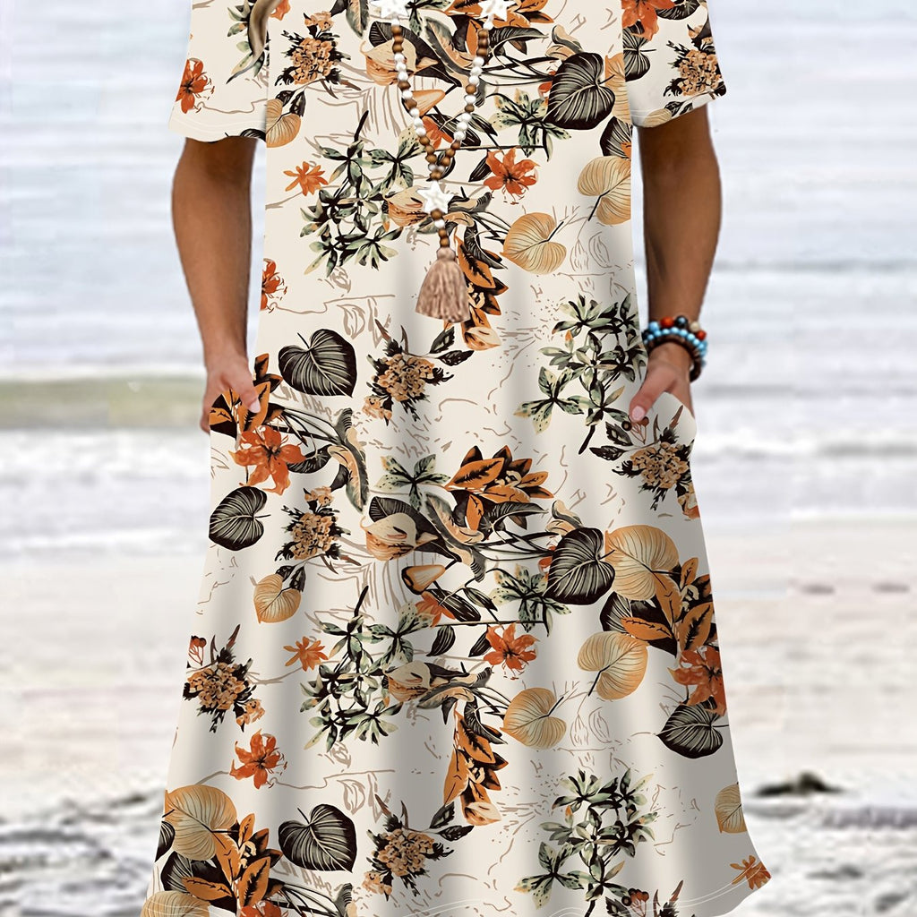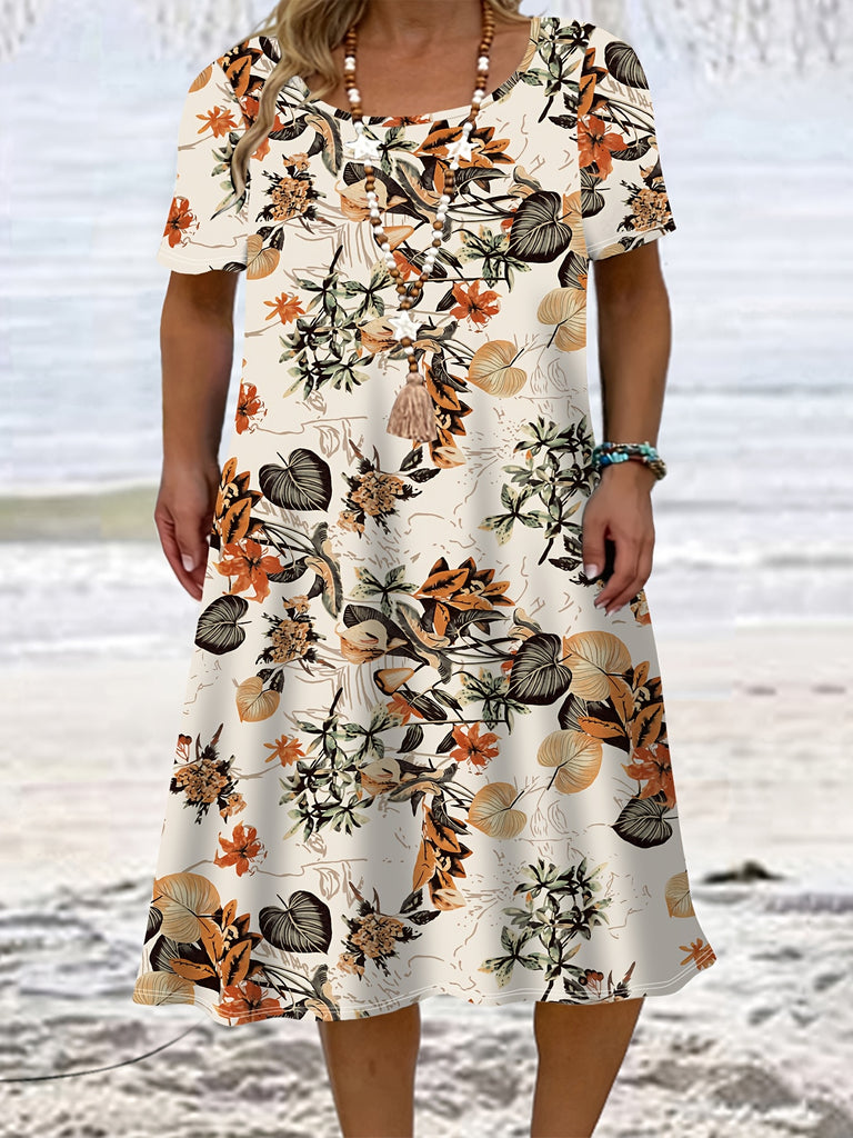 Plus Size, Popular Choice: Plus-size Tropical Plant Print Dress, Short Sleeves with a Loose Fit for a Effect, Women's Plus-size Vacation-style Dress for Spring and Summer