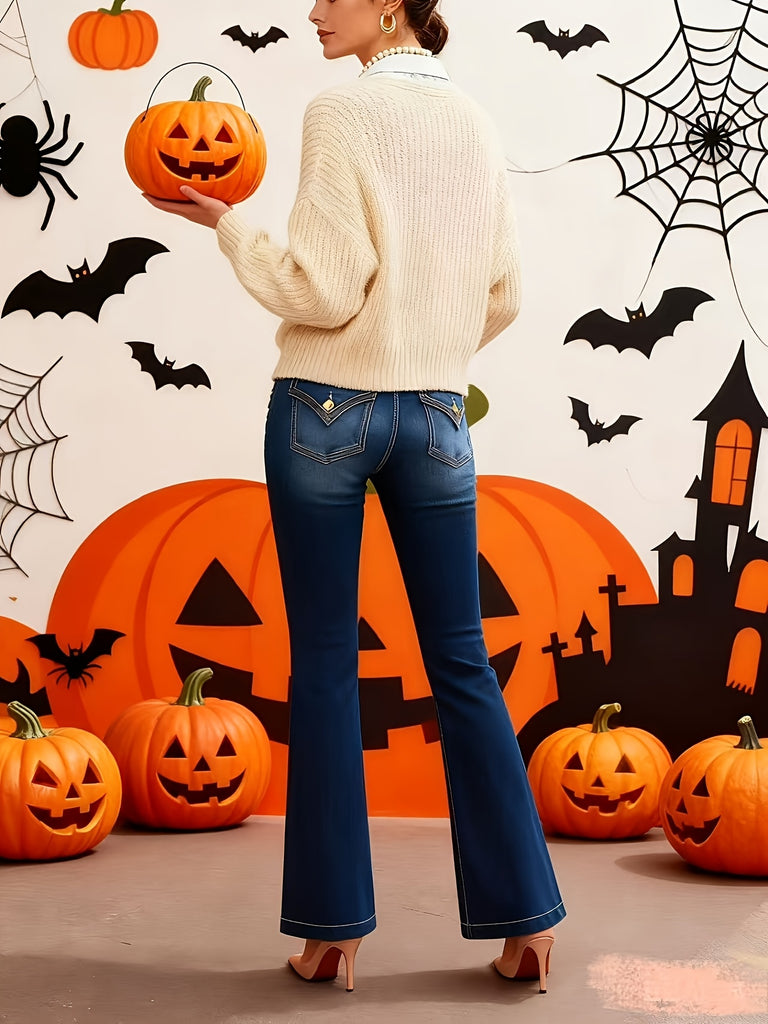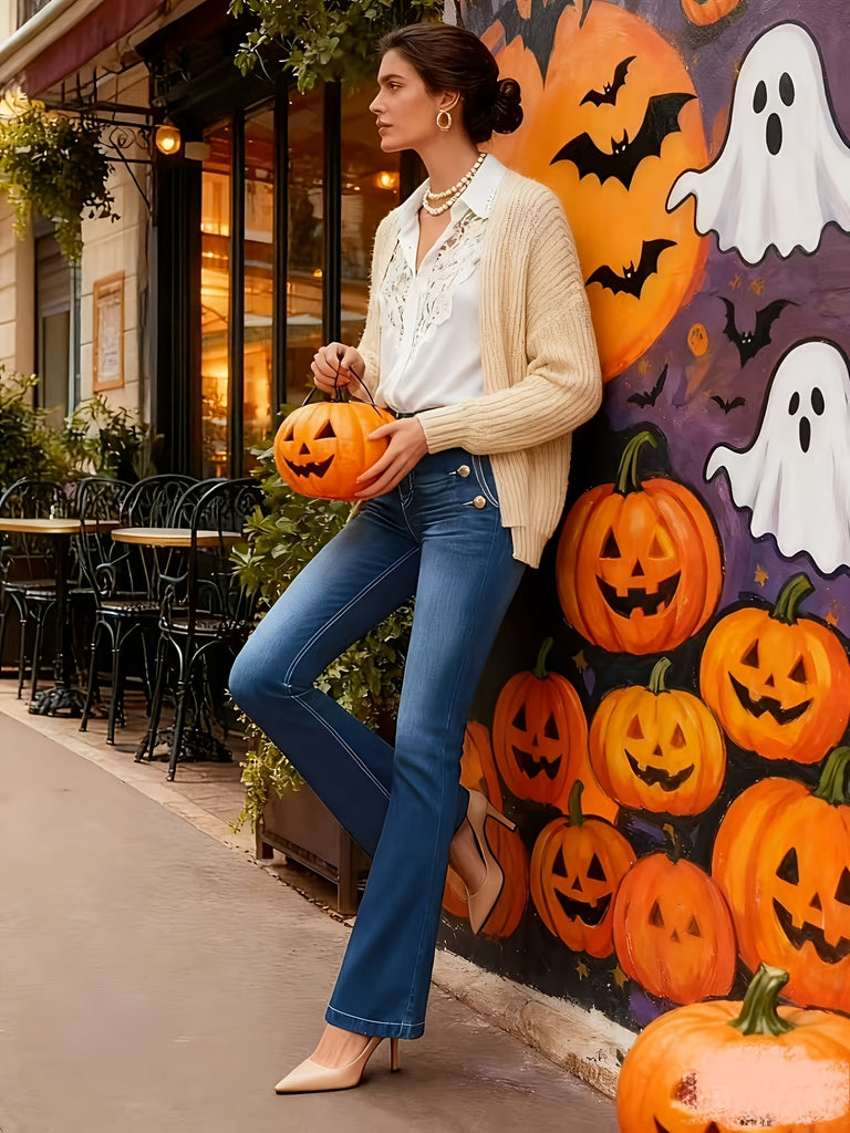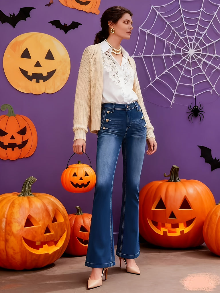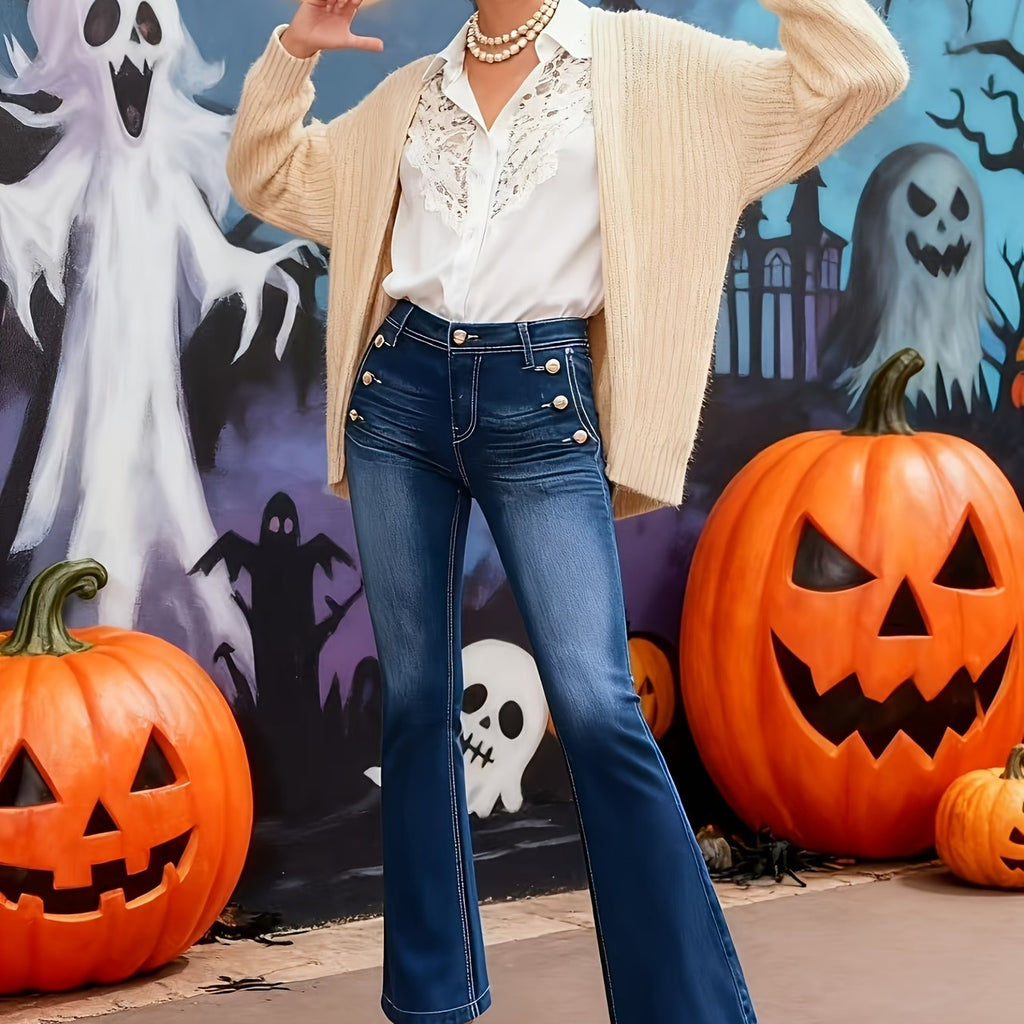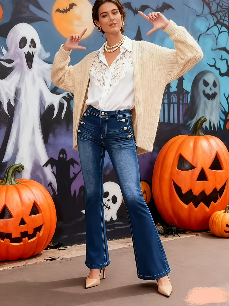 's High-Waisted Stretch Bell-Bottom Jeans Pants with Multi-Button Closure & Wide-Leg Trousers - All-Season Elegant Denim, Belt-Loop Waist (No Belt Included), Casual to Formal Wear, Built-In Zipper for Jeans (Regular Fit)