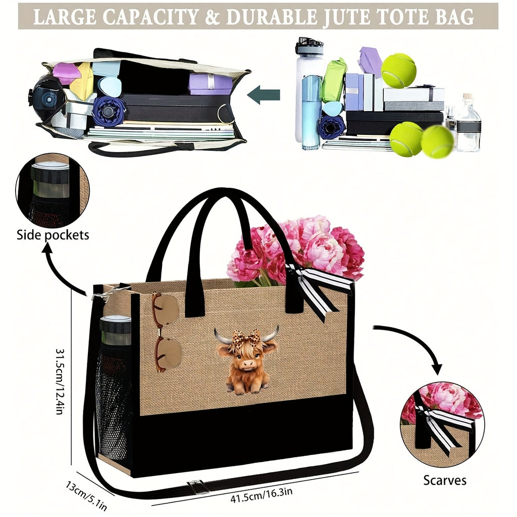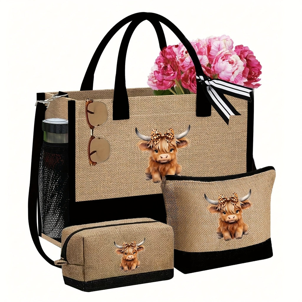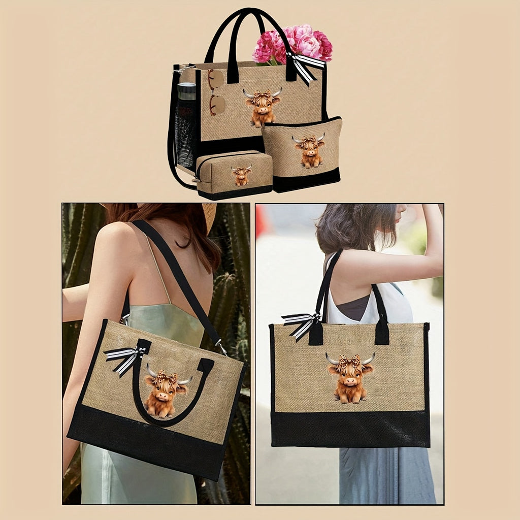 Cute Highland Cow Themed Beach Tote Bag Set