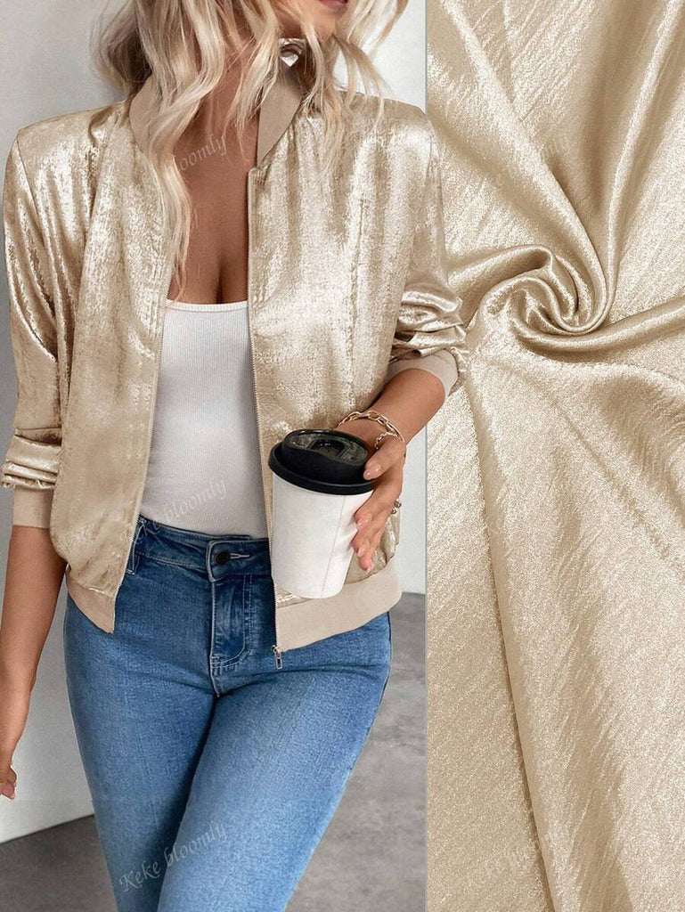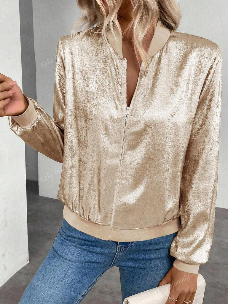 KeKe Bloomly Women's Lightweight Long Sleeve Zip-Up Casual Jacket With Foil Floral Pattern, Baseball Style Regular Fit, Fashionable