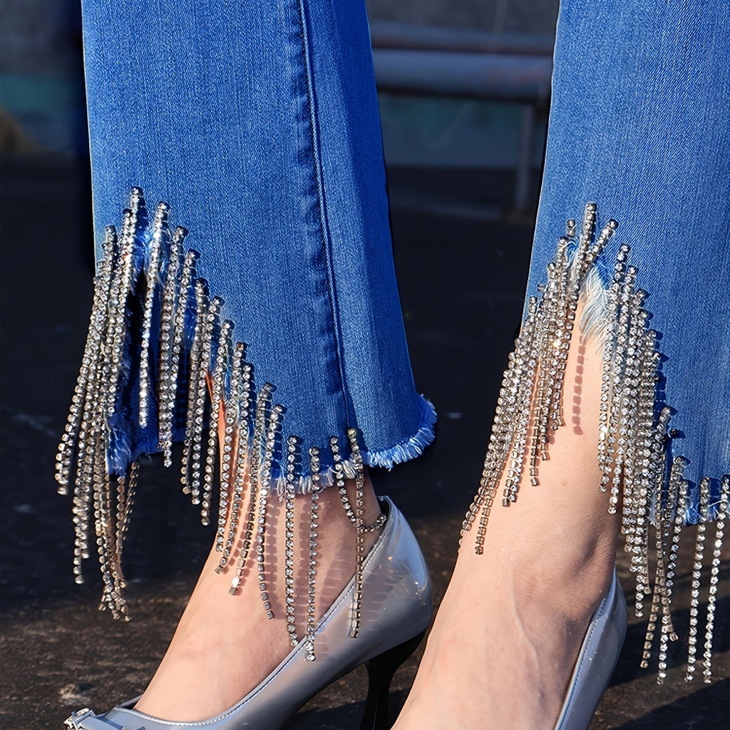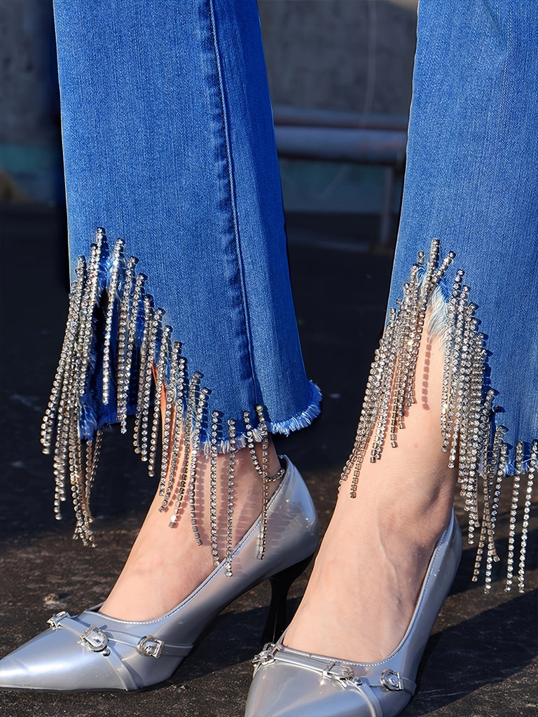 Ladies Blue Medium High Stretch Jeans, Low Waist Flare Leg, Solid Color, Long Length, All-Season, with Tassel, Woven, 418g/m² Fabric Weight, Personality Jeans