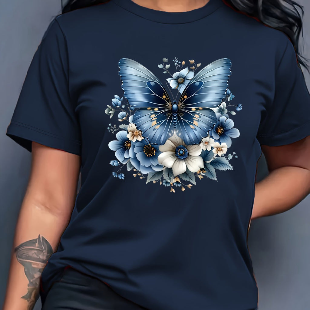 Women'S Casual Crew Neck T-Shirt with Butterfly & Floral Print - Short Sleeve, Regular Length, Slight Stretch Fabric - Machine Washable Spring/Summer Top, Spring Summer Top|Butterfly Print Top|Glossy Fabric Tee