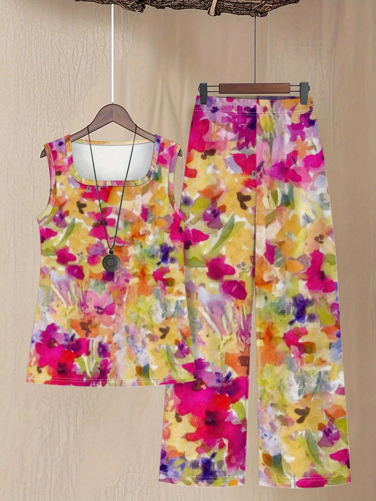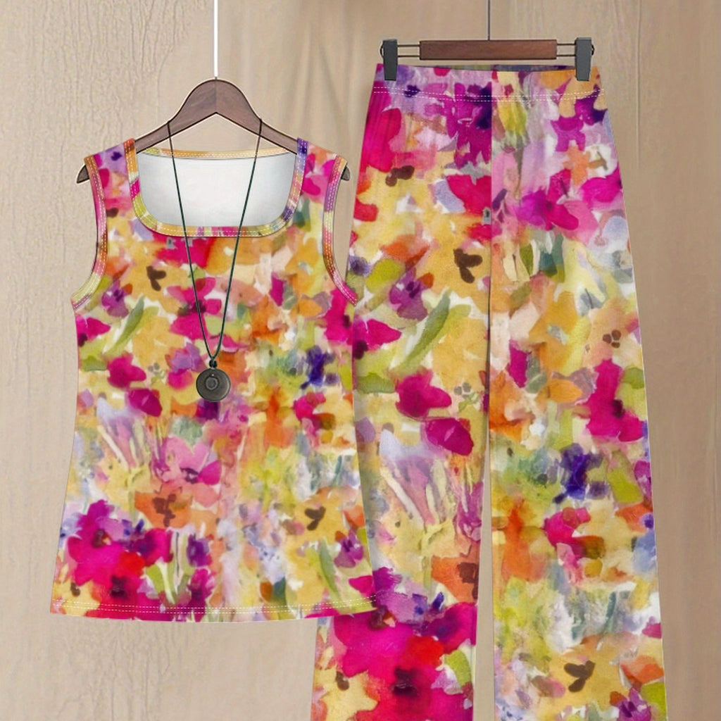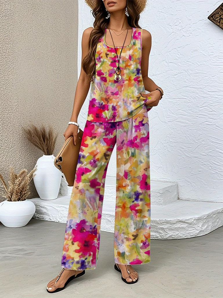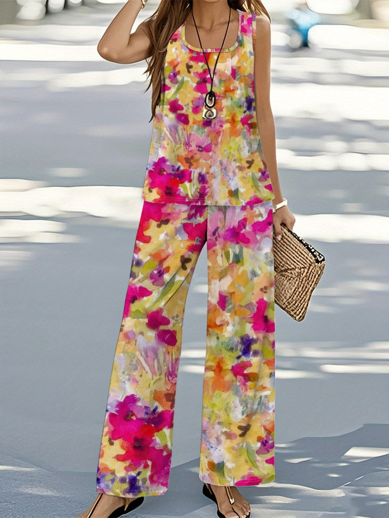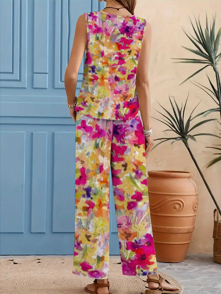 Women'S Casual Floral Print Sleeveless Top & Wide-Leg Pants Set - Vibrant Pink, Yellow, Green & Blue Flowers on White, High-Waisted Design, Perfect for Spring/Fall, Floral Print Blouse