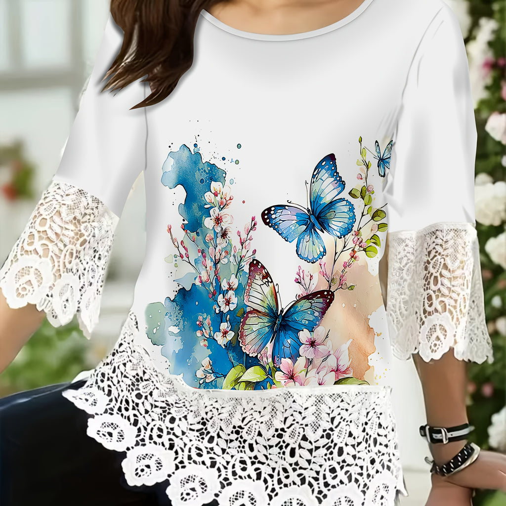 Women'S Elegant Butterfly Print Lace Blouse with Ruffle Hem - Stylish Round Neck, 3/4 Sleeve Top, White Polyester Blend, Perfect for Casual or Dressy Outfits, Ladies T Shirts