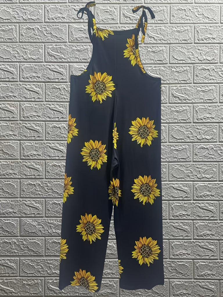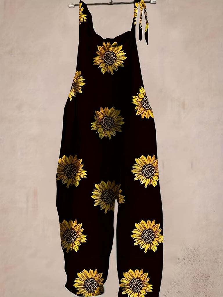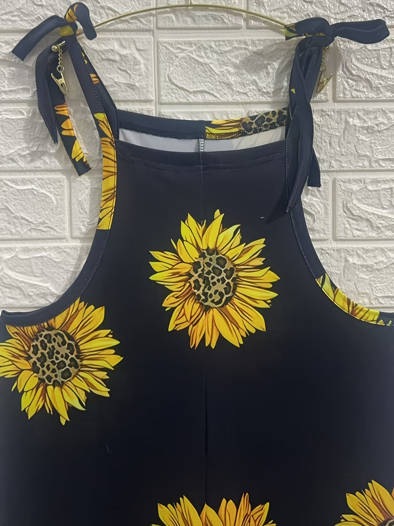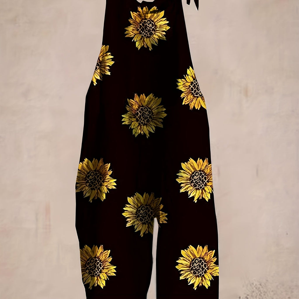 Women'S Floral Sunflower Print Jumpsuit, Spring/Summer Fall Casual Sleeveless Polyester Spandex Blend, Medium Stretch Knit Fabric, Regular Fit with Strappy Back, H-Line Long Length
