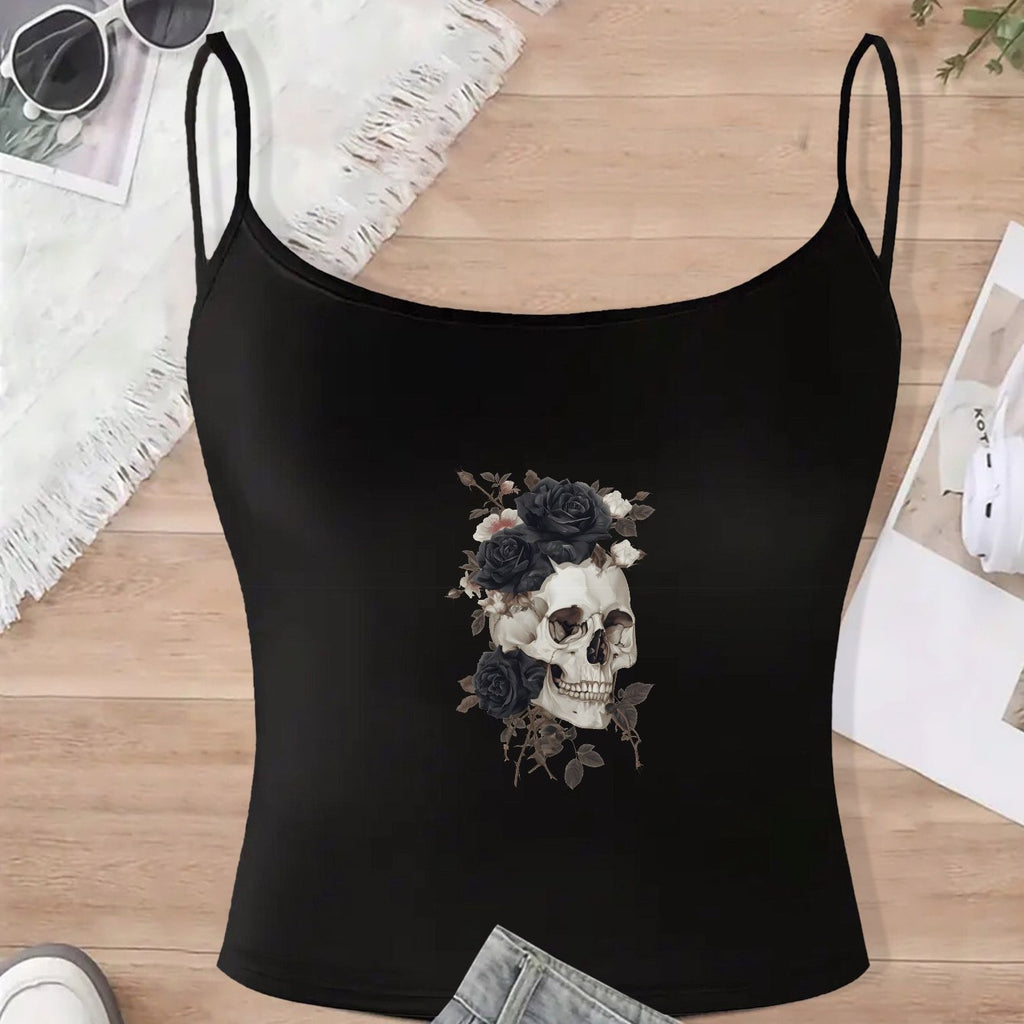 Women's Gothic Skull & Black Rose Print Sleeveless Top - Off-Shoulder/Boat Neck Fitted Crop Shirt, Lightweight Layering Piece for Spring Summer Fall, Casual & Party Outfits (Machine Washable, White Strap) - Edgy Boho-Chic Style, Boho Chic Outfit, Stretch