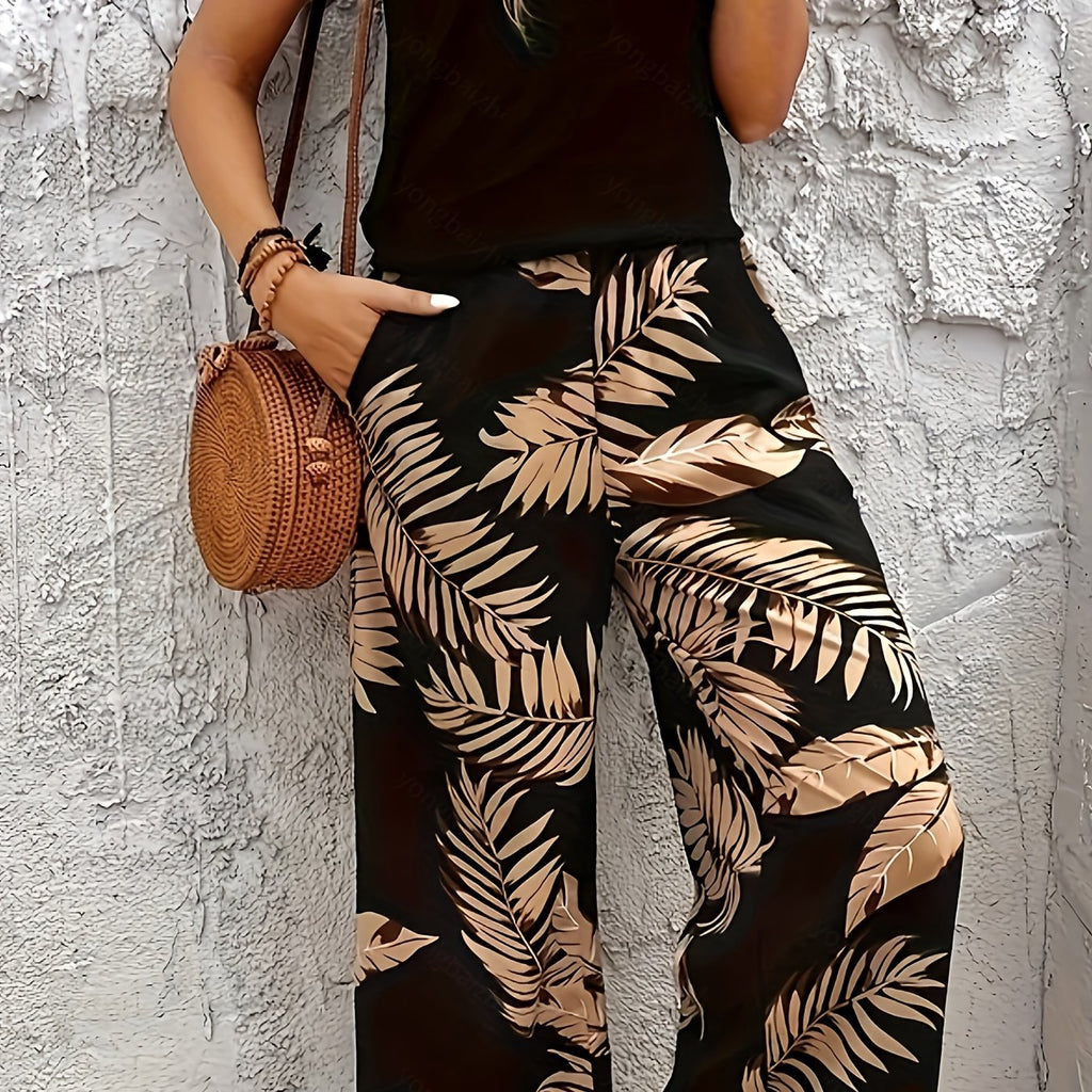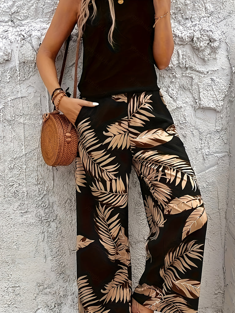 Women's Sleeveless Top with Tropical Palm Print Wide-Leg Pants Summer Casual Outfit Lightweight and Breathable Perfect for Beach Vacation Tropical Print 2pcs Set