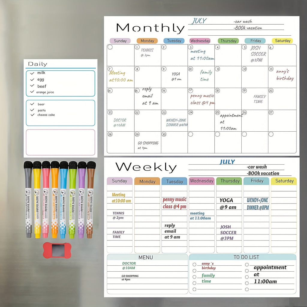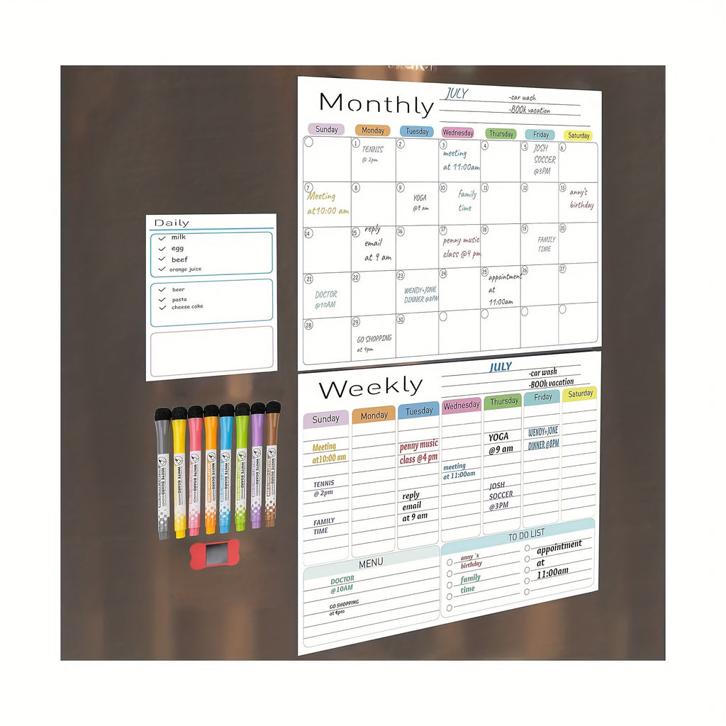 QIUCHAN Magnetic Dry Erase Calendar Whiteboard Set (1pc/3pcs) for Refrigerator, Wall, and Fridge Organization with Monthly, Weekly, and Daily Notepads. 3pcs Come with 8 Markers and 1 Eraser