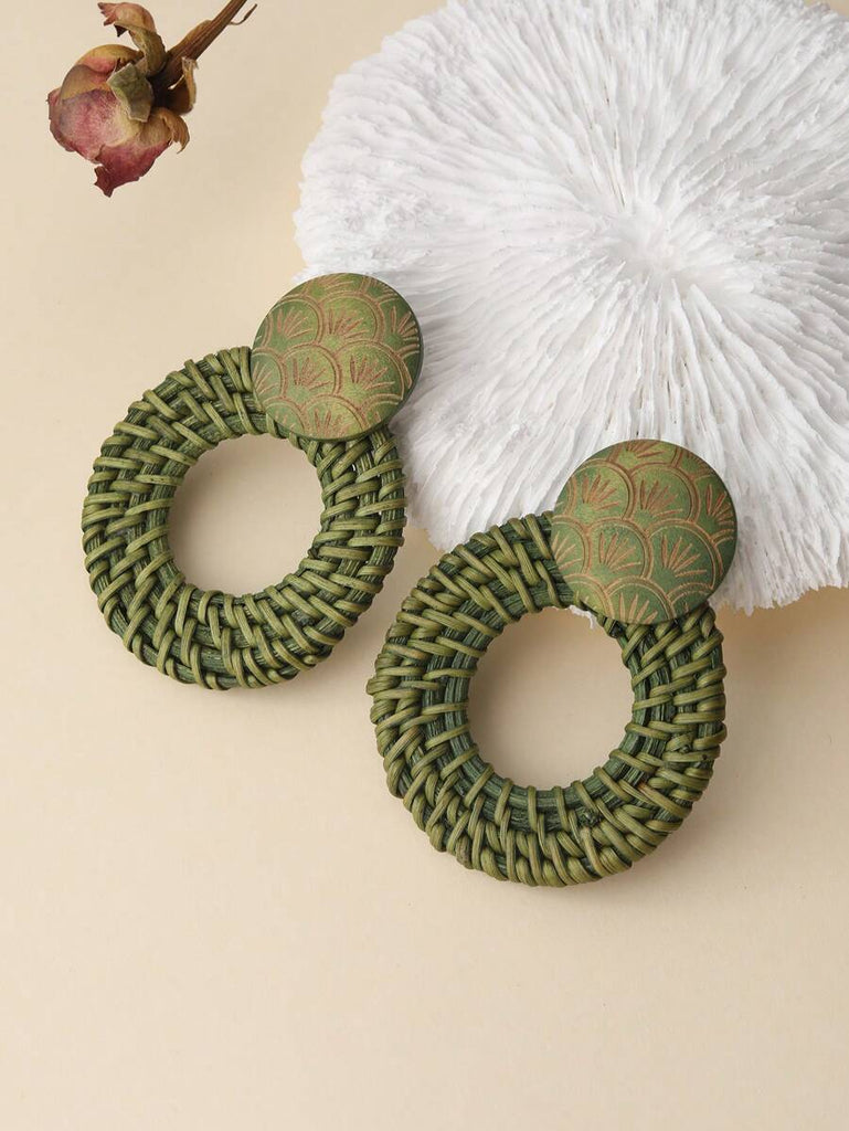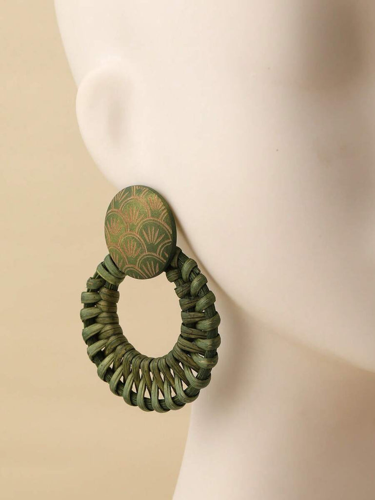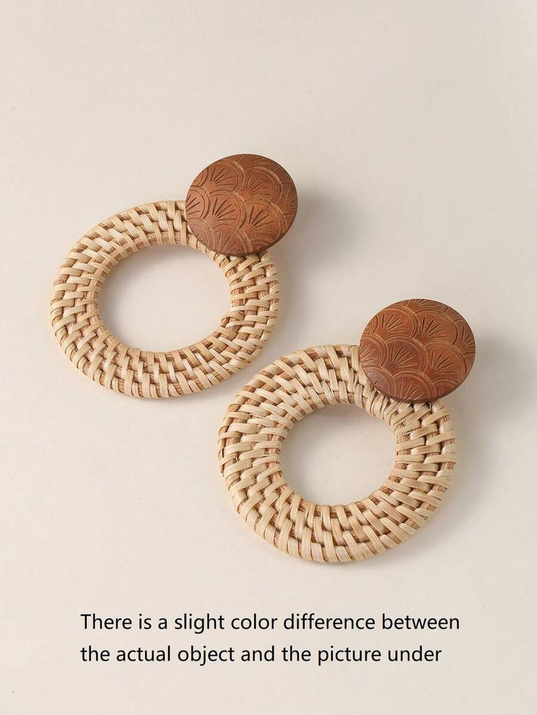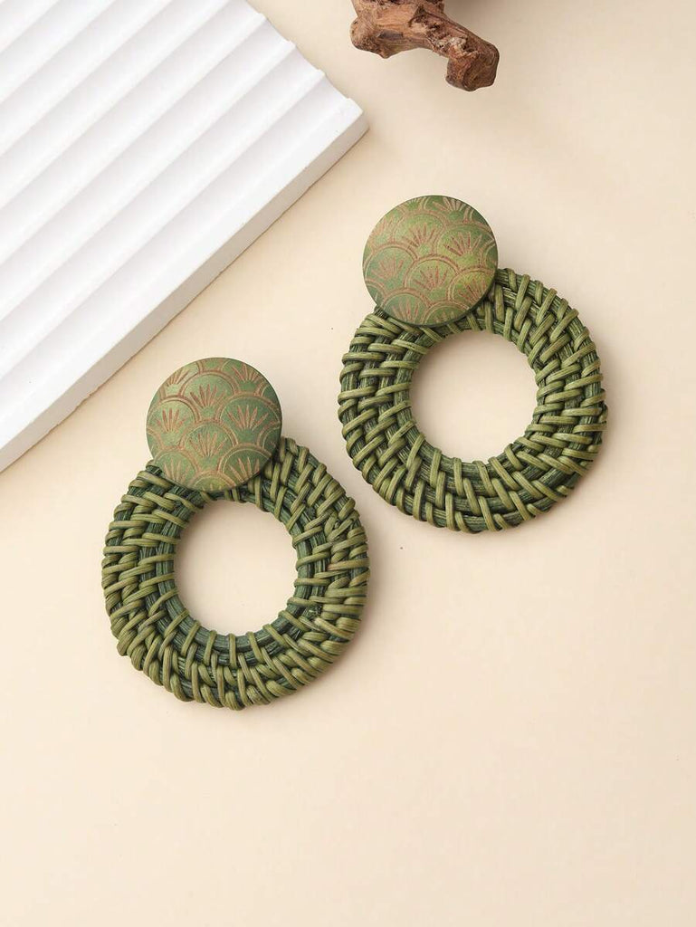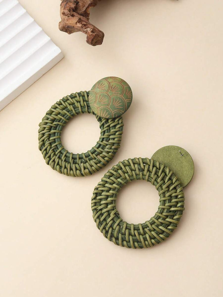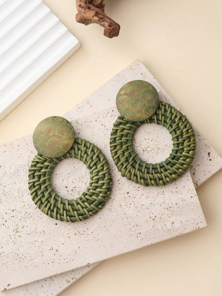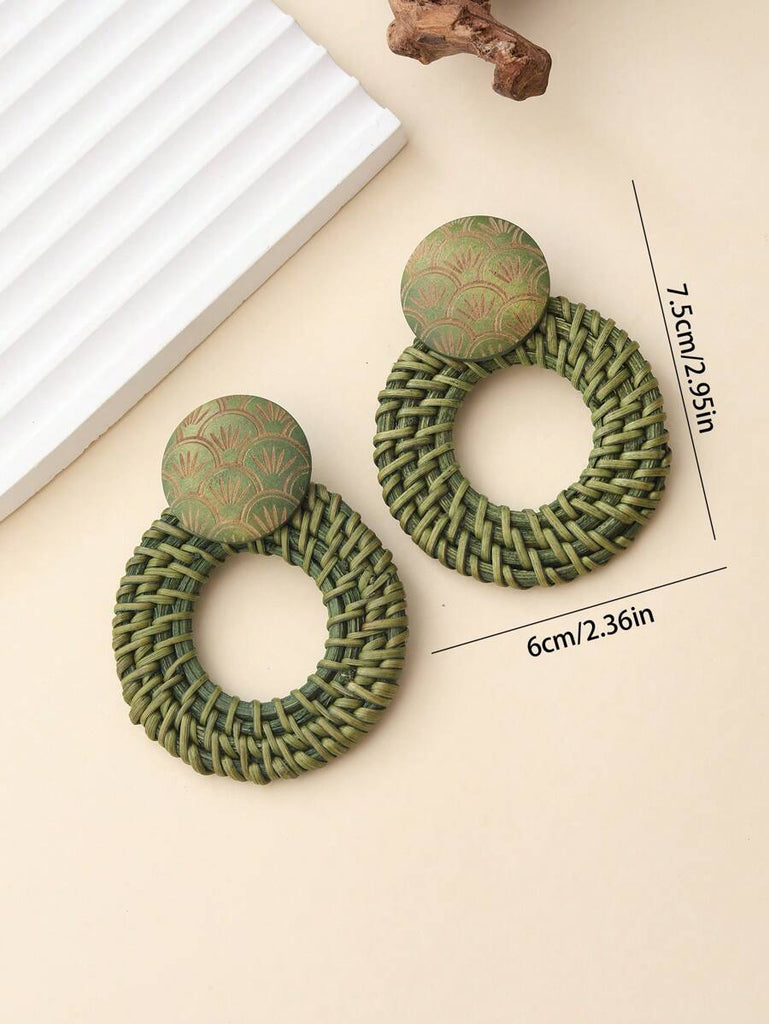 1 Pair Handmade Rattan Woven Hollow Round Earrings With Carved Wooden Decor, Suitable For Vacation, Party And Souvenir, Moss Green