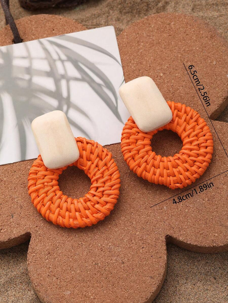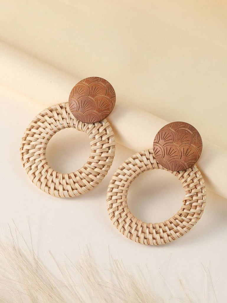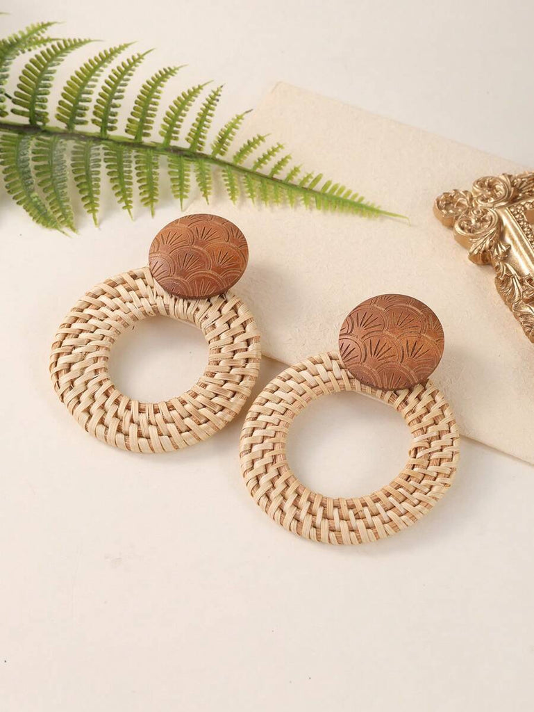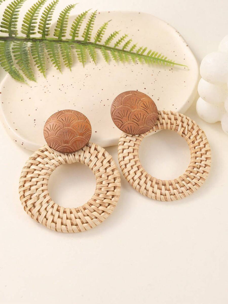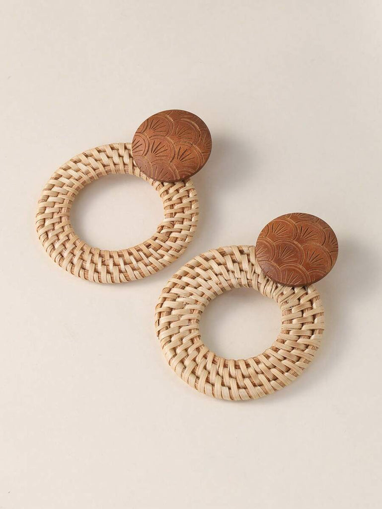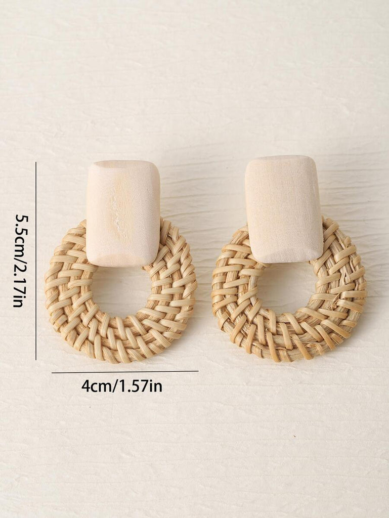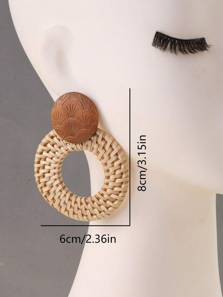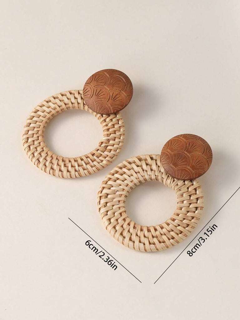 1 Pair Handmade Rattan Woven Hollow Round Earrings With Carved Wooden Decor, Suitable For Vacation, Party And Souvenir, Moss Green