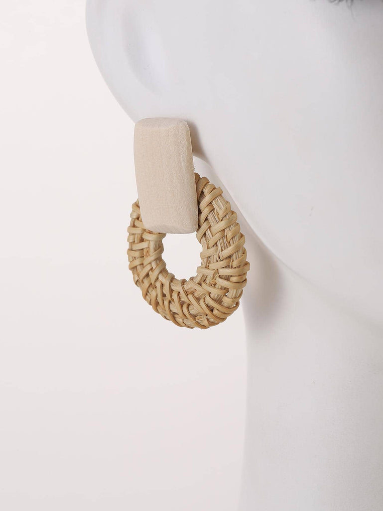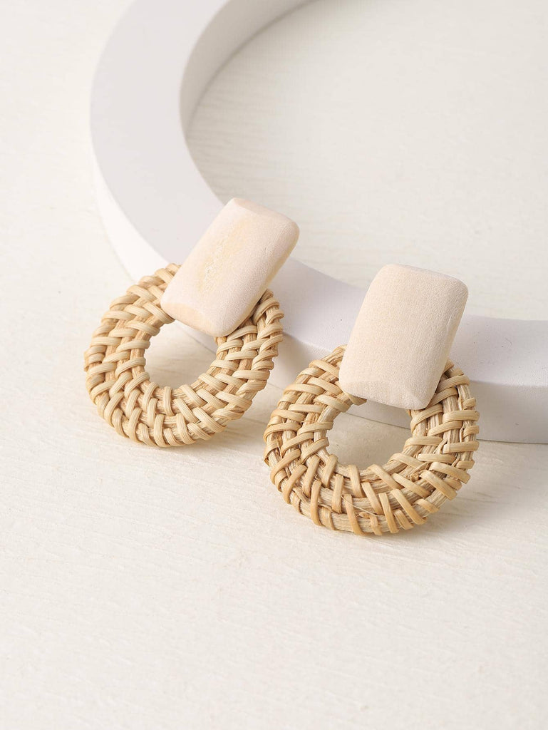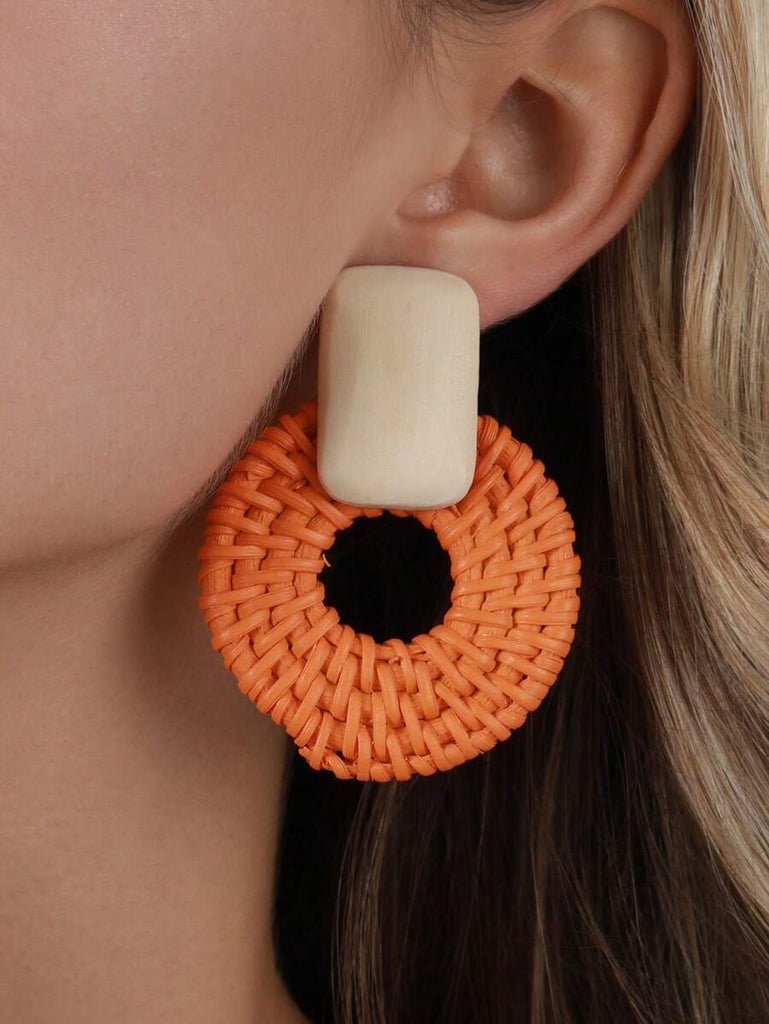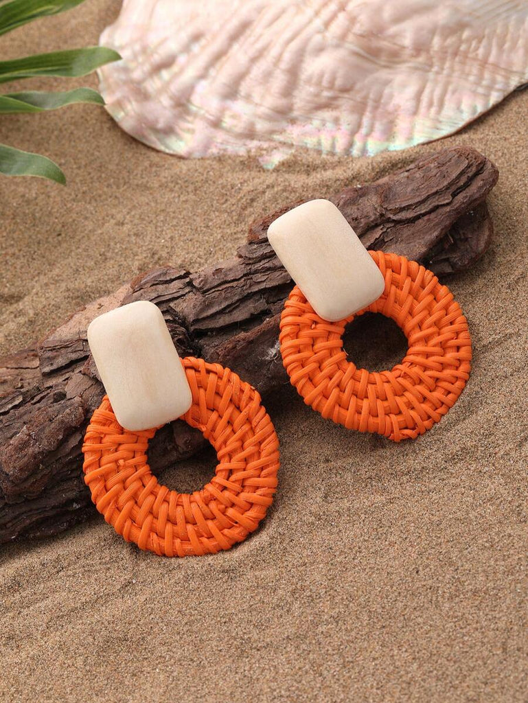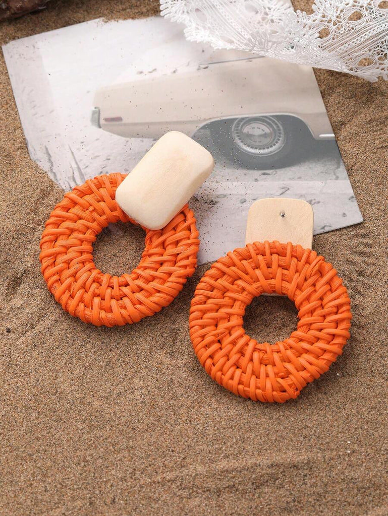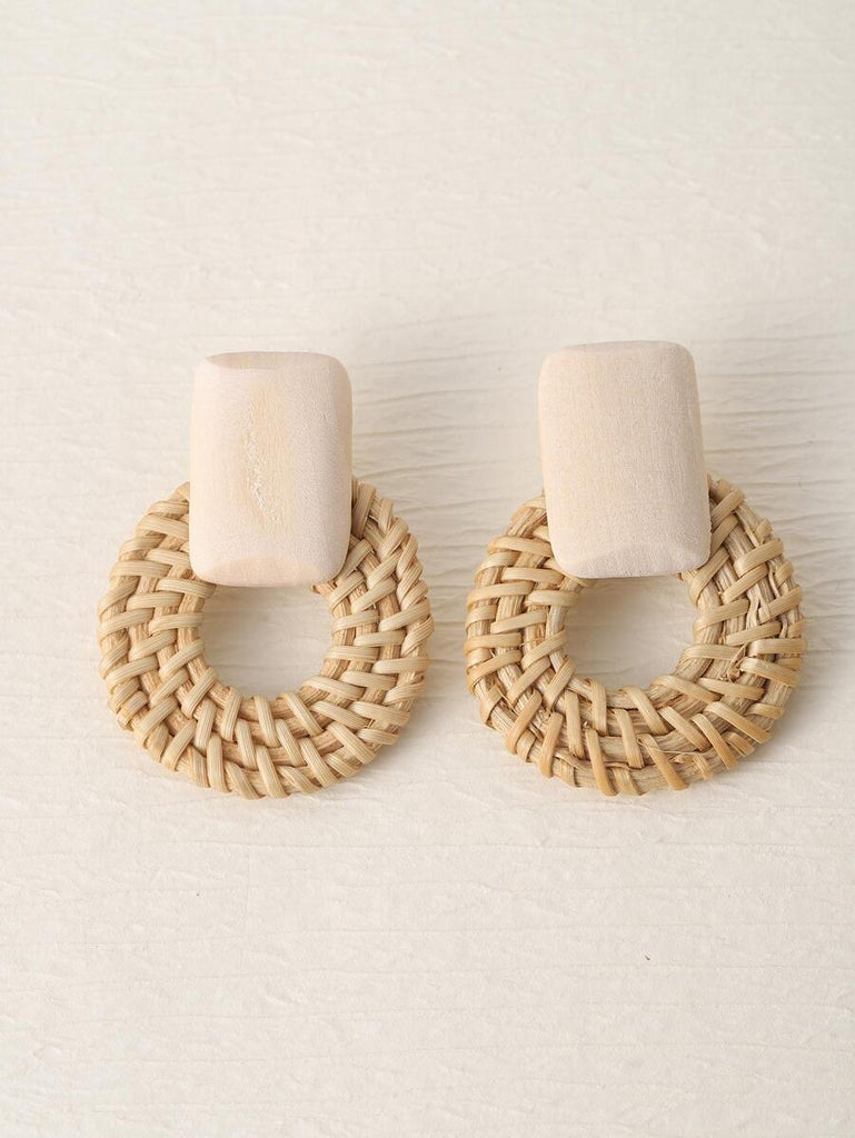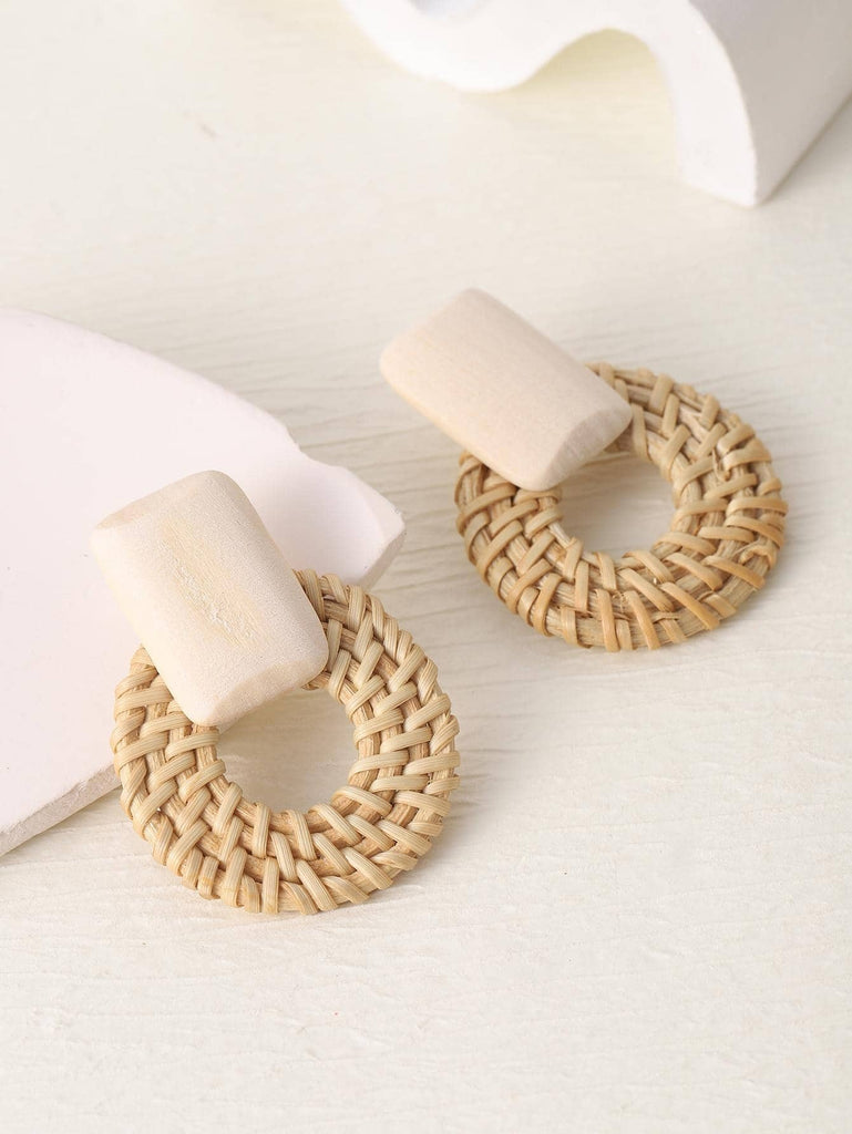 1 Pair Handmade Rattan Woven Hollow Round Earrings With Carved Wooden Decor, Suitable For Vacation, Party And Souvenir, Moss Green