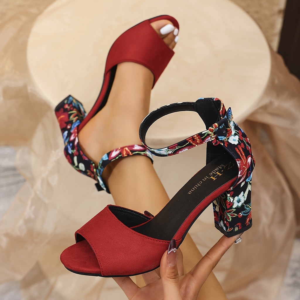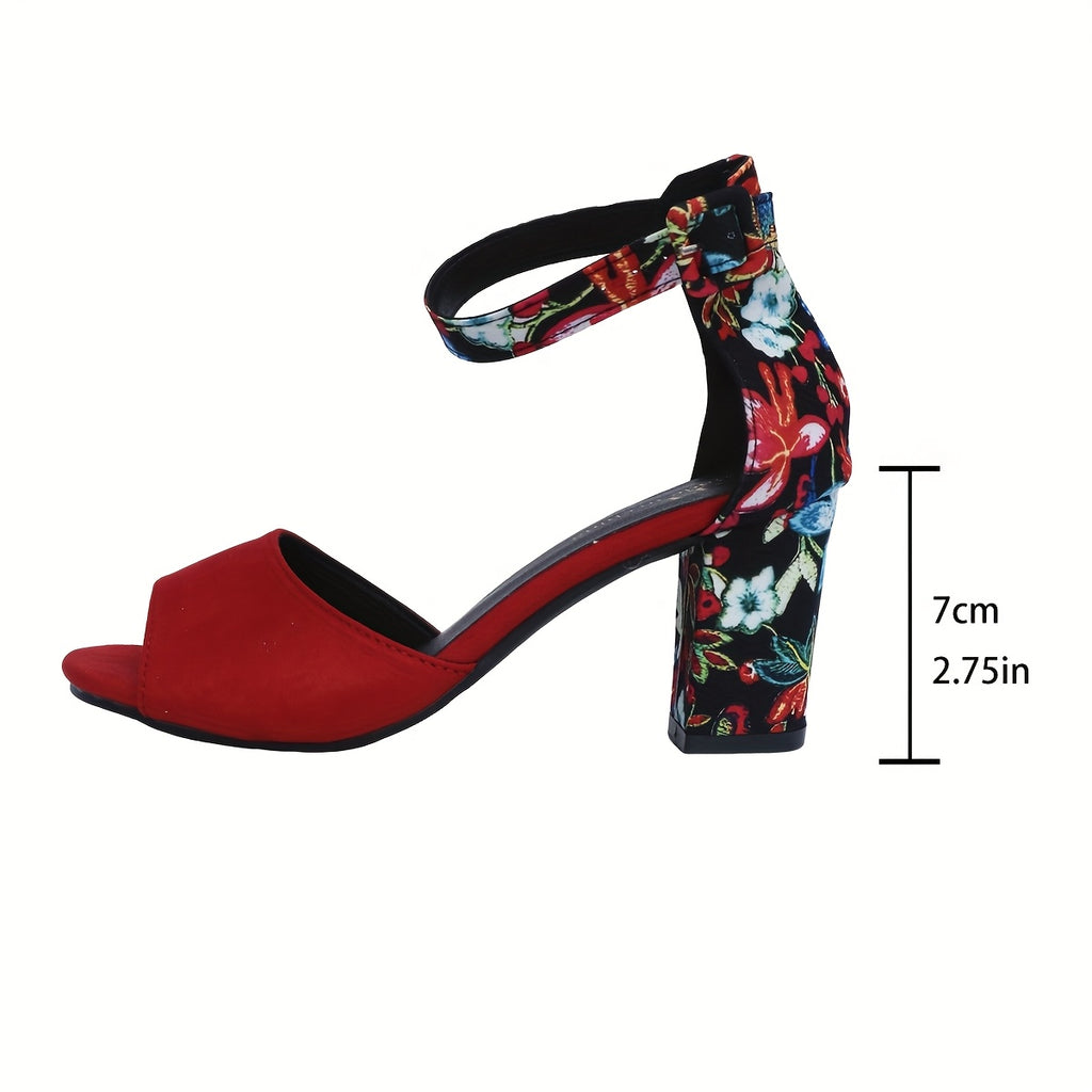 1 Pair Women's Elegant Red Open-Toe High Heel Sandals with Floral Print Ankle Strap – Stylish Summer Casual Shoes for Parties & Events, Chic Outdoor Wear|Stylish High Heels|Polyaniline Comfort, Dressy Shoes