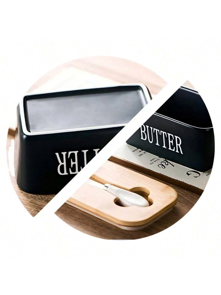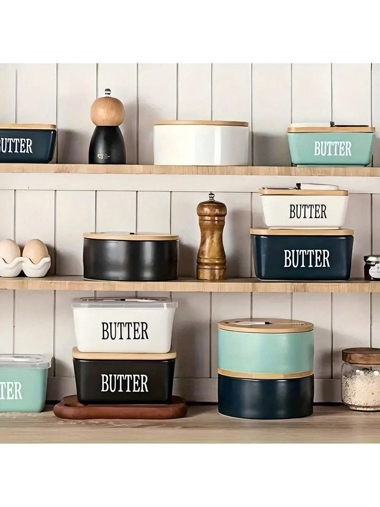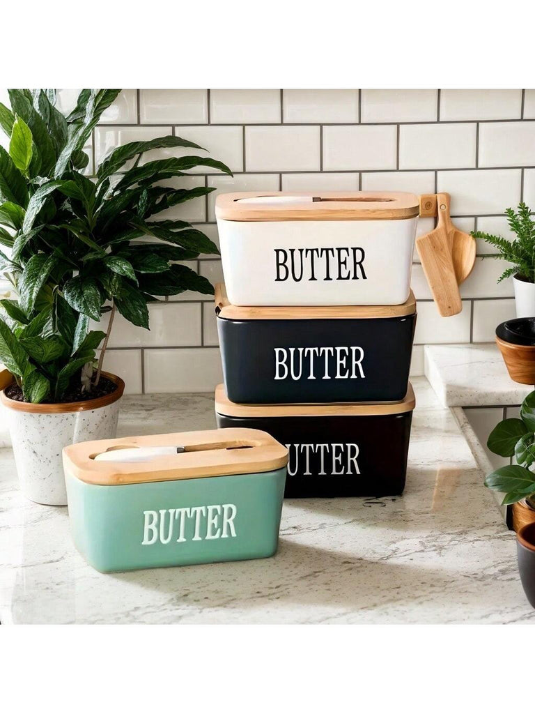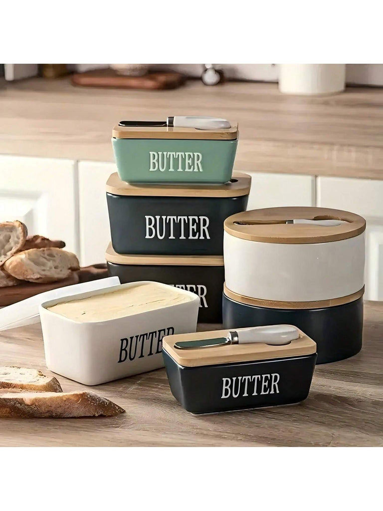 1 Piece 350 Ml / 11.83 Oz With Lid Ceramic Butter Plate And Knife, Available In White / Green / Black/Dark Blue, High-Sealing Cheese / Ceramic Butter Container, Elegant Ceramic Butter Jar, Table Butter Storage Box, With Double Silicone Sealing Ring
