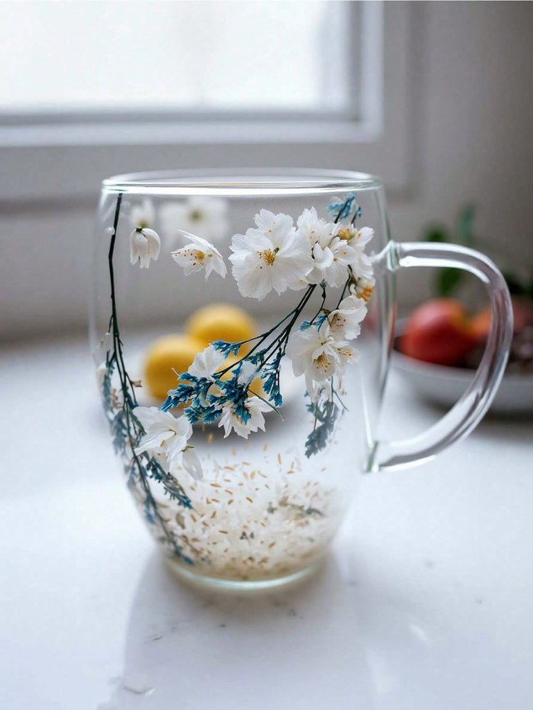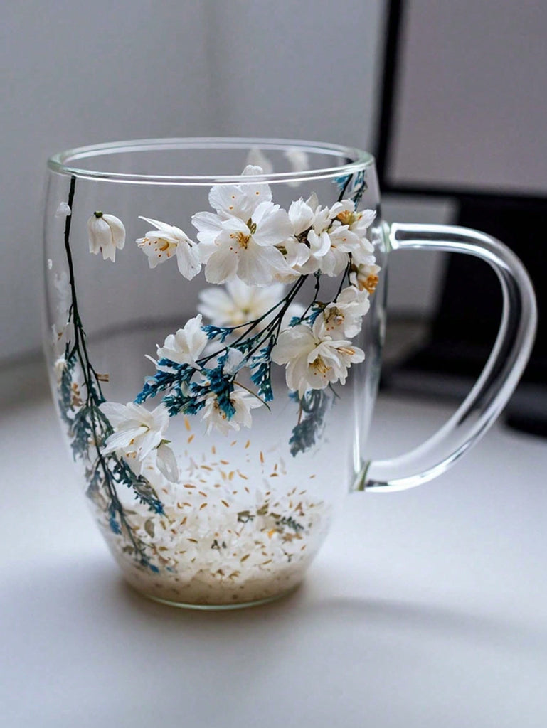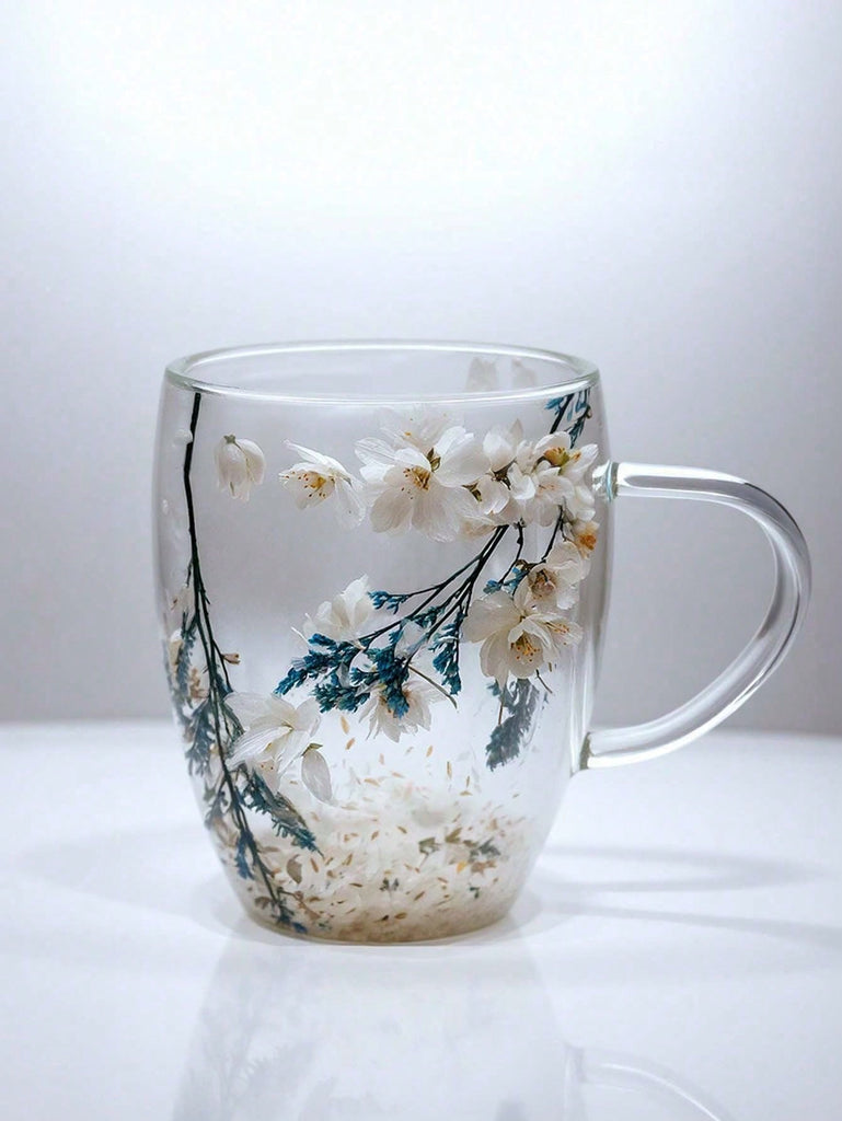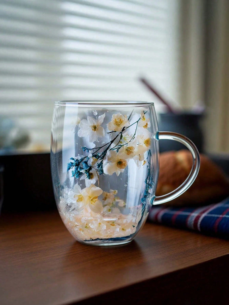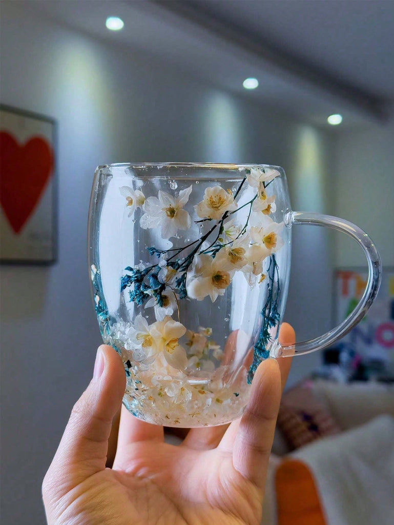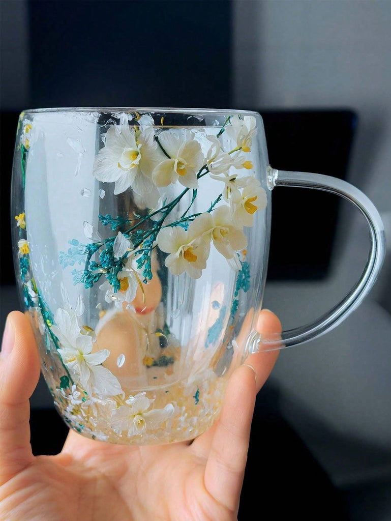 1 Piece Dried Flower Double Glass Coffee Cup 11.83oz - Perfect For Hot & Cold Drinks, Milk Cup With Dried Flower Design, Double Glass With Handle, Heat-Resistant Cold Drink, Perfect For Small Juice & Tea, Drink Experience, Ideal Birthday Gift
