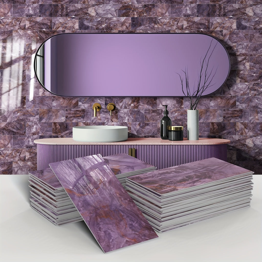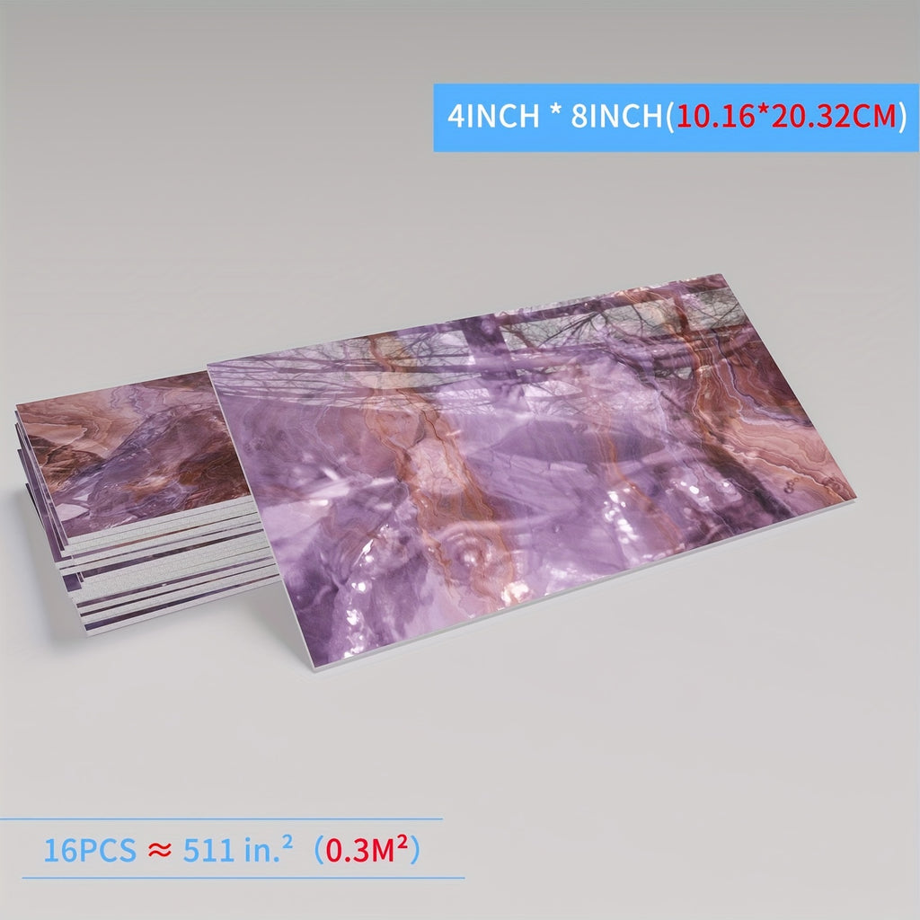 16/32/64pcs Self-Adhesive Faux Purple Marble Vinyl Tiles for Wall Decor - Waterproof & Moisture-Resistant Stick-on Backsplash Stickers for Kitchen, Bathroom, Laundry Room, RV & Fireplace Decorative Tiles in Portrait 10.16*20.32 cm
