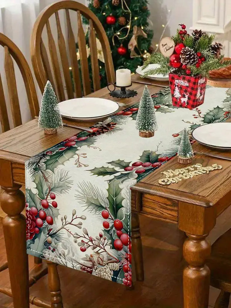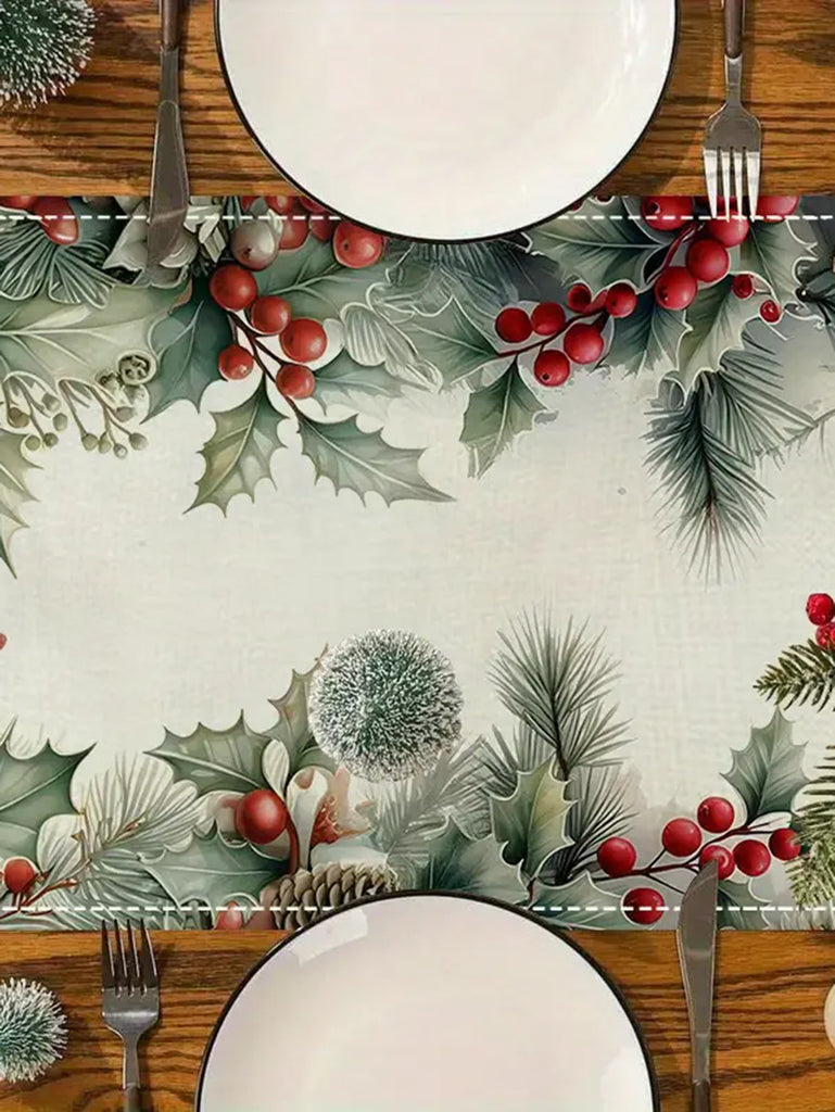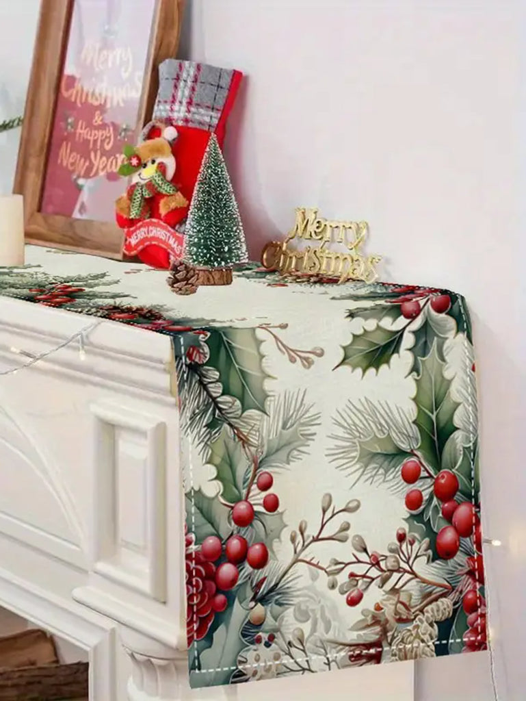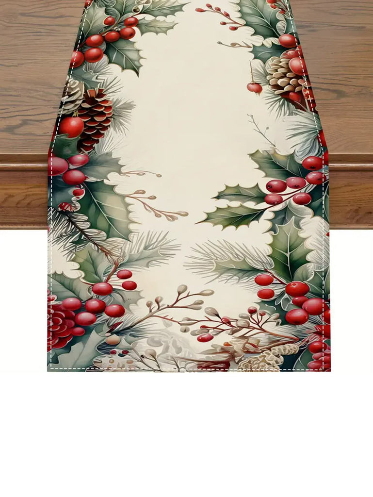 1pc, Christmas Holly Berry Table Runner, Durable Polyester Fabric, 13x35.4/47.2/63/72/78.7 Inches Available-Rectangular Holiday Table, Red Berries & Green Leaves Design, For Christmas & New Year Celebration, Home Kitchen Party Decor