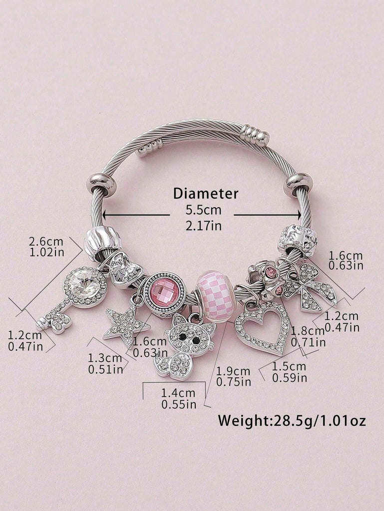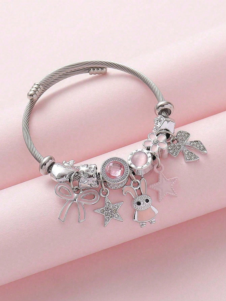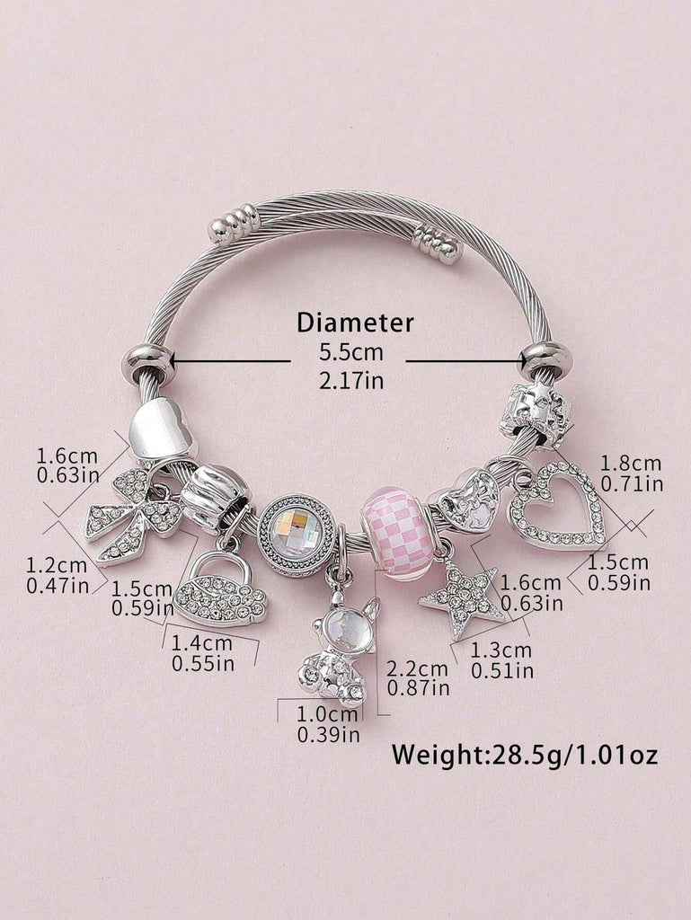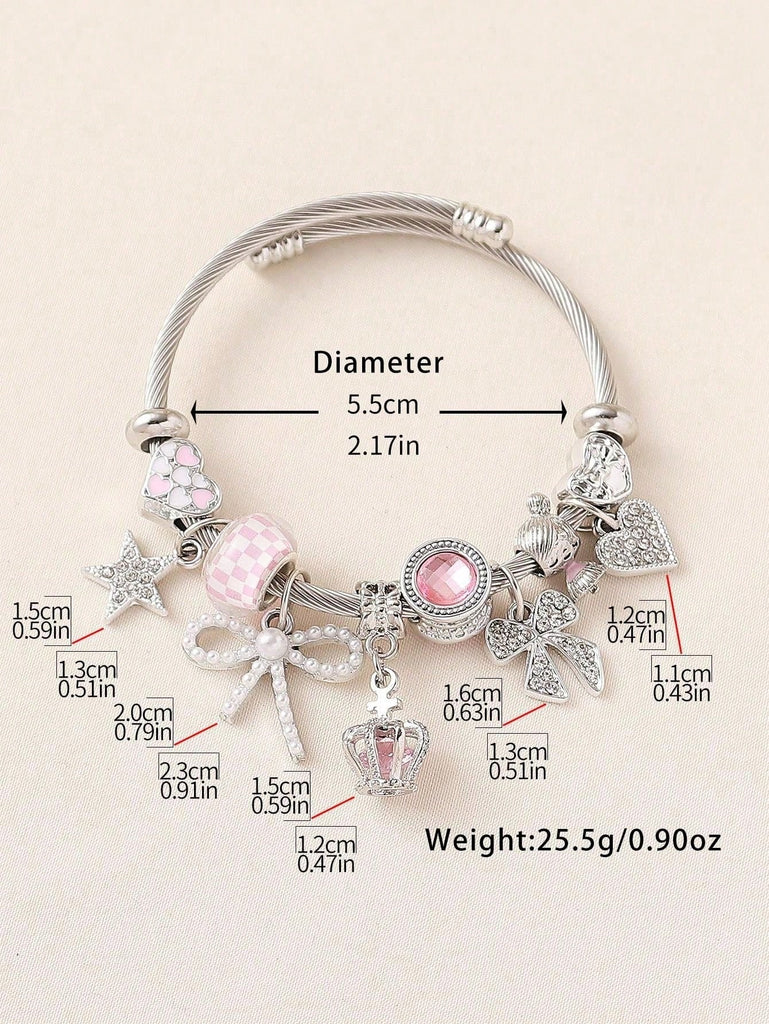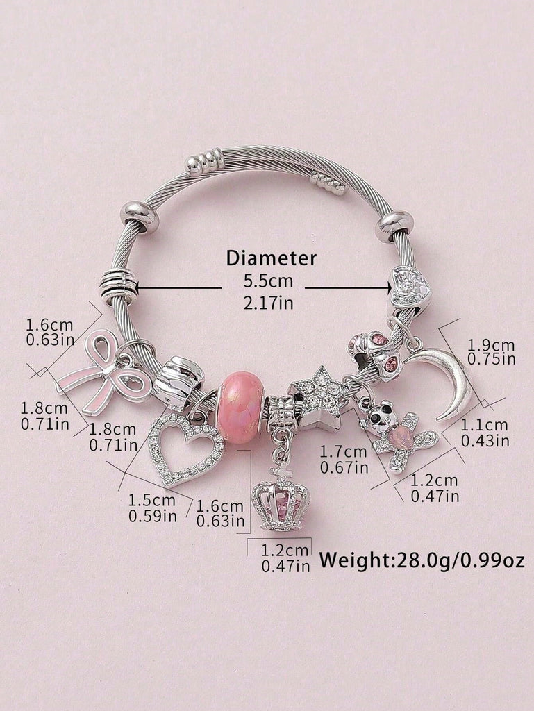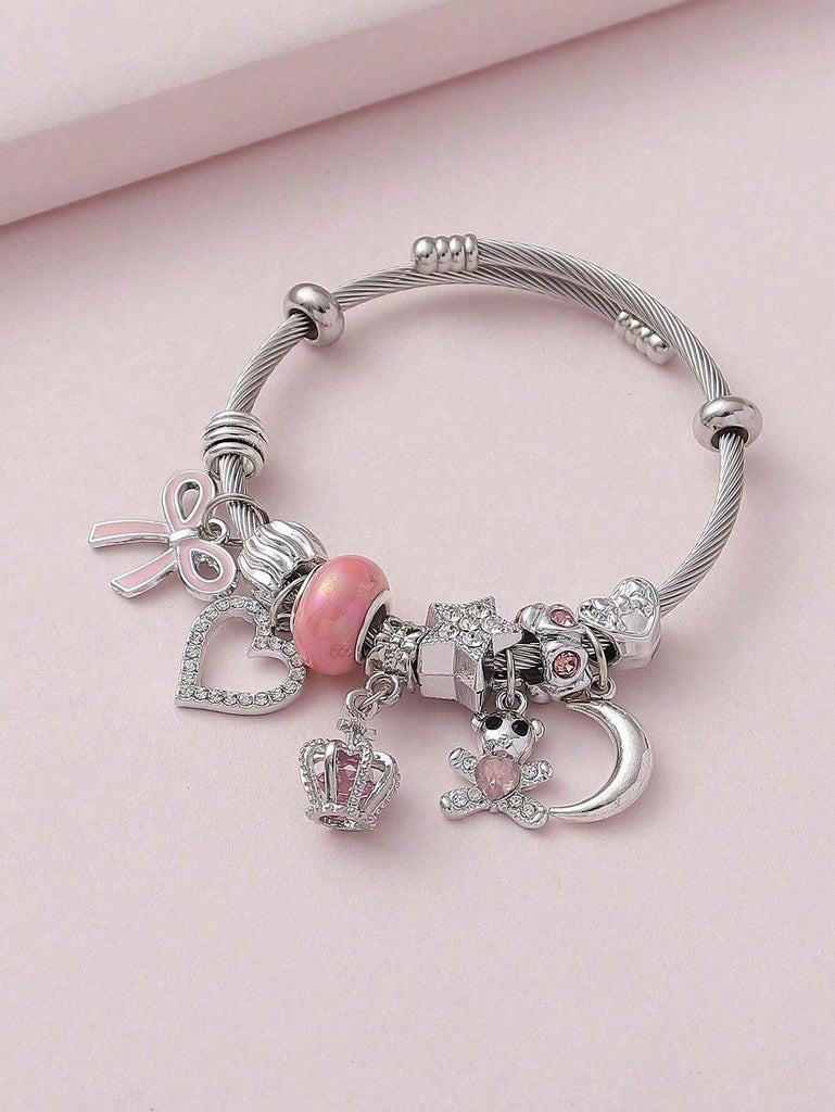 1pc Elegant And Luxurious Crown Teddy Bear, Peace Sign, Bowknot, Moon And Heart Shaped Stainless Steel Charm Bracelet With Rhinestone Encrusted Beads And Multiple Charms For DIY, Adjustable And Suitable For Girls To Wear On Daily, Party And Festival Occas