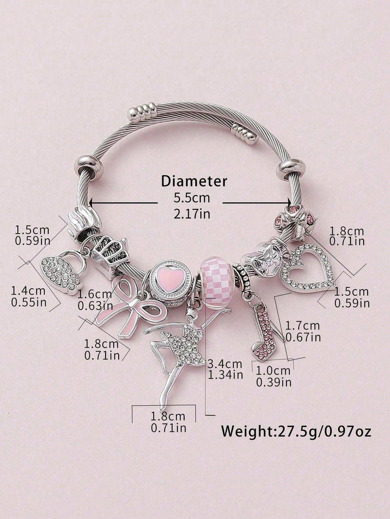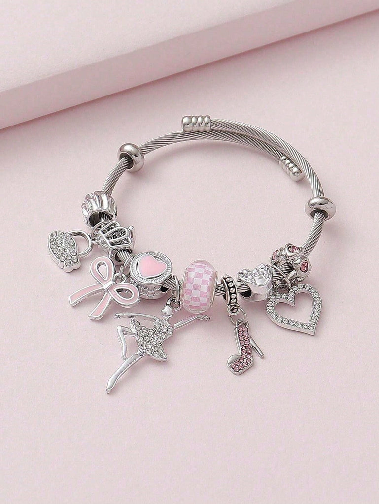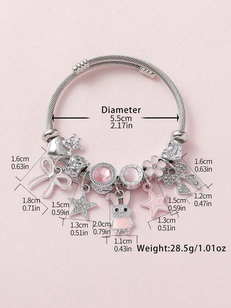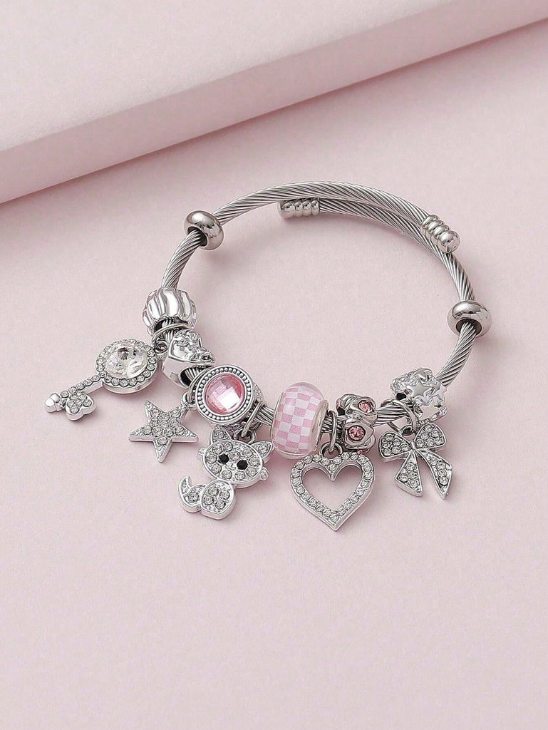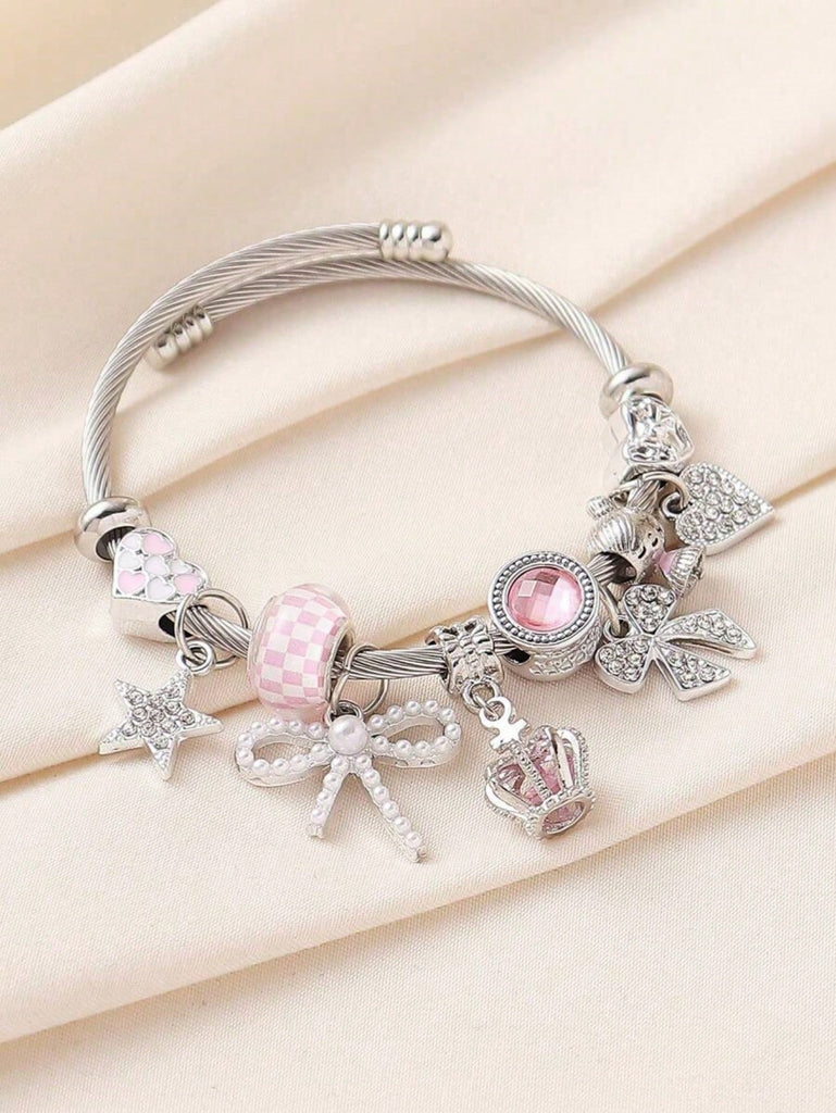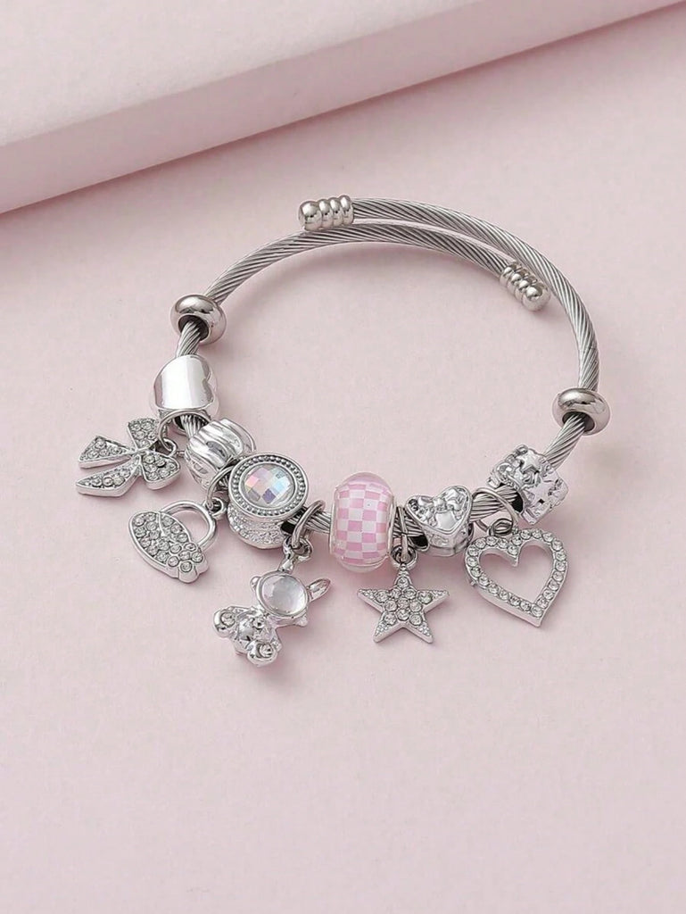 1pc Elegant And Luxurious Crown Teddy Bear, Peace Sign, Bowknot, Moon And Heart Shaped Stainless Steel Charm Bracelet With Rhinestone Encrusted Beads And Multiple Charms For DIY, Adjustable And Suitable For Girls To Wear On Daily, Party And Festival Occas
