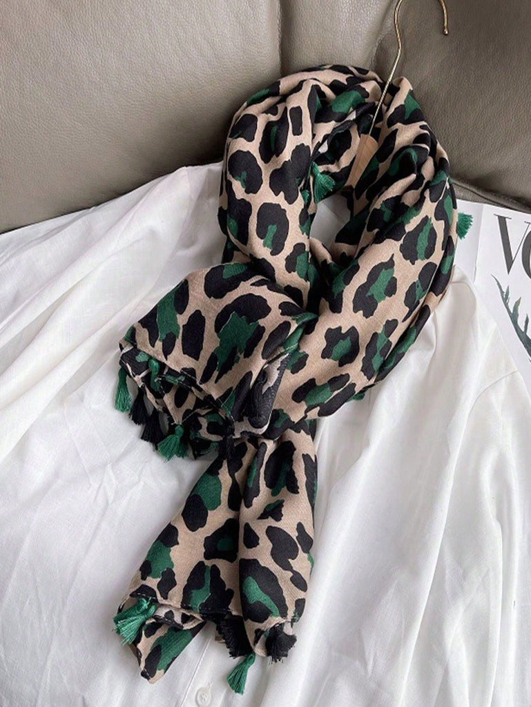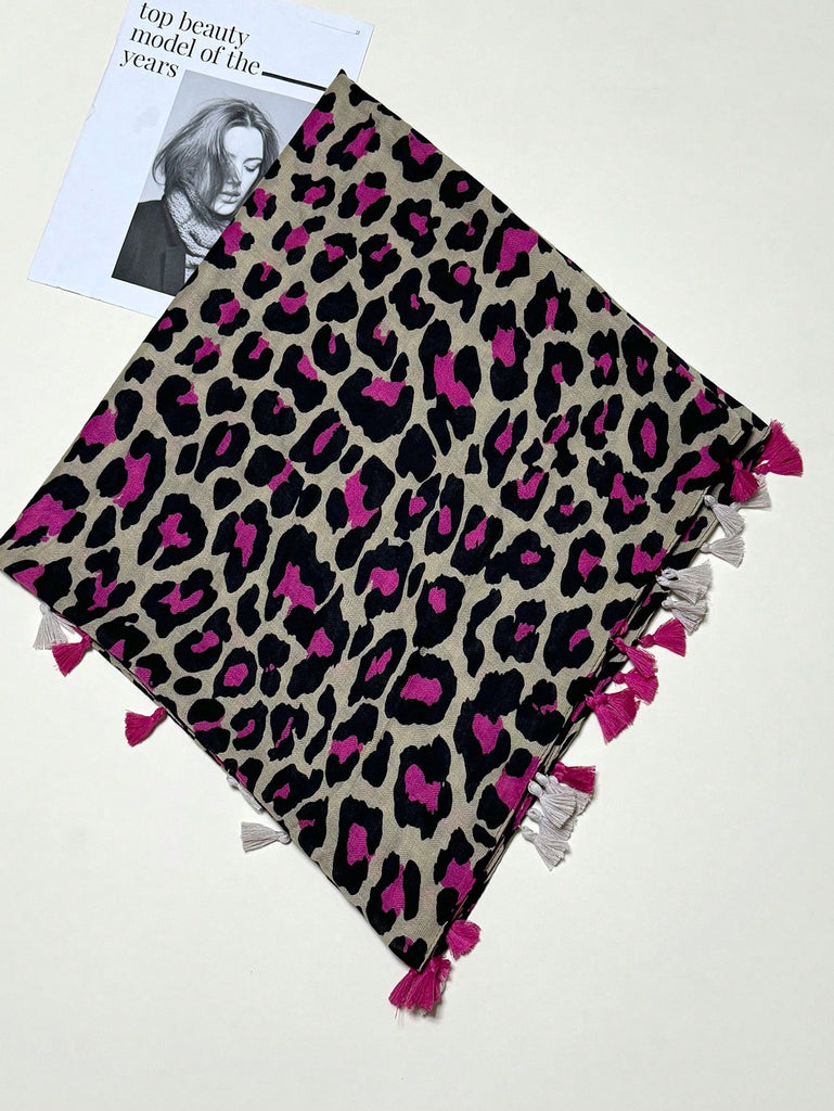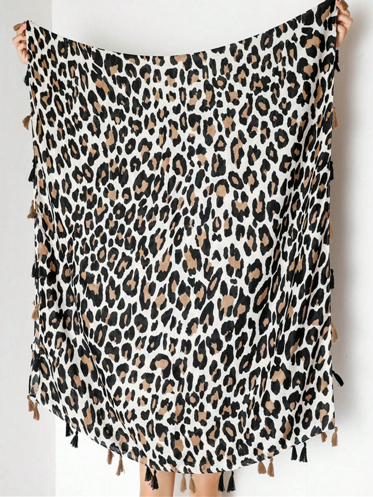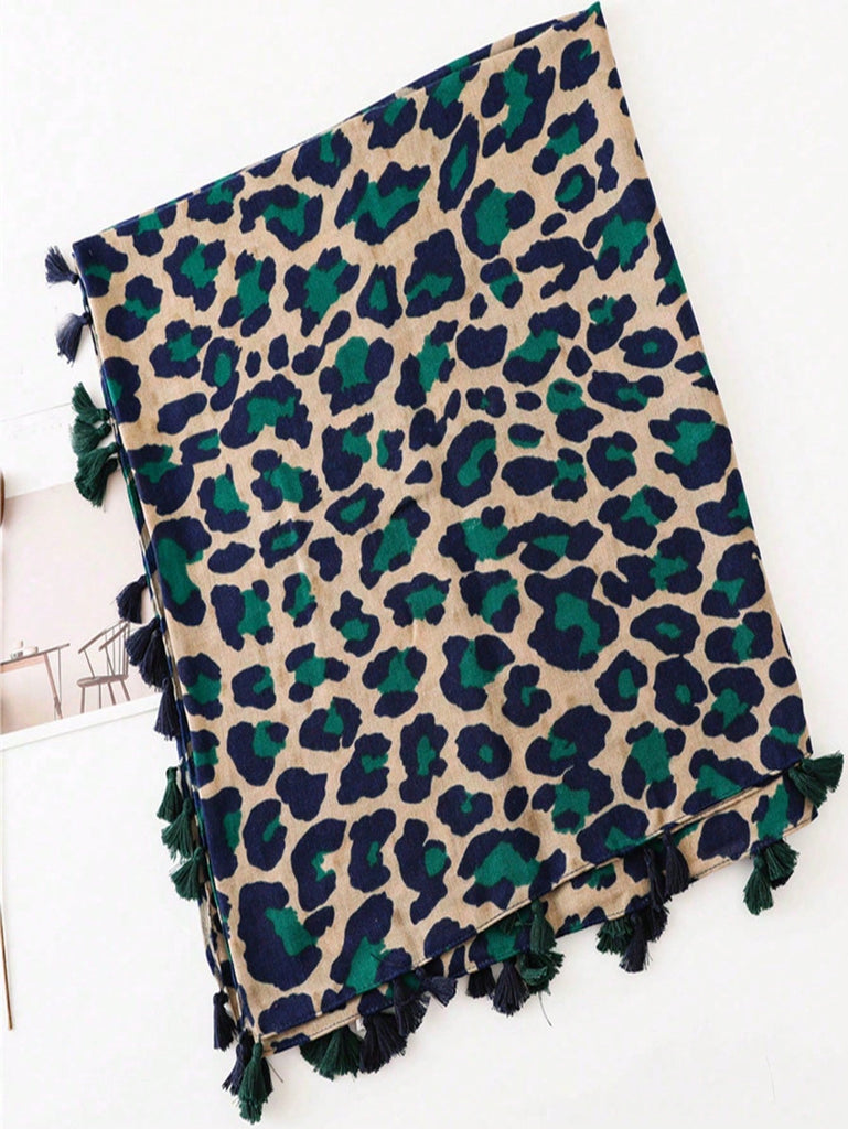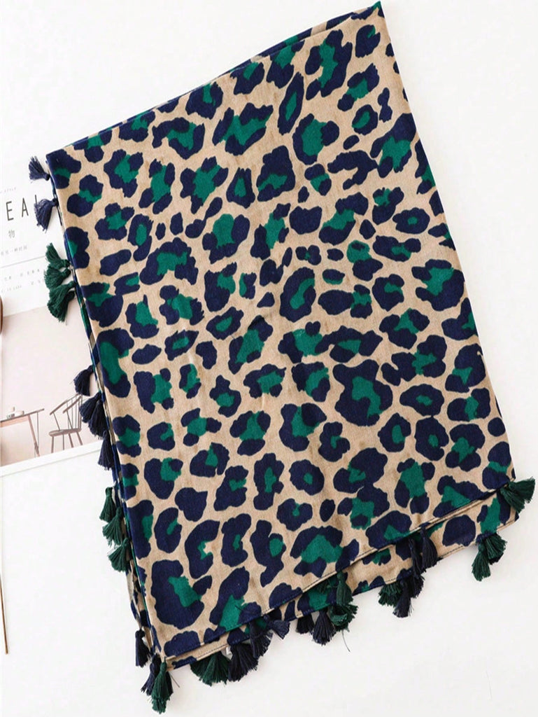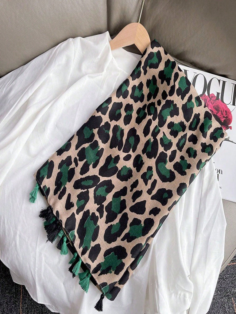 1pc Leopard Print Scarf, Fashion Women Silk Scarf With Tassels, Versatile Shawl For Sun Protection Accessories Women