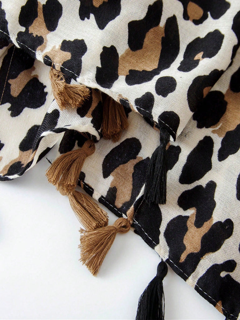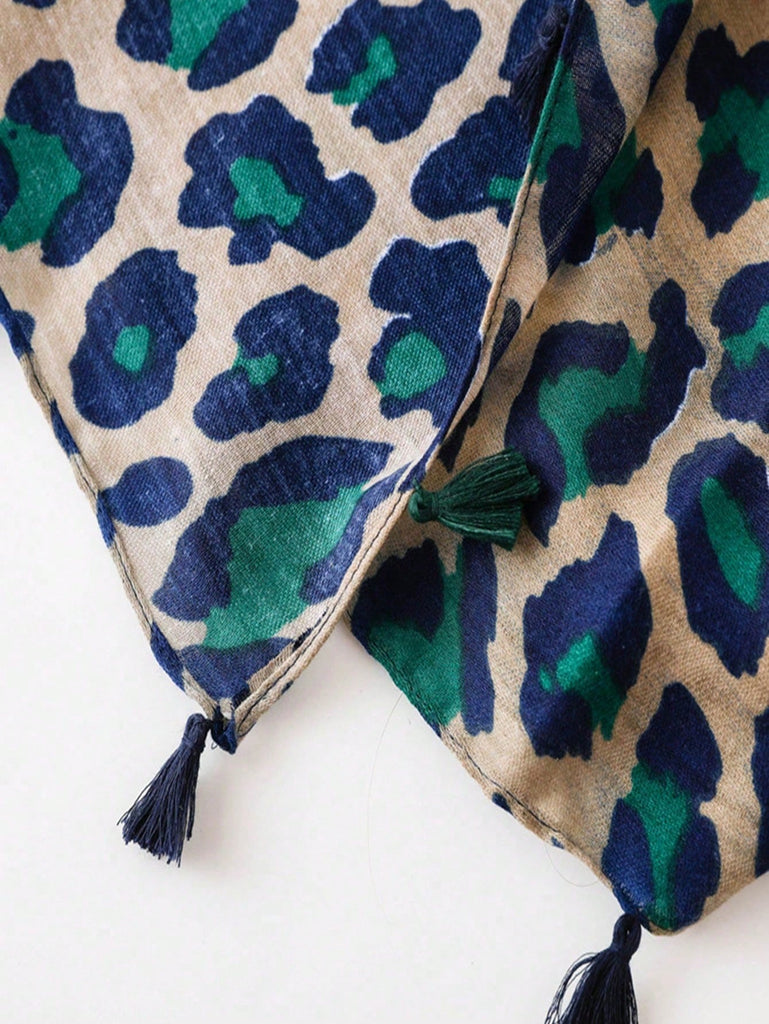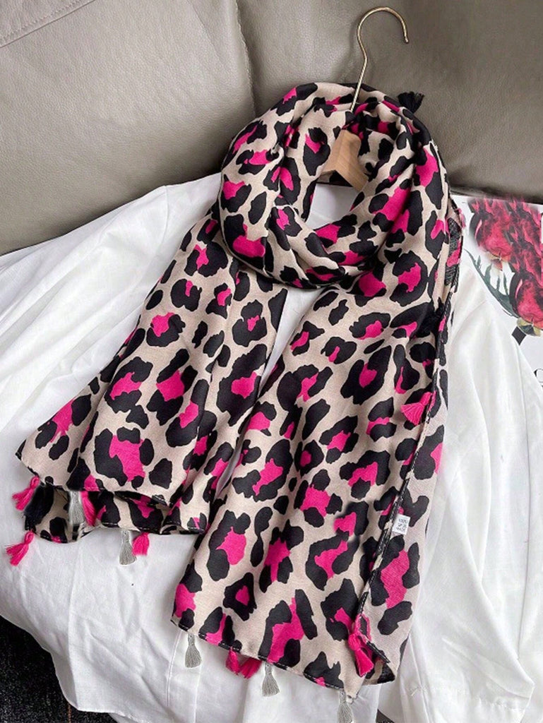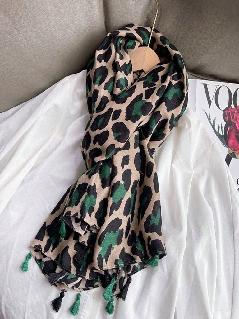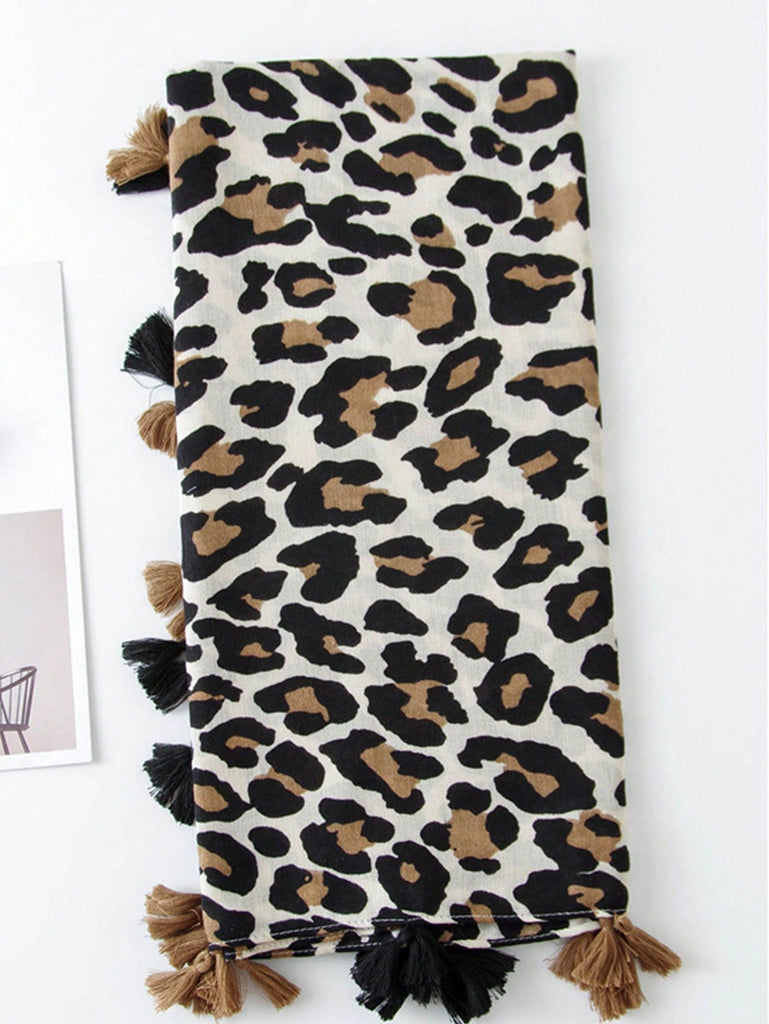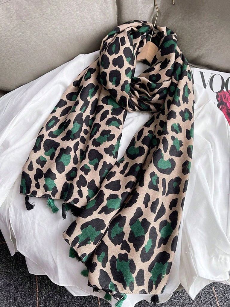 1pc Leopard Print Scarf, Fashion Women Silk Scarf With Tassels, Versatile Shawl For Sun Protection Accessories Women