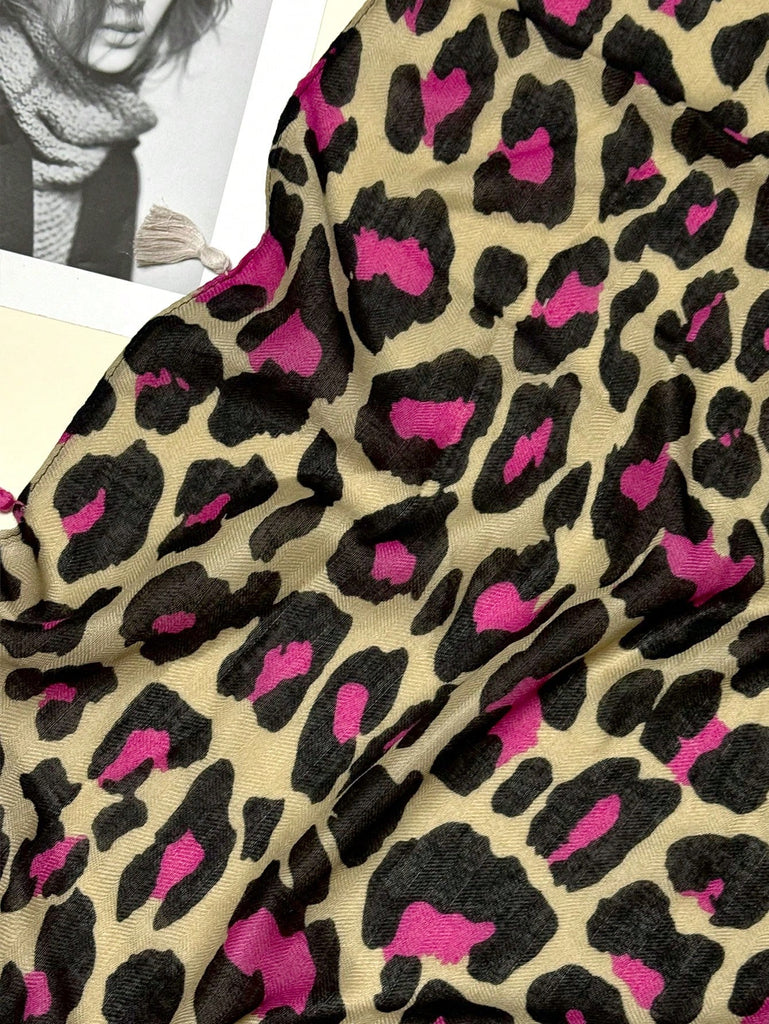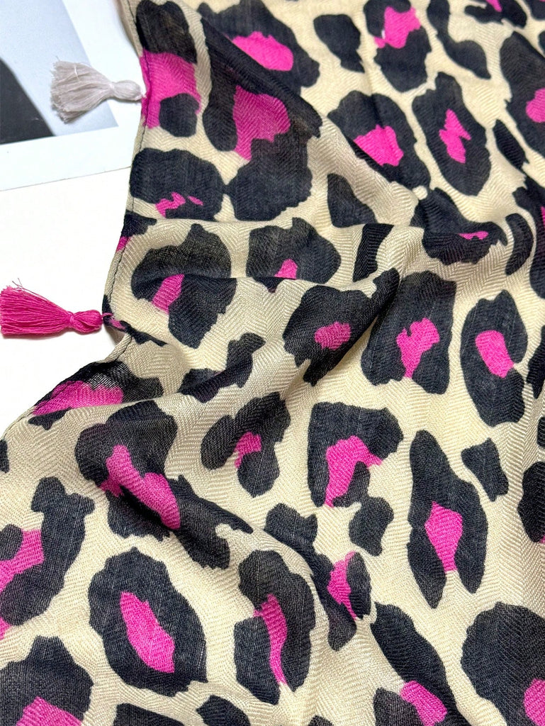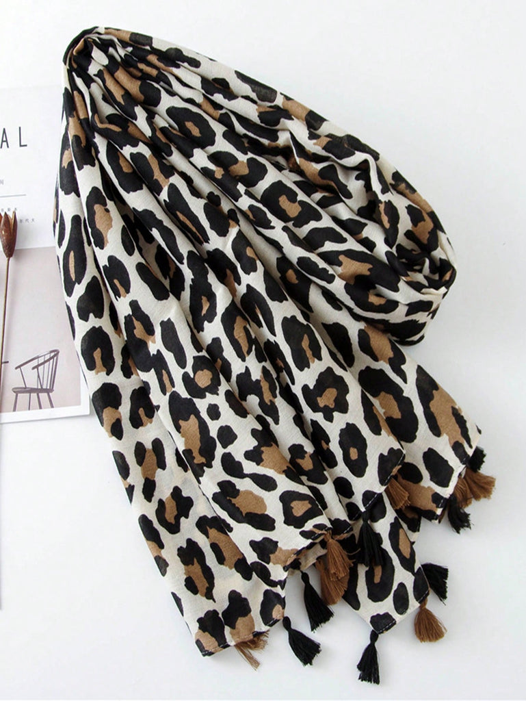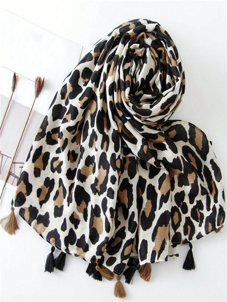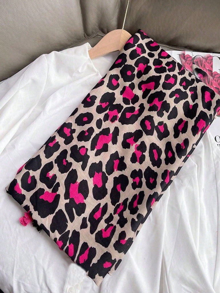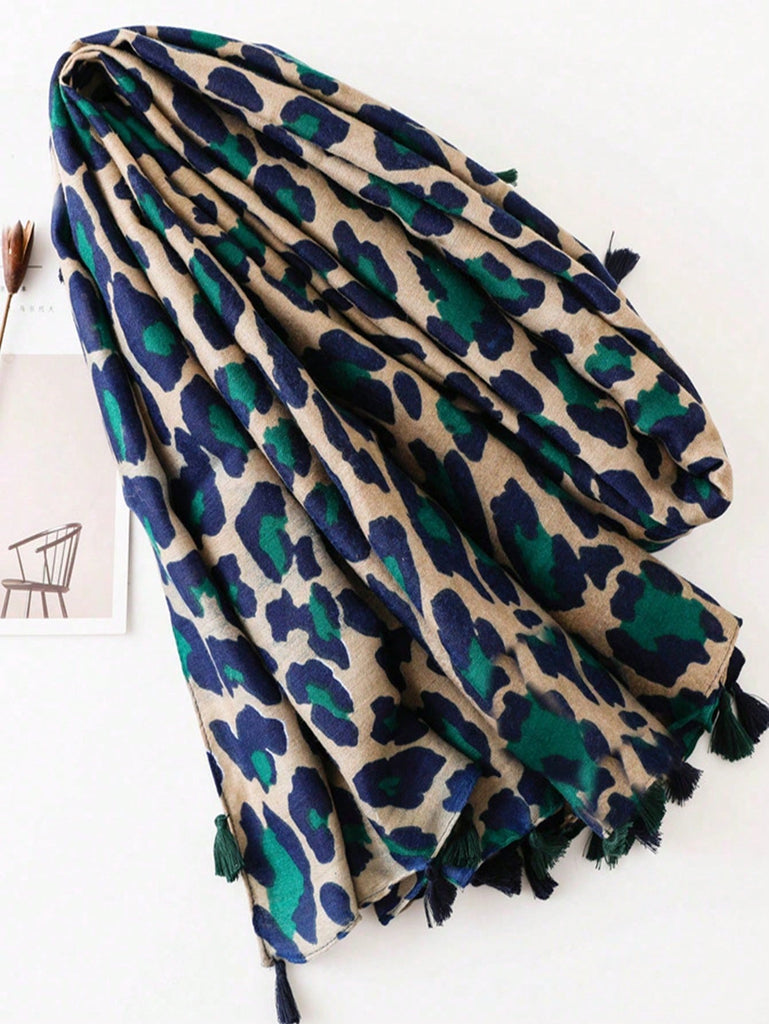 1pc Leopard Print Scarf, Fashion Women Silk Scarf With Tassels, Versatile Shawl For Sun Protection Accessories Women
