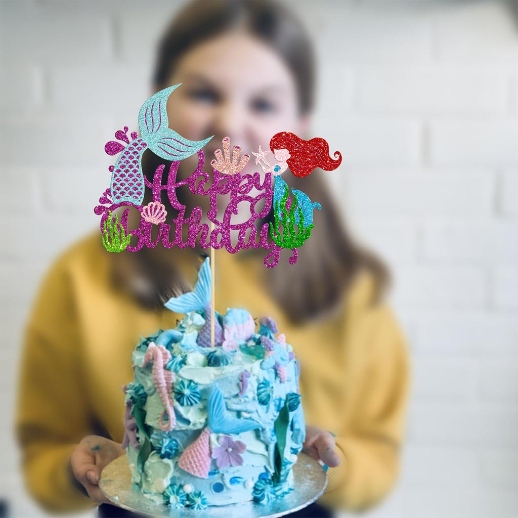 1pc Mermaid Happy Birthday Cake Topper Glitter Mermaid Cake Pick Seashells Coral Mermaid Tail Cake Decoration for Under the Sea Baby Shower Birthday Party Supplies Purpl