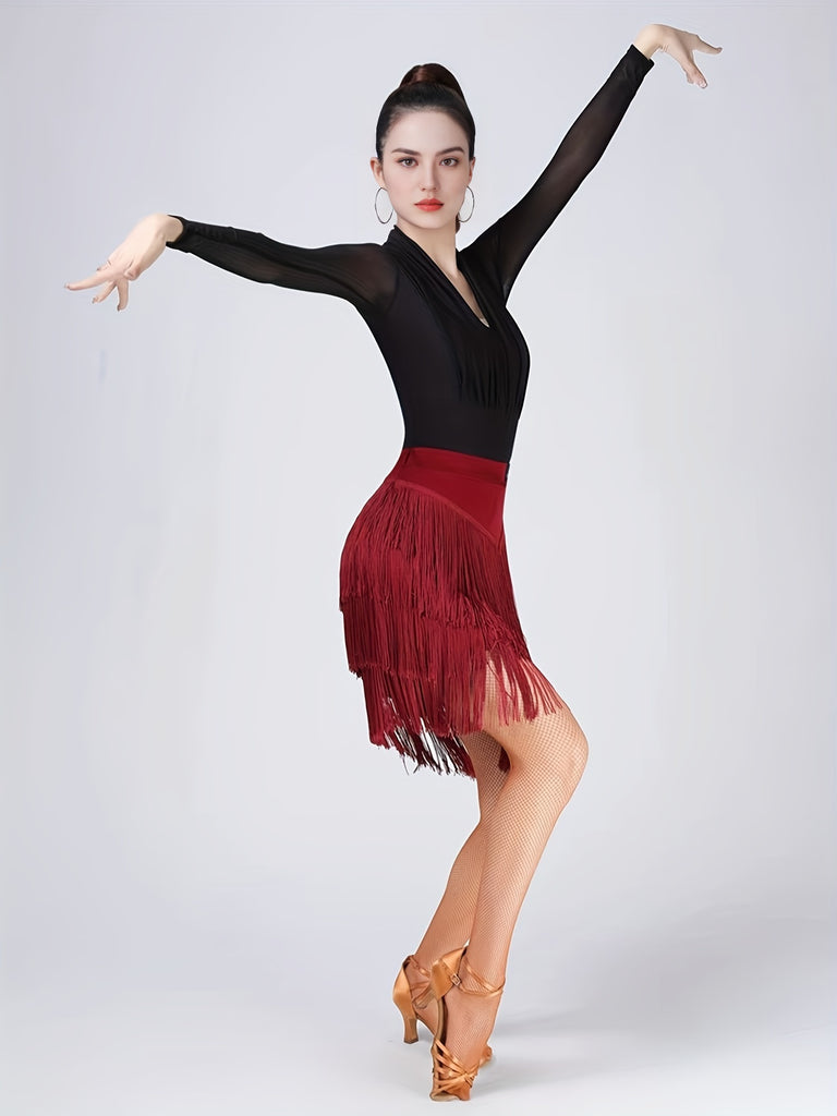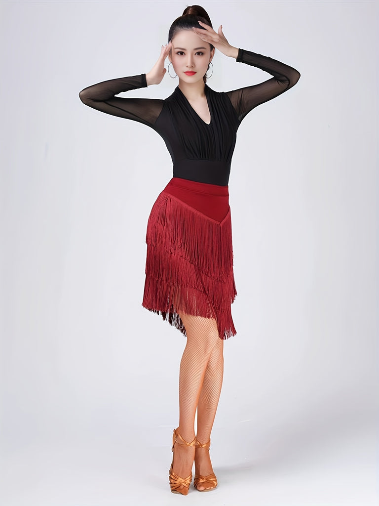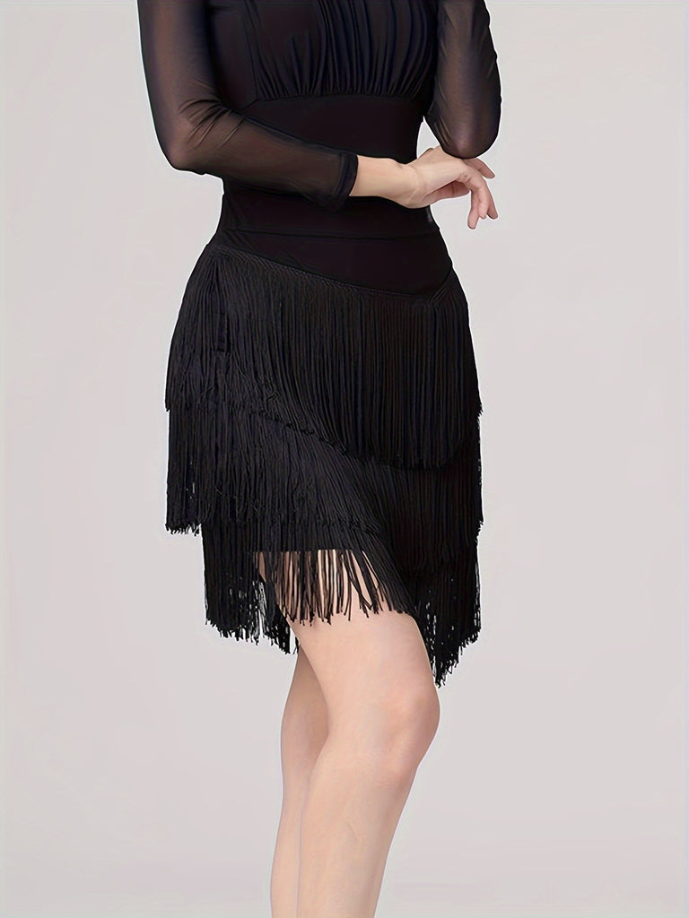 1pc Sexy Tassel Flare Skirt for Women, Polyester Knit with Spandex Lining, All-Season Hip-Wrap Latin Dance Dress, Versatile for Ballroom, Salsa, Tango, Concert & Stage Costume