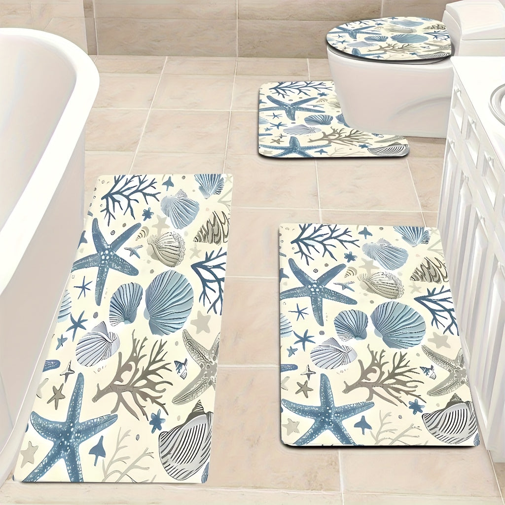 3pcs/4pcs bathroom mat set with blue starfish and seashell patterns, toilet seat cover, U-shaped foot mat, made of flannel, machine washable, suitable for bathroom decoration - can be used as a gift for graduation season or Halloween