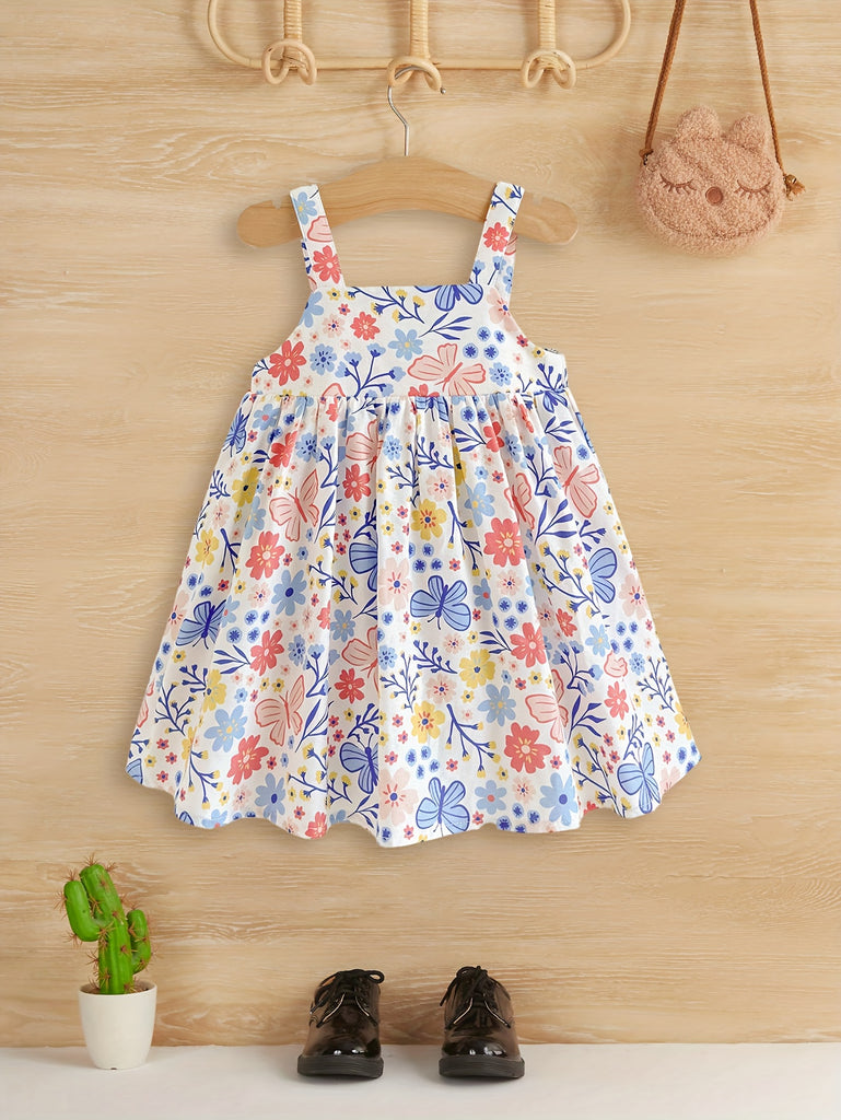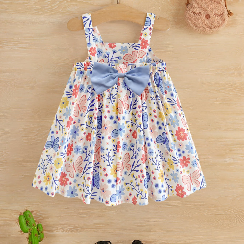 Girls' Floral Print Sleeveless Dress with Bow Detail - Knee-Length Summer Dress, Lightweight Non-Stretch Fabric, Vibrant Blue & Pink Flowers, Perfect for Outdoor Play & Casual Attire, Baby Girl Dress, Playful Babywear, Decorative Bow Detail, Comfortable
